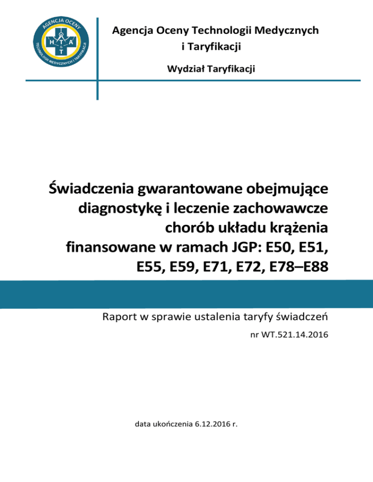 Agencja Oceny Technologii Medycznych i Taryfikacji Wydział Taryfikacji Świadczenia gwarantowane obejmujące diagnostykę i leczenie zachowawcze chorób układu krążenia finansowane w ramach JGP: E50, E51, E55, E59, E71, E72, E78–E88 Raport w sprawie ustalenia taryfy świadczeń nr WT.521.14.2016 data ukończenia 6.12.2016 r. Diagnostyka i leczenie zachowawcze chorób układu krążenia WT.521.14.2016 Objaśnienia skróceń Agencja/AOTMiT Agencja Oceny Technologii Medycznych i Taryfikacji bd. brak danych CPL względne poziomy cen (ang. comparative price levels) ICD-9 PL międzynarodowa klasyfikacja procedur medycznych – wersja polska (ang. International Classification System for Surgical, Diagnostic and Therapeutic Procedures) ICD-10 międzynarodowa statystyczna klasyfikacja chorób i problemów zdrowotnych (ang. International Statistical Classification of Diseases and Related Health Problems) IZW infekcyjne zapalenie wsierdzia JGP jednorodne grupy pacjentów MZ Ministerstwo Zdrowia nd. nie dotyczy NT nadciśnienie tętnicze NFZ/Płatnik Narodowy Fundusz Zdrowia NZK nagłe zatrzymanie krążenia OECD Organizacja Współpracy Gospodarczej i Rozwoju (ang. Organization for Economic Co-operation and Development) OINK Oddział Intensywnego Nadzoru Kardiologicznego ONS ostra niewydolność serca PKB produkt krajowy brutto PL produkt leczniczy PNS przewlekła niewydolność serca PPP parytet siły nabywczej (ang. purchasing power parity) T-LOC przejściowa utrata przytomności Ustawa o świadczeniach Ustawa z dnia 27 sierpnia 2004 r. o świadczeniach opieki zdrowotnej finansowanych ze środków publicznych (Dz.U. z 2016 r., poz. 1793 z późn. zm.) WHO Światowa Organizacja Zdrowia (ang. World Health Organization) WM wyrób medyczny ZP zatorowość płucna ZŻG zakrzepica żył głębokich ŻChZZ żylna choroba zakrzepowo-zatorowa Raport w sprawie ustalenia taryfy świadczeń Agencji Oceny Technologii Medycznych i Taryfikacji 2/79 Diagnostyka i leczenie zachowawcze chorób układu krążenia WT.521.14.2016 Spis treści 1. Problem decyzyjny ................................................................................................................ 4 2. Taryfikowane świadczenie..................................................................................................... 9 2.1. 3. 4. Charakterystyka świadczenia .................................................................................................. 9 2.1.1. Problem zdrowotny ......................................................................................................... 9 2.1.2. Opis procedury .............................................................................................................. 26 2.2. Aktualny stan finansowania w Polsce ................................................................................... 27 2.3. Analiza popytu i podaży......................................................................................................... 30 2.4. Stan finansowania w innych krajach ..................................................................................... 47 2.5. Cenniki komercyjne ............................................................................................................... 57 Projekt taryfy ...................................................................................................................... 58 3.1. Pozyskanie danych................................................................................................................. 58 3.2. Analiza danych ....................................................................................................................... 62 3.3. Projekt taryfy ......................................................................................................................... 70 Analiza wpływu na system opieki zdrowotnej ...................................................................... 71 4.1. Analiza wpływu na budżet płatnika publicznego .................................................................. 71 4.2. Analiza wpływu na organizację systemu opieki zdrowotnej ................................................. 72 5. Najważniejsze informacje i wnioski...................................................................................... 73 6. Bibliografia ......................................................................................................................... 76 7. Spis tabel i rysunków .......................................................................................................... 77 8. Załączniki ............................................................................................................................ 79 Raport w sprawie ustalenia taryfy świadczeń Agencji Oceny Technologii Medycznych i Taryfikacji 3/79 Diagnostyka i leczenie zachowawcze chorób układu krążenia WT.521.14.2016 1. Problem decyzyjny Celem niniejszego raportu jest dokumentacja procesu przygotowania projektu taryfy świadczenia gwarantowanego opieki zdrowotnej, w oparciu o przyjętą metodykę taryfikacji świadczeń. Podstawę podjęcia przedmiotowych prac stanowi: Plan Taryfikacji na rok 2016 zatwierdzony przez Ministra Zdrowia 21 lipca 2015 r., w punkcie: I. Leczenie szpitalne, 1. Świadczenia wymienione w załączniku nr 1 do rozporządzenia Ministra Zdrowia z dnia 22 listopada 2013 roku w sprawie świadczeń gwarantowanych z zakresu leczenia szpitalnego w obszarach: 1a. Choroby układu krążenia. Przedmiotem raportu są: świadczenia gwarantowane z zakresu leczenia szpitalnego, scharakteryzowane następującymi procedurami medycznymi (kod ICD-9) i rozpoznaniami (kod ICD-10): ICD-10 B37.6 Zapalenie wsierdzia wywołane przez Candida (I39.8*) C38.0 Nowotwór złośliwy (serce) D15.1 Nowotwór niezłośliwy (serce) I01.0 Ostre reumatyczne zapalenie osierdzia I01.2 Ostre reumatyczne zapalenie mięśnia serca I01.8 Inne ostre choroby reumatyczne serca I01.9 Ostra choroba reuma