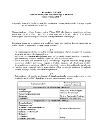 Uchwała nr 269/2015 Senatu Uniwersytetu Przyrodniczego w Poznaniu z dnia 27 maja 2015 r. w sprawie: warunków i trybu rekrutacji na stacjonarne i niestacjonarne studia drugiego stopnia na rok akademicki 2016/2017 Na podstawie art. 169 ust. 2 ustawy z dnia 27 lipca 2005 roku Prawo o szkolnictwie wyższym (tekst jedn. Dz. U. z 2012 r., poz. 572, z późn. zm.) oraz § 27 ust. 1 pkt 8 i § 62 Statutu Uniwersytetu Przyrodniczego w Poznaniu, Senat postanawia, co następuje: §1 Rekrutacja składa się z postępowania kwalifikacyjnego oraz podjęcia decyzji o przyjęciu na studia. Wyniki postępowania rekrutacyjnego są jawne. §2 1. Na studia drugiego stopnia mogą być przyjęci kandydaci z tytułem zawodowym magistra, licencjata, inżyniera lub równorzędnym. 2. Na kierunek Architektura krajobrazu mogą być przyjęci wyłącznie kandydaci posiadający tytuł zawodowy „inżynier architekt krajobrazu” lub „inżynier architekt”. 3. Studia kończące się nadaniem tytułu zawodowego magistra inżyniera mogą podjąć absolwenci studiów pierwszego stopnia z tytułem inżyniera lub absolwenci studiów licencjackich po uzupełnieniu efektów inżynierskich z zakresu danego kierunku kształcenia. 4. Uczelnia może prowadzić zajęcia uzupełniające efekty kształcenia niezbędne do podjęcia studiów drugiego stopnia, na zasadach odpłatności. §3 1. Rekrutacja na I rok studiów stacjonarnych drugiego stopnia, rozpoczynających się w roku akademickim 2016/2017, będzie prowadzona na następujące kierunki: Wydział prowadzący kierunek i rekrutację rozpoczynające się od semestru zimowego Kierunek studiów Biologia Medycyny Weterynaryjnej Neurobiologia i Nauk o Zwierzętach Turystyka przyrodnicza Nauk o Żywności i Żywieniu Dietetyka Ekonomiczno-Społeczny Ekonomia rozpoczynające się od semestru letniego Biotechnologia* Ekoenergetyka* Informatyka i agroinżynieria* Rolnictwa i Bioinżynierii Inżynieria rolnicza* Ochrona środowiska* Rolnictwo* Leśnictwo Leśny Ochrona przyrody Zootechnika* Inżynieria biotworzyw* Projektowanie mebli* Technologia drewna* Architektura krajobrazu Medycyna roślin* Ogrodnictwo* Analityka żywności* Technologia żywności i żywienie człowieka* Gospodarka przestrzenna Inżynieria środowiska* Medycyny Weterynaryjnej i Nauk o Zwierzętach Technologii Drewna Ogrodnictwa i Architektury Krajobrazu Nauk o Żywności i Żywieniu Melioracji i Inżynierii Środowiska *kierunek kończy się tytułem zawodowym magister inżynier 2. Rekrutacja na I rok studiów niestacjonarnych drugiego stopnia, rozpoczynających się w roku akademickim 2016/2017, będzie prowadzona na następujące kierunki: Wydział prowadzący kierunek i rekrutację rozpoczynające się od semestru zimowego Architektura krajobrazu Ogrodnictwa i Architektury Medycyna roślin* Krajobrazu Ogrodnictwo* Dietetyka Nauk o Żywności i Żywieniu Technologia żywności i żywienie człowieka* Melioracji i Inżynierii Gospodarka przestrzenna Środowiska Inżynieria środowiska* Ekonomiczno-Społeczny Ekonomia rozpoczynające się od semestru letniego Ekoenergetyka* Ochrona środowiska* Rolnictwa i Bioinżynierii Rolnictwo* Inżynieria rolnicza* Leśnictwo Leśny Ochrona przyrody Medycyny Weterynaryjnej Zootechnika* i Nauk o Zwierzętach Technologii Drewna Technologia drewna* Kierunek studiów *kierunek kończy się tytułem zawodowym magister inżynier §4 1. Postępowanie kwalifikacyjne na studia stacjonarne i niestacjonarne odbędzie się na podstawie rankingu wynikającego z podsumowania średniej z ocen kończących przedmioty studiów pierwszego stopnia oraz wyniku ukończenia tych studiów (ocena na dyplomie), przy czym: 1) 75% limitu miejsc wypełnią absolwenci kierunku zgodnego z kierunkiem studiów drugiego stopnia, 2) uzupełnienie limitu następuje na podstawie wyników egzaminu, testu lub rozmowy, weryfikujących efekty kształcenia określone dla danego kierunku studiów I stopnia, 3) kwalifikacja na podstawie wyników egzaminu, testu lub rozmowy może mieć również zastosowanie w przypadku, gdy brak jest absolwentów kierunku zgodnego z kierunkiem studiów drugiego stopnia, 4) dziekan może podjąć decyzję o nieweryfikowaniu efektów kształcenia, w tym jeśli kandydat osiągnął na innym kierunku co najmniej 70% zakładanych efektów kształcenia dla danego kierunku studiów I stopnia. 2. Efekty kształcenia, o których mowa w ust. 1, są określone w uchwale Senatu. W przypadku gdy Uczelnia nie prowadzi studiów I stopnia na danym kierunku, wymagane efekty określa uchwała właściwej rady wydziału. 3. Rada wydziału może określić kierunki studiów, których ukończenie uprawnia kandydata do podjęcia studiów II stopnia w trybie, o którym mowa w ust. 1 pkt 4. 4. Uchwały w sprawach, o których mowa w ust. 2 i ust. 3, podaje się do wiadomości publicznej na stronie internetowej wydziału nie później niż 8 miesięcy przed terminem rejestracji kandydatów. 5. Kwalifikacja na specjalność i/lub specjalizację magisterską następuje po zakończeniu postępowania rekrutacyjnego, w oparciu o wyniki postępowania kwalifikacyjnego oraz udokumentowane zainteresowania kandydata. §5 1. Rekrutacja na studia stacjonarne drugiego stopnia z angielskim językiem wykładowym będzie prowadzona na kierunki: Ekonomia, Inżynieria środowiska, Leśnictwo, Ogrodnictwo, Technologia żywności i żywienie człowieka oraz Zootechnika. 2. Wstęp na studia, o których mowa w ust. 1 jest wolny, z uwzględnieniem §§ 2 i 4. §6 1. Rejestracja kandydatów na studia odbywa się drogą elektroniczną, w terminie od 1 czerwca do 20 września 2016 roku dla kierunków rozpoczynających się od semestru zimowego, a od 10 stycznia do 22 lutego 2017 r. dla kierunków rozpoczynających się od semestru letniego. 2. Szczegółowy terminarz przebiegu rekrutacji ustala Rektor, po zaopiniowaniu przez Rektorską Radę Dydaktyczną, w terminie do dnia 30 kwietnia 2016 roku. 3. Kandydat zobowiązany jest 