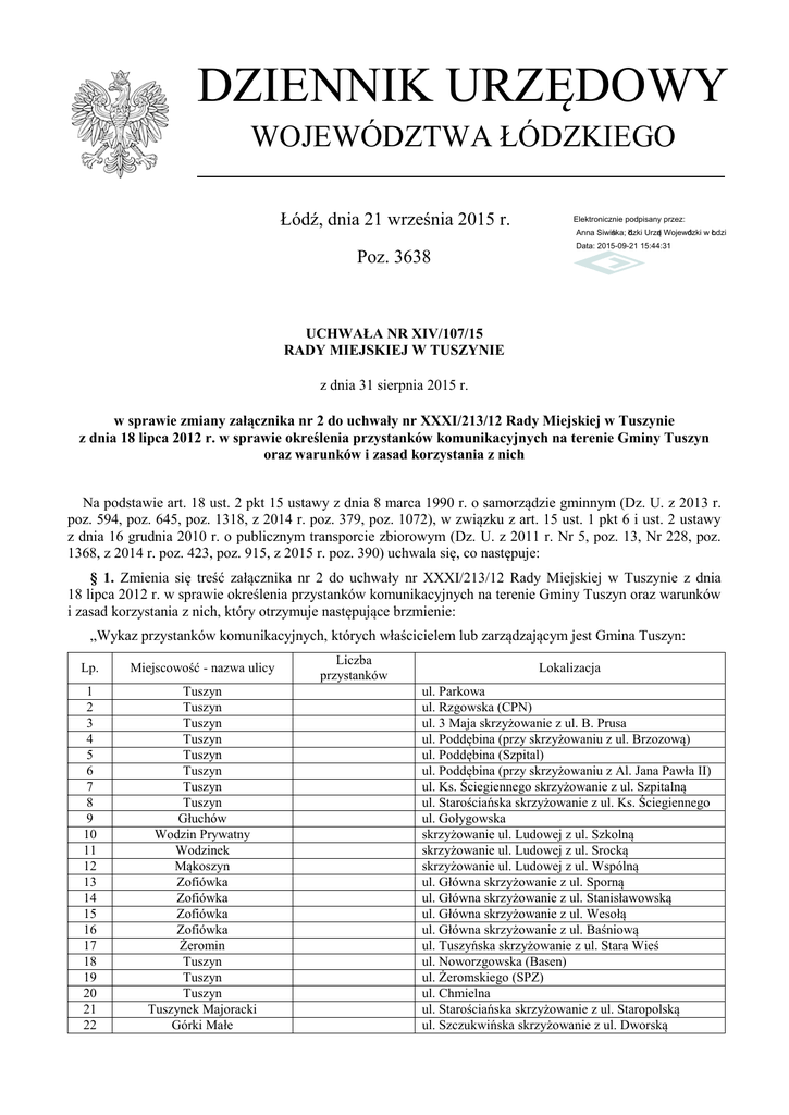 DZIENNIK URZĘDOWY WOJEWÓDZTWA ŁÓDZKIEGO Łódź, dnia 21 września 2015 r. Elektronicznie podpisany przez: Anna Siwińska; Łódzki Urząd Wojewódzki w Łodzi Poz. 3638 Data: 2015-09-21 15:44:31 UCHWAŁA NR XIV/107/15 RADY MIEJSKIEJ W TUSZYNIE z dnia 31 sierpnia 2015 r. w sprawie zmiany załącznika nr 2 do uchwały nr XXXI/213/12 Rady Miejskiej w Tuszynie z dnia 18 lipca 2012 r. w sprawie określenia przystanków komunikacyjnych na terenie Gminy Tuszyn oraz warunków i zasad korzystania z nich Na podstawie art. 18 ust. 2 pkt 15 ustawy z dnia 8 marca 1990 r. o samorządzie gminnym (Dz. U. z 2013 r. poz. 594, poz. 645, poz. 1318, z 2014 r. poz. 379, poz. 1072), w związku z art. 15 ust. 1 pkt 6 i ust. 2 ustawy z dnia 16 grudnia 2010 r. o publicznym transporcie zbiorowym (Dz. U. z 2011 r. Nr 5, poz. 13, Nr 228, poz. 1368, z 2014 r. poz. 423, poz. 915, z 2015 r. poz. 390) uchwala się, co następuje: § 1. Zmienia się treść załącznika nr 2 do uchwały nr XXXI/213/12 Rady Miejskiej w Tuszynie z dnia 18 lipca 2012 r. w sprawie określenia przystanków komunikacyjnych na terenie Gminy Tuszyn oraz warunków i zasad korzystania z nich, który otrzymuje następujące brzmienie: „Wykaz przystanków komunikacyjnych, których właścicielem lub zarządzającym jest Gmina Tuszyn: Lp. Miejscowość - nazwa ulicy 1 2 3 4 5 6 7 8 9 10 11 12 13 14 15 16 17 18 19 20 21 22 Tuszyn Tuszyn Tuszyn Tuszyn Tuszyn Tuszyn Tuszyn Tuszyn Głuchów Wodzin Prywatny Wodzinek Mąkoszyn Zofiówka Zofiówka Zofiówka Zofiówka Żeromin Tuszyn Tuszyn Tuszyn Tuszynek Majoracki Górki Małe Liczba przystanków Lokalizacja ul. Parkowa ul. Rzgowska (CPN) ul. 3 Maja skrzyżowanie z ul. B. Prusa ul. Poddębina (przy skrzyżowaniu z ul. Brzozową) ul. Poddębina (Szpital) ul. Poddębina (przy skrzyżowaniu z Al. Jana Pawła II) ul. Ks. Ściegiennego skrzyżowanie z ul. Szpitalną ul. Starościańska skrzyżowanie z ul. Ks. Ściegiennego ul. Gołygowska skrzyżowanie ul. Ludowej z ul. Szkolną skrzyżowanie ul. Ludowej z ul. Srocką skrzyżowanie ul. Ludowej z ul. Wspólną ul. Główna skrzyżowanie z ul. Sporną ul. Główna skrzyżowanie z ul. Stanisławowską ul. Główna skrzyżowanie z ul. Wesołą ul. Główna skrzyżowanie z ul. Baśniową ul. Tuszyńska skrzyżowanie z ul. Stara Wieś ul. Noworzgowska (Basen) ul. Żeromskiego (SPZ) ul. Chmielna ul. Starościańska skrzyżowanie z ul. Staropolską ul. Szczukwińska skrzyżowanie z ul. Dworską Dziennik Urzędowy Województwa Łódzkiego 23 24 25 Szczukwin Szczukwin Głuchów –2– Poz. 3638 ul. Gliniana OSP ul. Gliniana nr 40 ul. Długa 101 ”. § 2. Wykonanie uchwały powierza się Burmistrzowi Miasta Tuszyna. § 3. Uchwała wchodzi w życie po upływie 14 dni od ogłoszenia w Dzienniku Urzędowym Województwa Łódzkiego. Przewodniczący Rady Miejskiej w Tuszynie Andrzej Małecki