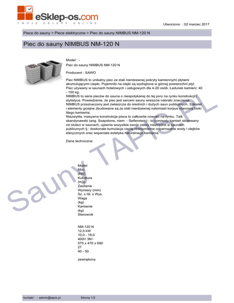Utworzono : 02 marzec 2017 Piece do sauny > Piece elektryczne > Piec do sauny NIMBUS NM-120 N Piec do sauny NIMBUS NM-120 N Model : Piec do sauny NIMBUS NM-120 N Producent : SAWO Piec NIMBUS to unikalny piec ze stali nierdzewnej pokryty kamiennymi płytami akumulującymi ciepło. Pojemniki na olejki są wydrążone w górnej powierzchni płyt. Piec używany w saunach hotelowych i usługowych dla 4-20 osób. Ładunek kamieni: 40 - 100 kg. NIMBUS to seria pieców do sauna o niespotykanej do tej pory na rynku konstrukcji i stylistyce. Powiedzenie, że piec jest sercem sauny wreszcie nabrało znaczenia. NIMBUS przeznaczony jest zwłaszcza do średnich i dużych saun publicznych. Szkielet i elementy grzejne zbudowane są ze stali nierdzewnej natomiast korpus stanowią bloki litego kamienia. Niezwykła, masywna konstrukcja pieca to całkowita nowość na rynku. Talk skandynawski (ang. Soapstone, niem. - Seifenstein) - to porowaty kamień stosowany od stuleci w saunach, ujawnia wszystkie swoje zalety niezbędne w saunach publicznych tj.: doskonała kumulacja ciepła równomierne odparowanie wody i olejków eterycznych oraz wspaniała estetyka naturalnego kamienia. Dane techniczne: S u a y n L P . S I P A T Model Moc (kW) Kubatura (m3) Zasilanie Wymiary (mm) Sz. x Gł. x Wys. Waga (kg) Kamienie (kg) Sterownik NM-120 N 12,0 kW 10,0 - 18,0 400V 3N~ 575 x 470 x 690 27 40 - 50 zewnętrzny kontakt : - [email protected] Strona 1/2 Utworzono : 02 marzec 2017 Piece do sauny > Piece elektryczne > Piec do sauny NIMBUS NM-120 N Piec do sauny NIMBUS NM-120 N Cena : 7884 zł Brutto ( 6410 zł Netto) L P . S I P A T Dostępność: Produkt dostępny w naszym sklepie od 17 czerwiec 2008 S y n u a kontakt : - [email protected] Strona 2/2