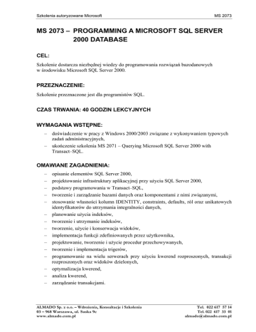 Szkolenia autoryzowane Microsoft MS 2073 MS 2073 – PROGRAMMING A MICROSOFT SQL SERVER 2000 DATABASE CEL: Szkolenie dostarcza niezbędnej wiedzy do programowania rozwiązań bazodanowych w środowisku Microsoft SQL Server 2000. PRZEZNACZENIE: Szkolenie przeznaczone jest dla programistów SQL. CZAS TRWANIA: 40 GODZIN LEKCYJNYCH WYMAGANIA WSTĘPNE: – doświadczenie w pracy z Windows 2000/2003 związane z wykonywaniem typowych zadań administracyjnych, – ukończenie szkolenia MS 2071 – Querying Microsoft SQL Server 2000 with Transact–SQL. OMAWIANE ZAGADNIENIA: – – – – – – – – – – – – – – – opisanie elementów SQL Server 2000, projektowanie infrastruktury aplikacyjnej przy użyciu SQL Server 2000, podstawy programowania w Transact–SQL, tworzenie i zarządzanie bazami danych oraz komponentami z nimi związanymi, stosowanie własności kolumn IDENTITY, constraints, defaults, ról oraz unikatowych identyfikatorów do utrzymania integralności danych, planowanie użycia indeksów, tworzenie i utrzymanie indeksów, tworzenie, użycie i konserwacja widoków, implementacja funkcji zdefiniowanych przez użytkownika, projektowanie, tworzenie i użycie procedur przechowywanych, tworzenie i implementacja trigerów, programowanie na wielu serwerach przy użyciu kwerend rozproszonych, transakcji rozproszonych oraz widoków dzielonych, optymalizacja kwerend, analiza kwerend, zarządzanie transakcjami. ALMADO Sp. z o.o. – Wdrożenia, Konsultacje i Szkolenia 03 – 968 Warszawa, ul. Saska 9c www.almado.com.pl Tel. 022 617 57 14 Tel. 022 617 33 01 [email protected]