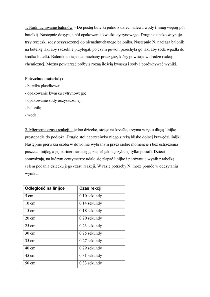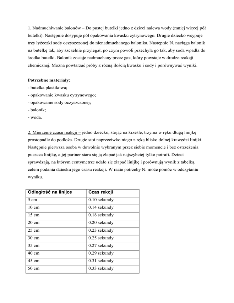 1. Nadmuchiwanie balonów – Do pustej butelki jedno z dzieci nalewa wody (mniej więcej pół butelki). Następnie dosypuje pół opakowania kwasku cytrynowego. Drugie dziecko wsypuje trzy łyżeczki sody oczyszczonej do nienadmuchanego balonika. Następnie N. naciąga balonik na butelkę tak, aby szczelnie przylegał, po czym powoli przechyla go tak, aby soda wpadła do środka butelki. Balonik zostaje nadmuchany przez gaz, który powstaje w drodze reakcji chemicznej. Można powtarzać próby z różną ilością kwasku i sody i porównywać wyniki. Potrzebne materiały: - butelka plastikowa; - opakowanie kwasku cytrynowego; - opakowanie sody oczyszczonej; - balonik; - woda. 2. Mierzenie czasu reakcji – jedno dziecko, stojąc na krześle, trzyma w ręku długą linijkę prostopadle do podłoża. Drugie stoi naprzeciwko niego z ręką blisko dolnej krawędzi linijki. Następnie pierwsza osoba w dowolnie wybranym przez siebie momencie i bez ostrzeżenia puszcza linijkę, a jej partner stara się ją złapać jak najszybciej tylko potrafi. Dzieci sprawdzają, na którym centymetrze udało się złapać linijkę i porównują wynik z tabelką, celem podania dziecku jego czasu reakcji. W razie potrzeby N. może pomóc w odczytaniu wyniku. Odległość na linijce Czas rekcji 5 cm 0.10 sekundy 10 cm 0.14 sekundy 15 cm 0.18 sekundy 20 cm 0.20 sekundy 25 cm 0.23 sekundy 30 cm 0.25 sekundy 35 cm 0.27 sekundy 40 cm 0.29 sekundy 45 cm 0.31 sekundy 50 cm 0.33 sekundy Potrzebne materiały: - długa linijka (najlepiej kilka, żeby wszystkie dzieci mogły wypróbować zadanie); - przygotowana tabelka czasu reakcji. 3. Ile trwa minuta? N. prosi dzieci, aby usiadły w dogodnej pozycji z zamkniętymi oczami. Ich zadaniem jest wyczucie upływu jednej minuty. Od momentu, gdy N. wypowie słowo „start” każde dziecko próbuje w myśli odliczyć 1 minutę. Gdy to zrobi, podnosi głowę, w ciszy czeka aż wszystkie dzieci zrobią to samo (należy zwrócić uwagę dzieci, aby nie krzyczały i nie przerywały innym). Gdy wszyscy skończą odliczanie N. podaje, jak wyglądało wyczucie czasu każdego dziecka. Potrzebne materiały: - stoper lub zegarek z sekundnikiem. 4. Napięcie powierzchniowe wody „Skóra wody”. Dzieci posypują wodę, znajdującą się w głębokim talerzyku, pieprzem. Pieprz pływa na powierzchni wody, dzieci zanurzają palec w detergencie po czym dotykają palcem wody, pieprz tonie – napięcie powierzchniowe wody zostało zburzone. Potrzebne materiały: - miseczka z wodą; - suchy, miałki pieprz, - płyn do mycia naczyń. 5. Wyporność - dlaczego niektóre rzeczy pływają, a inne toną - „Kamizelka ratunkowa”. N. przygotowuje miskę (najlepiej przezroczystą) z wodą oraz kilka pomarańczy. Pyta dzieci, jak sądzą, co się wydarzy, kiedy wrzuci pomarańczę do wody. Może też zaproponować głosowanie, jeśli pojawią się różne hipotezy. Następnie wykonują doświadczenie. Pomarańcza nie tonie – skórka działa jak kamizelka ratunkowa. Następnie N. obiera pomarańczę ze skóry, dzieci ponownie zanurzają ją w wodzie, owoc tonie. Potrzebne materiały: - miska (najlepiej przezroczysta) lub inny głęboki pojemnik z wodą; - kilka pomarańczy. 6. Gęstość wody „Jajeczny nurek”. N. przygotowuje miskę (najlepiej przezroczystą) z wodą i pyta dzieci, co się stanie jeśli włoży do niej jajko. Następnie sprawdzane są podejrzenia dzieci – jajko tonie. Następnie N. soli wodę 10-12 łyżkami soli. Pyta dzieci, co tym razem się stanie. Może zaproponować głosowanie, jeśli pojawią się różne hipotezy. Jajko w mocno osolonej wodzie pływa. N. delikatnie dolewa niesłonej wody na wierzch wody słonej – jajo pozostaje pomiędzy wodą zwykłą a solanką. Po zadaniu można wskazać znaczenie obserwacji: podział na wody słone (morza i Oceany) i słodkie (jeziora, rzeki, strumienie). Potrzebne materiały: - miska (najlepiej przezroczysta) lub inny głęboki pojemnik z wodą; - opakowanie soli; - 2-3 jajka. 7. Jak wytrzymały jest ludzki włos? Potrzebny jest długi ludzki włos. Używając taśmy klejącej, N. przymocowuje włos do brzegu stołu. Teraz stopniowo obciążaj go monetami 2 zł. Ile monet udźwignie włos? Dzieci mogą sprawdzić wytrzymałość swoich włosów. Czy różnią się włosy jasny od ciemnych? Jakie wnioski można wyciągnąć z przeprowadzonego doświadczenia? Potrzebne materiały: - 10 monet 2 zł; - taśma klejąca. 8. Rozłożone flamastry. Na pasku wyciętym z filtru do kawy w odległości ok. 2 cm od brzegu N. rysuje flamastrem kreskę. Do szklanki nalewa odrobinę octu (słup cieczy ma mieć wysokość ok. 1 cm). Następnie przymocowuje pasek papieru do ołówka za pomocą taśmy klejącej i wiesza na szklance tak, żeby dół paska z narysowaną kreską zanurzony był w occie, ale kreska znajdowała się nad powierzchnią cieczy. Wraz z uczniami i uczennicami obserwuje, co się dzieje. Można porównać efekt użycia różnych flamastrów. Potrzebne materiały: - ocet; - woda; - biały filtr do kawy; - taśma klejąca; - ołówek; - szklanka; - nożyczki. 9. Kwadratowe bańki mydlane. Należy wlać wodę do miski, dodać do niej płynu do naczyń i szczyptę cukru, a następnie wymieszać. Z drucików uczniowie wyginają kółka o różnej średnicy. Które kółko pozwala na zrobienie największych baniek? Co się stanie, kiedy z drucika zrobi się sześcian i zanurzy w mydlinach? Potrzebne materiały: - sztywny drucik; - płyn do mycia naczyń; - miseczka; - woda; - szczypta cukru (lub glicerol); - słomka; - nożyczki. 10. Tęcza. Do miski N. wlewa wodę i opiera lusterko o dno miski – w ten sposób fragment lusterka znajdzie się pod wodą. Następnie świeci latarką w lusterko, tak aby płomień latarki trafiał na zanurzoną część lustra. Następnie próbuje „złapać” odbite światło na biały papier. Co można było zaobserwować? Dzieci również mogą spróbować wykonać to zadanie. Potrzebne mat