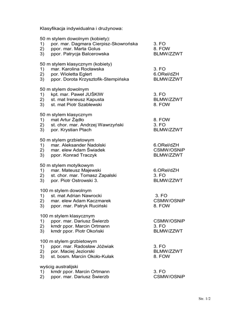 Klasyfikacja indywidualna i drużynowa: 50 m stylem dowolnym (kobiety): 1) por. mar. Dagmara Cierpisz-Skowrońska 2) ppor. mar. Marta Golus 3) ppor. Patrycja Balcerowska 3. FO 8. FOW BLMW/ZZWT 50 m stylem klasycznym (kobiety) 1) mar. Karolina Rocławska 2) por. Wioletta Eglert 3) ppor. Dorota Krzysztofik-Stempińska 3. FO 6.ORel/dZH BLMW/ZZWT 50 m stylem dowolnym 1) kpt. mar. Paweł JUŚKIW 2) st. mat Ireneusz Kapusta 3) st. mat Piotr Szablewski 3. FO BLMW/ZZWT 8. FOW 50 m stylem klasycznym 1) mat Artur Żądło 2) st. chor. mar. Andrzej Wawrzyński 3) por. Krystian Ptach 8. FOW 3. FO BLMW/ZZWT 50 m stylem grzbietowym 1) mar. Aleksander Nadolski 2) mar. elew Adam Świadek 3) ppor. Konrad Traczyk 6.ORel/dZH CSMW/OSNiP BLMW/ZZWT 50 m stylem motylkowym 1) mar. Mateusz Majewski 2) st. chor. mar. Tomasz Zapalski 3) por. Piotr Ostrowski 3. 6.ORel/dZH 3. FO BLMW/ZZWT 100 m stylem dowolnym 1) st. mat Adrian Nawrocki 2) mar. elew Adam Kaczmarek 3) ppor. mar. Patryk Ruciński 3. FO CSMW/OSNiP 8. FOW 100 m stylem klasycznym 1) ppor. mar. Dariusz Świerzb 2) kmdr ppor. Marcin Ortmann 3) kmdr ppor. Piotr Okoński CSMW/OSNiP 3. FO BLMW/ZZWT 100 m stylem grzbietowym 1) ppor. mar. Radosław Jóźwiak 2) por. Maciej Jeziorski 3) st. bosm. Marcin Około-Kułak 3. FO BLMW/ZZWT 8. FOW wyścig australijski 1) kmdr ppor. Marcin Ortmann 2) ppor. mar. Dariusz Świerzb 3. FO CSMW/OSNiP Str. 1/2 3) mar. Mateusz Majewski 6.ORel/dZH sztafeta 4x50 m 1) 3. FO (por. mar. Paweł Juśkiw, st. chor. mar. Tomasz Zapalski, kmdr ppor. Marcin Ortmann, st. mat Adrian Nawrocki) 2) CSMW/OSNiP (mar. elew Adam Kaczmarek, mar. elew Damian Wnuk, mar. elew Adam Świadek, ppor. mar. Dariusz Świerzb) 3) 6.ORel/dZH (mar. Rafał Skibiak, mar. Aleksander Nadolski, kpt. Fabian Klekotko, mar. Mateusz Majewski). Po czterech rozegranych konkurencjach w klasyfikacji generalnej Mistrzostw Marynarki Wojennej 3. Flotylla Okrętów wyprzedza połączony zespół 6. Ośrodka Radioelektronicznego i Dywizjonu Zabezpieczenia Hydrograficznego MW oraz Brygadę Lotnictwa MW i Zespół Zabezpieczenia Wsparcia Teleinformatycznego. Str. 2/2
