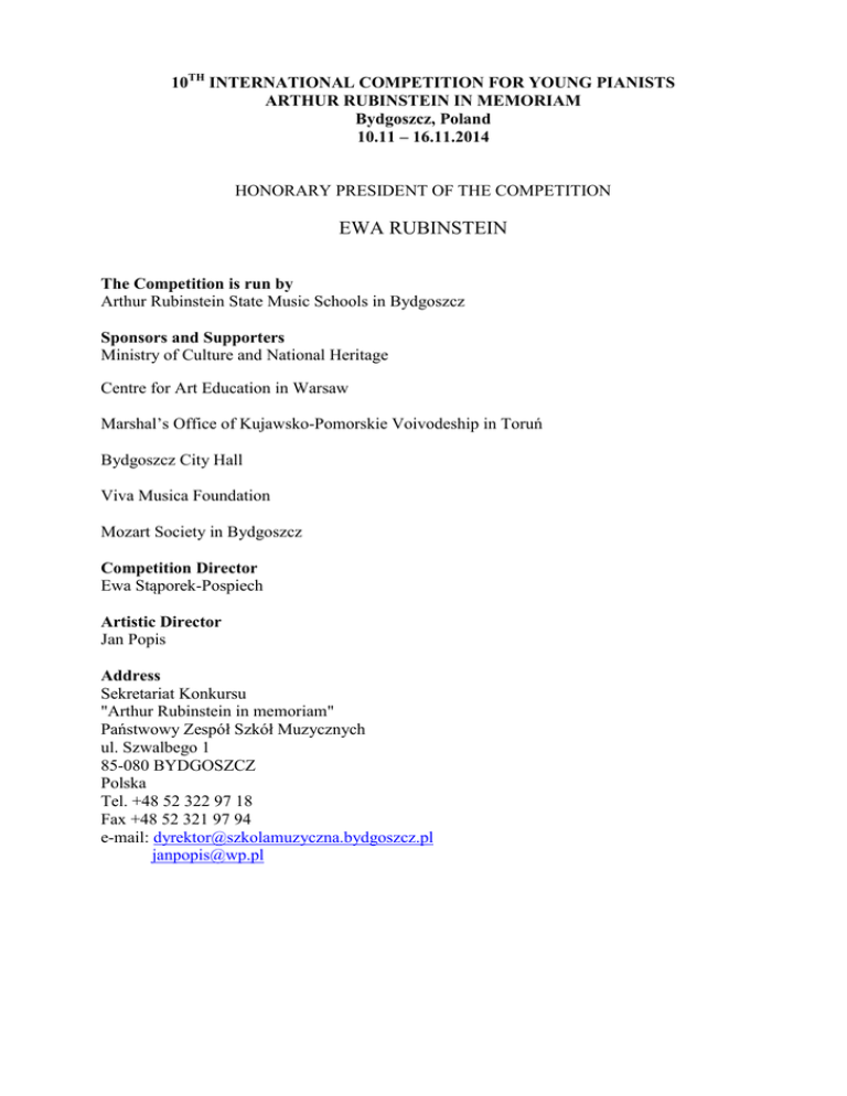 10TH INTERNATIONAL COMPETITION FOR YOUNG PIANISTS ARTHUR RUBINSTEIN IN MEMORIAM Bydgoszcz, Poland 10.11 – 16.11.2014 HONORARY PRESIDENT OF THE COMPETITION EWA RUBINSTEIN The Competition is run by Arthur Rubinstein State Music Schools in Bydgoszcz Sponsors and Supporters Ministry of Culture and National Heritage Centre for Art Education in Warsaw Marshal’s Office of Kujawsko-Pomorskie Voivodeship in Toruń Bydgoszcz City Hall Viva Musica Foundation Mozart Society in Bydgoszcz Competition Director Ewa Stąporek-Pospiech Artistic Director Jan Popis Address Sekretariat Konkursu "Arthur Rubinstein in memoriam" Państwowy Zespół Szkół Muzycznych ul. Szwalbego 1 85-080 BYDGOSZCZ Polska Tel. +48 52 322 97 18 Fax +48 52 321 97 94 e-mail: [email protected] [email protected] COMPETITION RULES I The 10th International Competition for Young Pianists ARTHUR RUBINSTEIN IN MEMORIAM takes place in Bydgoszcz from 10 November to 16 November 2014. . II The Competition is open to pianists of all nationalities born after 31 December 1992. III 1. The Application Form must be returned to: Sekretariat Konkursu "Arthur Rubinstein in memoriam" Państwowy Zespół Szkół Muzycznych im. A. Rubinsteina ul. Szwalbego1 85-080 BYDGOSZCZ Polska Tel. +48 52 322 97 18 Fax +48 52 321 97 94 e-mail: [email protected] [email protected] www.konkurs-rubinstein.bydgoszcz.pl www.konkursmuzyczny.pl and must arrive not later than 01 October 2014. 2. The following enclosures are required from each applicant: - a completed application form - 3 black and white photos (9x12 cm) - a photocopy of the applicant’s birth certificate - a brief artistic biography - a letter of recommendation from a piano-teacher or a school with a full address, a telephone number and a fax number or an e-mail address of the recommending person - a bank receipt showing that the entrance fee of EUR 150 or an equivalent sum in foreign currency has been paid to the following bank account: Państwowy Zespół Szkół Muzycznych im. Artura Rubinsteina SWIT – NBP LPLPW IBAN PL 10 1010 1078 0020 2013 9134 0000 the transfer description: “X Międzynarodowy Konkurs Młodych Pianistów” must be clearly shown on the receipt. 3. Incomplete documents will not be accepted. Materials will not be returned. IV All applications meeting the deadline will be examined by the Selection Committee appointed by the Direction of the Competition. The Committee has the right to accept or reject the application without giving any reason. The Artistic Director will preside over the Committee meetings. V 1. All applicants will be informed of their acceptance or rejection not later than 20 October 2014. 2. Acceptance of the application entitles the applicant to participate in the Competition on terms set hereunder. 3. Entrance fees of unsuccessful applicants will be returned after charging a transfer fee. 4. Entrance fees of candidates resigning after 20 October 2014 will not be returned. VI 1. Competitors waive all rights for publication, broadcasting and recording of their performance and image. 2. Competitors surrender all above rights to the Direction of the Competition without any time or territorial limits. VII 1. The cost of travel, accommodation and meals will be covered by competitors. 2. The Organizers of the Competition will cover the cost of accommodation for all second stage competitors and finalists. 3. Competitors will be provided with practice facilities in classrooms and will have a right to one rehearsal in the concert hall. 4. Competitors who will qualify for the final will have one rehearsal with an orchestra. VIII 1. Competitors must arrive at Sekretariat Konkursu (Secretariat of the Competition) on the day of which they will be advised in the information package prior sent to them. 2. At the discretion of the President of the Jury in case of extraordinary circumstances latecomers may get a right to perform outside the set order at the end of the first stage. IX 1. Competitors will play in public. The Competition consists of two stages and the final. 2. The playing order of competitors will be decided by a draw before the first stage and will be adhered to throughout the Competition. 3. The Jury may change the playing order of competitors on specific days. For a good reason a competitor may be allowed to perform at the end of the stage. 4. The Jury will select competitors in the following way: - no more than twelve competitors will be admitted to the second stage - no more than six competitors will be admitted to the final. 5. In exceptional cases a competitor may be asked by the Competition Director to play the concerto with accompaniment by a second piano to prove their readiness for performing with an orchestra. X The programme of the Competition consists of the following pieces. Competitors play them from memory in the order stated in their application form. The order of pieces is optional. 1ST STAGE - 18 - 20 minutes. 1. A short composition by Johann Sebastian Bach. 2. Two virtuoso etudes played one after another: - Chopin - Liszt, Rachmaninov or Scriabin 3. One of the following Chopin’s compositions: - Scherzo in B minor, Op. 20 - Scherzo in B flat minor, Op. 31 - Scherzo in C sharp minor, Op. 39 - Scherzo in E major, Op. 54 - Ballade in G minor, Op.23 - Ballade in F major, Op. 38 - Ballade in A flat major, Op. 47 - Ballade in F minor, Op. 52 - Fantasia in F minor, Op. 47 - Barcarole in F sharp major, Op. 60 2ND STAGE – 40 - 45 minutes. 1. One of the following compositions by Karol Szymanowski: - 4 Mazurkas from Op. 50 No. 1, 2, 3, 4 - Serenade of Don Juan No. 3 from “Masques” Op. 34 - Variations in B flat minor, Op. 3 2. One Classical or Romantic sonata (Haydn, Mozart, Beethoven, Schubert, Chopin, Schumann, Liszt, Brahms). 3. One piece of the competitor’s own choice. 3RD STAGE - Final. One of the following piano concertos with an orchestra. - Ludwig van Beethoven: in C minor, Op.37 in G major, Op.58 in E flat major, Op.73 - Frederick Chopi
