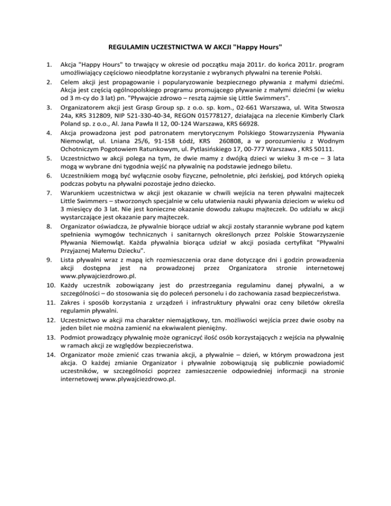 REGULAMIN UCZESTNICTWA W AKCJI "Happy Hours" 1. 2. 3. 4. 5. 6. 7. 8. 9. 10. 11. 12. 13. 14. żl ęś n ł n n b n h ł ln n n P l Celem akcji jest propagowanie i l n b n ł n ł ęś ln l ł n ł w wieku od 3 m-cy 3 l ) n Pł – ęL l S Organizatorem akcji jest Grasp Group sp. z o.o. sp. kom., 02-661 Warszawa, ul. Wita Stwosza 24a, KRS 312809, NIP 521-330-40-34, REGON 015778127, ł na zlecenie Kimberly Clark P l n , l J n P ł II , -124 Warszawa, KRS 66928. Akcja prowadzona jest pod patr n n P l S n Pł n N l , l Ln n 5/6, 9 - 58 Ł ź, KRS 6 8 8, a w porozumieniu z Wodnym O h n P R n , l P l 7, 00-777 Warszawa , KRS 50111. Uczestnictwo w akcji polega na tym, ż 3 -ce – 3 lata b n n n ś n ł ln ę n n bl U n b ł n b f n , łn l n , ł ż , h b n ł ln ostaje jedno dziecko. W n n n h l ś n n ł ln Little Swimmers – n h ln l ł n n ł n 3 ę 3l N n n n D ł n O n ś ,ż ł ln b ł ł nn b n łn n hn n h n n h śl n h P l S owarzyszenie Pł n N l K ż ł ln b ł f Pł ln P n M ł D L ł ln h n n n n n ę n n n przez Organizatora stronie internetowej www.plywajciezdrowo.pl. K ż n b n n l n n ł ln , ln ś – n ę l n l h n b Z b n nf ł ln n bl śl l n ł ln U n h n , n żl ś ś b n nbl n żn n n l n n ężn Podmiot prowad ł ln ę ż n l ś b h ś n ł ln ę h lę b . O n ż n n , ł ln – , n O ż n O n ł ln b ę bl n n , ln ś n n nf n n internetowej www.plywajciezdrowo.pl.