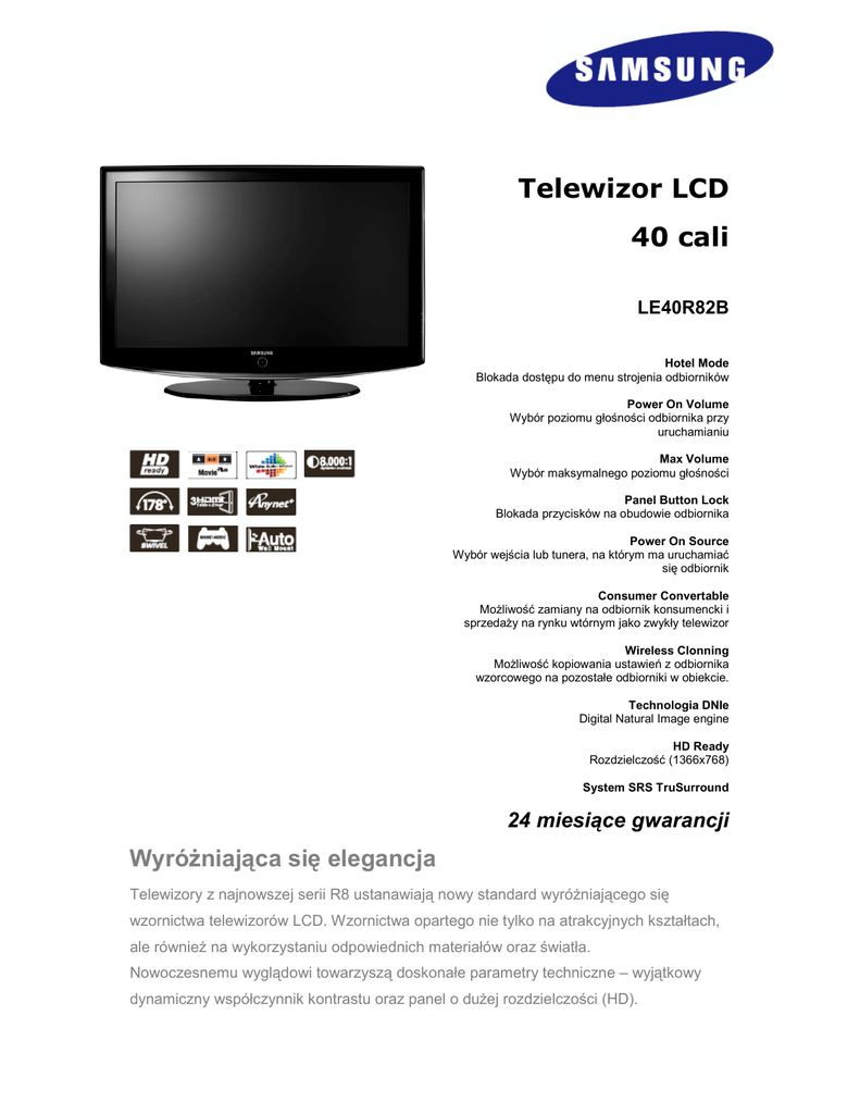 Telewizor LCD 40 cali LE40R82B Hotel Mode Blokada dostępu do menu strojenia odbiorników Power On Volume Wybór poziomu głośności odbiornika przy uruchamianiu Max Volume Wybór maksymalnego poziomu głośności Panel Button Lock Blokada przycisków na obudowie odbiornika Power On Source Wybór wejścia lub tunera, na którym ma uruchamiać się odbiornik Consumer Convertable MoŜliwość zamiany na odbiornik konsumencki i sprzedaŜy na rynku wtórnym jako zwykły telewizor Wireless Clonning MoŜliwość kopiowania ustawień z odbiornika wzorcowego na pozostałe odbiorniki w obiekcie. Technologia DNIe Digital Natural Image engine HD Ready Rozdzielczość (1366x768) System SRS TruSurround 24 miesiące gwarancji WyróŜniająca się elegancja Telewizory z najnowszej serii R8 ustanawiają nowy standard wyróŜniającego się wzornictwa telewizorów LCD. Wzornictwa opartego nie tylko na atrakcyjnych kształtach, ale równieŜ na wykorzystaniu odpowiednich materiałów oraz światła. Nowoczesnemu wyglądowi towarzyszą doskonałe parametry techniczne – wyjątkowy dynamiczny współczynnik kontrastu oraz panel o duŜej rozdzielczości (HD). Dlaczego warto wybrać Telewizor LCD LE40R82B? odbiorniki działają identycznie oraz eliminuje konieczność powtarzania instalacji nazwy kanału, częstotliwości oraz ustawień trybu hotelowego w wielu odbiornikach. Tryb hotelowy – Kensington Lock – rodzaj blokady zapewnia całkowitą kontrolę nad pozwalający na zabezpieczenie odbiornikiem. W jego skład wchodzą odbiornika przed kradzieŜą. takie funkcje, jak: VESA Wall Mount Interface – Hotel Mode – blokada dostępu do ogólno przyjęty standard otworów menu strojenia. Funkcja ta pozwala montaŜowych przeznaczonych do chronić wprowadzone do odbiornika zainstalowania uchwytu ściennego. ustawienie programów np. przed obcokrajowcami, którzy mają Technologia DNIe - technologia tendencję do szukania programów we czwartej generacji zapewnia wspaniały i własnym języku i przestrajania realistyczny obraz, bez fałszywych odbiorników. zniekształceń. Panel Buton Lock – blokada przycisków na obudowie odbiornika. W przypadku, gdy odbiornik zainstalowany jest w miejscu publicznym, wówczas włączenie tej funkcji pozwala na zablokowanie przycisków na obudowie. Dzięki temu, kontrola odbiornika staje się moŜliwa Wide Color Enhancer – jaśniejsze obszary mają większą luminację, co moŜe prowadzić do osłabienia kolorów, zwłaszcza niebieskiego i zielonego. Dzięki funkcji Wide Color Enhancer, telewizory Samsung pozwalają cieszyć się naturalnym wyglądem kolorów nawet w jasnych obszarach obrazu. jedynie za pomocą pilota zdalnego DuŜy współczynnik kontrastu – sterowania. bardzo duŜy współczynnik kontrastu sprawia, Ŝe biel jest bielsza a czerń Power On Volume - wybór poziomu czarniejsza, dzięki czemu obraz staje głośności odbiornika przy się wyraźniejszy i bogatszy w szczegóły. uruchamianiu. Szeroki kąt widzenia - niezaleŜnie Max Volume – wybór maksymalnego od połoŜenia telewizora, panel poziomu głośności. Daje pewność, Ŝe S-PVA firmy Samsung zapewnia odbiornik nie będzie zakłócał ciszy i wysoką jakość obrazu z kaŜdego spokoju osób przebywających w miejsca w pokoju. sąsiednich pokojach. Power on Source – wybór wejścia lub kanału tunera, na którym ma uruchamiać się odbiornik. Funkcja ta umoŜliwia takie zaprogramowanie odbiornika, aby zawsze uruchamiał się na wybranym kanale np. kanale informacyjnym o atrakcjach w hotelu lub jego okolicy (jeŜeli taki kanał jest dostępny w obiekcie w sieci kablowej). Wireless Clonning – funkcja bezprzewodowego klonowania, która upraszcza i przyśpiesza instalację wielu telewizorów. Gwarantuje, Ŝe HDMI - Trzy złącza HDMI (High Definition Multimedia Interface) sprawiają, Ŝe telewizor moŜe stać się centralnym elementem systemu multimedialnego. Dwa tylne gniazda mogą słuŜyć do podłączania urządzeń, takich jak: odtwarzacze płyt, konsole do gier, tunery satelitarne, aparaty fotograficzne, kamery czy laptopy. HDMI jest najlepszym interfejsem do przesyłania cyfrowego sygnału ze źródła o duŜej rozdzielczości do telewizora HDTV. Specyfikacja Techniczna Modelu LE40R82B Wideo - Telewizor TFT-LCD 40" - Format: 16:9 - HD Ready - Rozdzielczość: 1366 x 768 - Jasność: 550 cd/m 2 - Współczynnik kontrastu: 8000:1 - Czas reakcji: 8 ms - Kąt widzenia (poziomy/pionowy): 178o/178o - Podświetlenie: Lampa CCFL - Technologia DNIe (Digital Natural Image engine) Audio - Moc wyjściowa: 2 x 10 W - Stereo A2/NiCAM - Dźwięk dookolny: System SRS TruSurround XT Funkcje - Funkcja Sleep - Zegar i wyłącznik czasowy - Stop-klatka - Telegazeta 1000 TXT - Automatyczne wyszukiwanie kanałów - Obraz w obrazie (PIP): 1 Tuner - Automatyczne wyłączanie - Automatyczna regulacja głośności - Game Mode (Tryb gracza) – specjalne ustawienia dynamiki wyświetlania obrazu - Menu ekranowe w języku polskim - Anynet + (HDMI-CEC) - Movie Plus Wejścia/Wyjścia (z tyłu) - Wejście antenowe: 1 - Wejście składowych (Y/Pb/PR): 1 - Sygnał kompozytowy (AV): 1 - HDMI: 2 - Wejście PC (D-SUB): 1 - Wyjście audio kanał lewy/prawy: 1 Obudowa - Kolor: Czarny - Błyszczące wykończenie obudowy ze wszystkich stron - Kensington Lock (linka zabezpieczająca nie znajduje się w komplecie) - Obrotowa podstawa System - System barwny PAL Multi - Zasilanie 100V ~ 240V Wejścia/Wyjścia (z boku) - Słuchawkowe: 1 - S-Video: 1 - HDMI Pobór mocy - Pobór mocy – praca: 210W - Pobór mocy – gotowość: < 1W Wymiary (SxWxG) - Z podstawa: 992*300*702 mm - Bez podstawy:992*87*655 mm Masa (kg) - Masa urządzenia netto z podstawą 21,1 - Masa urządzenia netto bez podstawy: 17,9 - Masa urządzenia brutto: 26,2 Akcesoria - Uchwyt do montaŜu na ścianie (opcja) Vesa 200x200/WMN5090 EAN 8808987156305