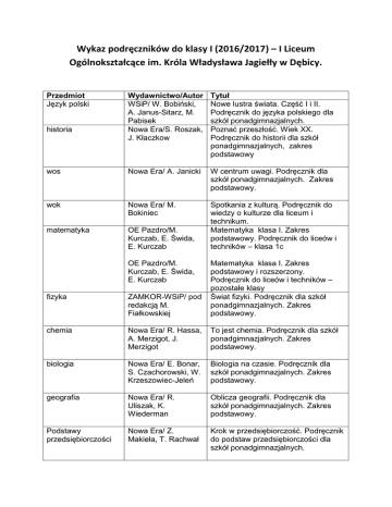 Wykaz podręczników do klasy I (2016/2017) – I Liceum Ogólnokształcące im. Króla Władysława Jagiełły w Dębicy. Wydawnictwo/Autor WSiP/ W. Bobiński, A. Janus-Sitarz, M. Pabisek Nowa Era/S. Roszak, J. Kłaczkow Tytuł Nowe lustra świata. Część I i II. Podręcznik do języka polskiego dla szkół ponadgimnazjalnych. Poznać przeszłość. Wiek XX. Podręcznik do historii dla szkół ponadgimnazjalnych, zakres podstawowy wos Nowa Era/ A. Janicki W centrum uwagi. Podręcznik dla szkół ponadgimnazjalnych. Zakres podstawowy. wok Nowa Era/ M. Bokiniec matematyka OE Pazdro/M. Kurczab, E. Świda, E. Kurczab Spotkania z kulturą. Podręcznik do wiedzy o kulturze dla liceum i technikum. Matematyka klasa I. Zakres podstawowy. Podręcznik do liceów i techników – klasa 1c Przedmiot Język polski historia OE Pazdro/M. Kurczab, E. Świda, E. Kurczab fizyka ZAMKOR-WSiP/ pod redakcją M. Fiałkowskiej Matematyka klasa I. Zakres podstawowy i rozszerzony. Podręcznik do liceów i techników – pozostałe klasy Świat fizyki. Podręcznik dla szkół ponadgimnazjalnych. Zakres podstawowy. chemia Nowa Era/ R. Hassa, A. Merzigot, J. Merzigot To jest chemia. Podręcznik dla szkół ponadgimnazjalnych. Zakres podstawowy. biologia Nowa Era/ E. Bonar, S. Czachorowski, W. Krzeszowiec-Jeleń Biologia na czasie. Podręcznik dla szkół ponadgimnazjalnych. Zakres podstawowy. geografia Nowa Era/ R. Uliszak, K. Wiederman Oblicza geografii. Podręcznik dla szkół ponadgimnazjalnych. Zakres podstawowy. Podstawy przedsiębiorczości Nowa Era/ Z. Makieła, T. Rachwał Krok w przedsiębiorczość. Podręcznik do podstaw przedsiębiorczości dla szkół ponadgimnazjalnych. Edukacja dla bezpieczeństwa Nowa era/ J. Słoma Żyję i działam bezpiecznie. Edukacja dla bezpieczeństwa. Podręcznik dla szkół ponadgimnazjalnych informatyka MiGra/G.Koba Informatyka dla szkół ponadgimnazjalnych. Zakres podstawowy Podręcznik dla szkół ponadgimnazjalnych. Zakres podstawowy. Podręcznik dla szkół Podręcznik dla szkół ponadgimnazjalnych. ponadgimnazjalnych. Zakres podstawowy. Zakres podstawowy. Podręczniki do nauczania języków obcych – we wrześniu po zakwalifikowaniu do grup językowych