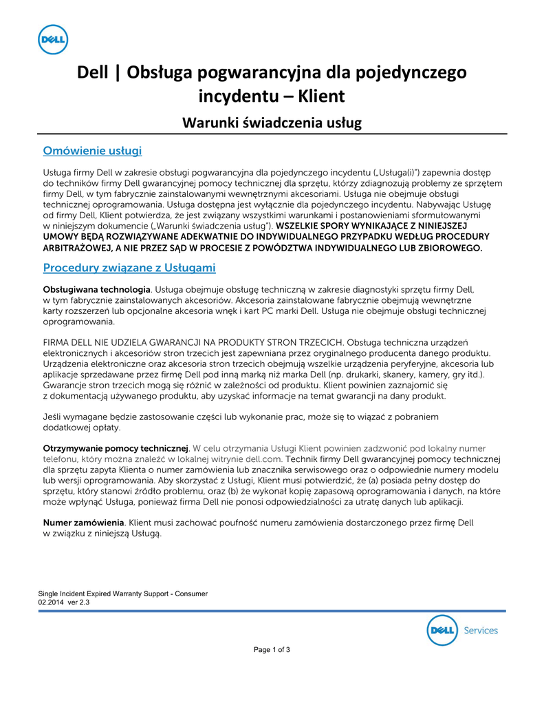 Dell | Obsługa pogwarancyjna dla pojedynczego incydentu – Klient Warunki świadczenia usług Omówienie usługi Usługa firmy Dell w zakresie obsługi pogwarancyjna dla pojedynczego incydentu („Usługa(i)”) zapewnia dostęp do techników firmy Dell gwarancyjnej pomocy technicznej dla sprzętu, którzy zdiagnozują problemy ze sprzętem firmy Dell, w tym fabrycznie zainstalowanymi wewnętrznymi akcesoriami. Usługa nie obejmuje obsługi technicznej oprogramowania. Usługa dostępna jest wyłącznie dla pojedynczego incydentu. Nabywając Usługę od firmy Dell, Klient potwierdza, że jest związany wszystkimi warunkami i postanowieniami sformułowanymi w niniejszym dokumencie („Warunki świadczenia usług”). WSZELKIE SPORY WYNIKAJĄCE Z NINIEJSZEJ UMOWY BĘDĄ ROZWIĄZYWANE ADEKWATNIE DO INDYWIDUALNEGO PRZYPADKU WEDŁUG PROCEDURY ARBITRAŻOWEJ, A NIE PRZEZ SĄD W PROCESIE Z POWÓDZTWA INDYWIDUALNEGO LUB ZBIOROWEGO. Procedury związane z Usługami Obsługiwana technologia. Usługa obejmuje obsługę techniczną w zakresie diagnostyki sprzętu firmy Dell, w tym fabrycznie zainstalowanych akcesoriów. Akcesoria zainstalowane fabrycznie obejmują wewnętrzne karty rozszerzeń lub opcjonalne akcesoria wnęk i kart PC marki Dell. Usługa nie obejmuje obsługi technicznej oprogramowania. FIRMA DELL NIE UDZIELA GWARANCJI NA PRODUKTY STRON TRZECICH. Obsługa techniczna urządzeń elektronicznych i akcesoriów stron trzecich jest zapewniana przez oryginalnego producenta danego produktu. Urządzenia elektroniczne oraz akcesoria stron trzecich obejmują wszelkie urządzenia peryferyjne, akcesoria lub aplikacje sprzedawane przez firmę Dell pod inną marką niż marka Dell (np. drukarki, skanery, kamery, gry itd.). Gwarancje stron trzecich mogą się różnić w zależności od produktu. Klient powinien zaznajomić się z dokumentacją używanego produktu, aby uzyskać informacje na temat gwarancji na dany produkt. Jeśli wymagane będzie zastosowanie części lub wykonanie prac, może się to wiązać z pobraniem dodatkowej opłaty. Otrzymywanie pomocy technicznej. W celu otrzymania Usługi Klient powinien zadzwonić pod lokalny numer telefonu, który można znaleźć w lokalnej witrynie dell.com. Technik firmy Dell gwarancyjnej pomocy technicznej dla sprzętu zapyta Klienta o numer zamówienia lub znacznika serwisowego oraz o odpowiednie numery modelu lub wersji oprogramowania. Aby skorzystać z Usługi, Klient musi potwierdzić, że (a) posiada pełny dostęp do sprzętu, który stanowi źródło problemu, oraz (b) że wykonał kopię zapasową oprogramowania i danych, na które może wpłynąć Usługa, ponieważ firma Dell nie ponosi odpowiedzialności za utratę danych lub aplikacji. Numer zamówienia. Klient musi zachować poufność numeru zamówienia dostarczonego przez firmę Dell w związku z niniejszą Usługą. Single Incident Expired Warranty Support - Consumer 02.2014 ver 2.3 Page 1 of 3 Kopia zapasowa oprogramowania/danych/ZWOLNIENIE Z ODPOWIEDZIALNOŚCI. Klient jest odpowiedzialny za wykonanie kopii zapasowej wszystkich istniejących danych, programów i oprogramowania znajdujących się na Obsługiwanych produktach przed skorzystaniem z Usług (w tym pomocy technicznej przez telefon). FIRMA DELL NIE BĘDZIE ODPOWIADAĆ ZA UTRATĘ LUB ODZYSKANIE DANYCH, PROGRAMÓW LUB UTRATĘ UŻYTECZNOŚCI SYSTEMU(ÓW) LUB SIECI, WYNIKAJĄCĄ Z PRZEPROWADZONYCH USŁUG LUB JAKICHKOLWIEK DZIAŁAŃ LUB ZANIECHAŃ, W TYM ZANIEDBANIA ZE STRONY FIRMY DELL I/LUB JEJ PRZEDSTAWICIELI. Klient przyjmuje do wiadomości i akceptuje fakt, że w żadnych okolicznościach firma Dell nie ponosi odpowiedzialności za utratę oprogramowania, programów lub danych, nawet jeśli zatrudnieni przez nią technicy próbowali udzielać Klientowi pomocy technicznej w zakresie wykonywania kopii zapasowych, odzyskiwania danych lub podobnych usług. Żadna gwarancja ani Warunki świadczenia usług firmy Dell nie obejmuje takich przypadków pomocy technicznej. Taka pomoc techniczna jest udzielana przez firmę Dell według jej uznania bez udzielania jakiejkolwiek gwarancji lub rękojmi. Firma Dell nie udziela również żadnego rodzaju gwarancji ani rękojmi w odniesieniu do jakiegokolwiek produktu stron trzecich użytego przez jej techników do świadczenia pomocy na rzecz Klienta. Ważne informacje dodatkowe Okres obowiązywania. Usługa stanowiąca diagnozę zaistniałego problemu jest dostępna dla pojedynczego incydentu. Przed przeprowadzeniem diagnostyki zaistniałego problemu Klient może anulować Usługę dla danego incydentu wraz ze zwrotem pieniędzy. Firma Dell według własnego uznania i za wcześniejszym powiadomieniem Klienta może zakończyć niniejszą Usługę. Może zostać zastosowana opłata za diagnostykę. Roszczenia dotyczące poufności lub praw autorskich. Klient zgadza się, że informacje i dane ujawnione (lub przesłane) firmie Dell telefonicznie, elektronicznie lub w inny sposób nie są informacjami poufnymi ani zastrzeżonymi Klienta. Niezbywalność. Usługa jest niezbywalna i może z niej skorzystać wyłącznie jeden użytkownik. Klient nie może korzystać z Usługi w ramach świadczenia usług innym podmiotom ani w ramach jakiejkolwiek umowy dystrybucyjnej lub dotyczącej udostępniania, na rzecz stron trzecich lub w stosunku do sprzętu lub oprogramowania, które nie stanowi jego osobistej własności. Firma Dell zastrzega sobie prawo do zawieszenia lub zakończenia świadczenia Usługi, jeżeli według własnego uznania stwierdzi, że Usługa jest nadużywana, korzysta z niej osoba inna niż Klient lub Usługa jest świadczona w sposób niezgodny z niniejszą Umową. Płatność. Przed otrzymaniem Usługi Klient musi dokonać płatności kartą kredytową lub przelewem bankowym. Świadczenia nieobjęte usługą. Usługa nie obejmuje usług, które nie są wyraźnie określone w niniejszych Warunkach świadczenia usług, a firma Dell nie jest zobowiązana do ich świadczenia. Ponadto 