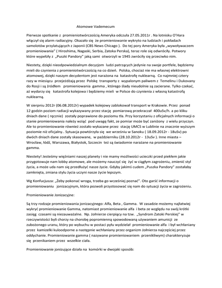 Atomowe Vademecum Pierwsze spotkanie z promieniotwórczością Ameryka odczuła 27.05.2011r . Na lotnisku O’Hara włączył się alarm radiacyjny. Okazało się że promieniowanie wykryto na ludziach i pokładach samolotów przylatujących z Japonii (CBS News Chicago ). Do tej pory Ameryka była „wywoływaczem promieniowania” ( Hiroshima, Nagaski, Serbia, Zatoka Perska), teraz role się odwróciły. Potwory które wypełzły z „Puszki Pandory” jaką sami otworzyli w 1945 zwróciły się przeciwko nim. Niestety, dzięki nieodpowiedzialnym decyzjom ludzi patrzących jedynie na swoje portfele, będziemy mieli do czynienia z promieniotwórczością na co dzień. Polska, chociaż nie ma własnej elektrowni atomowej, dzięki naszym decydentom jest narażona na katastrofę nuklearną. Co najmniej cztery razy w miesiącu przejeżdżają przez Polskę transporty z wypalonym paliwem z Temelinu i Dukovany do Rosji i są źródłem promieniowania gamma , którego ślady nieudolnie są zacierane. Tylko czekać, aż wydarzy się katastrofa kolejowa i będziemy mieli w Polsce do czynienia z własną katastrofą nuklearną. W sierpniu 2012r (06.08.2012r) wypadek kolejowy zablokował transport w Krakowie. Przez ponad 12 godzin poziom radiacji wykazywany przez stację pomiarową przekraczał 400uSv/h. a po kliku dniach dane ( ręcznie) zostały poprawione do poziomu tła. Przy korzystaniu z oficjalnych informacji o stanie promieniowania należy wziąć pod uwagę fakt, ze pomiar może być zaniżony z wielu przyczyn. Ale to promieniowanie również zostało wykazane przez stację UMCS w Lublinie na znacznie wyższym poziomie niż oficjalny.. Sytuacja powtórzyła się we wrześniu w Sanoku ( 18.09.2012r - 18uSv) po dwóch dniach dane zostały skasowane, w październiku (28.10.2012r - 13uSv ). Inne miasta – Wrocław, łódź, Warszawa, Białystok, Szczecin też są świadomie narażane na promieniowanie gamma. Niestety! Jesteśmy więźniami naszej planety i nie mamy możliwości ucieczki przed piekłem jakie przygotowuje nam lobby atomowe, ale możemy nauczyć się żyć w ciągłym zagrożeniu, zmienić styl życia, a może uda nam się przedłużyć nasze życie. Gdyby jakimś cudem „Puszka Pandory” zostałaby zamknięta, zmiana stylu życia uczyni nasze życie lepszym. Wg Konfucjusza: „Żeby pokonać wroga, trzeba go wcześniej poznać”. Oto garść informacji o promieniowaniu jonizacyjnym, która pozwoli przystosować się nam do sytuacji życia w zagrożeniu. Promieniowanie Jonizacyjne: Są trzy rodzaje promieniowania jonizacyjnego: Alfa, Beta , Gamma. W zasadzie możemy najłatwiej wykryć promieniowanie Gamma, natomiast promieniowanie alfa i beta ze względu na swój krótki zasięg czasami są niezauważalne. Np. żołnierze cierpiący na tzw. „Syndrom Zatoki Perskiej” w rzeczywistości byli chorzy na chorobę popromienną spowodowaną używaniem amunicji ze zubożonego uranu, który po wybuchu w postaci pyłu wydzielał promieniowanie alfa i był wchłaniany przez kamizelki kuloodporne a następnie wchłaniany przez organizm żołnierza najczęściej przez oddychanie. Promieniowanie gamma ( nazywane promieniowaniem przenikliwym) charakteryzuje się przenikaniem przez wszelkie ciała. Promieniowanie jonizujące działa na komórki w dwojaki sposób: 1. Przy dużym natężeniu promieniowania komórka zachowuje się jak jajko włożone do mikrofalówki – wybucha. 2. Małe dawki promieniowania przenikają do wewnątrz komórki i uszkadzają łańcuch DNA Przez wieki organizm ludzki ( i nie tylko ludzki) wypracował w sobie system obronny przed promieniowaniem jonizacyjnym przychodzącym z zewnątrz. Promieniowanie alfa i beta są wspaniale tłumione przez skórę. Owłosienie na ciele zwierząt w znacznym stopniu obniża promieniowanie gamma o niewielkiej intensywności. Szybkość podziału komórek umożliwia likwidację uszkodzonych bez szkody dla organizmu. Organizmy dostosowały się do promieniowania tła, które aż do XX wieku naszej ery pozostawało niezmienne i na niskim poziomie. Uran znajdował się głęboko pod ziemią i praktycznie nie wpływał na organizmy. Promieniowanie kosmiczne w dużym stopniu było blokowane przez warstwę ozonową i chmury. Tło promieniowania było stabilne. A teraz charakteryzuje się wielkimi skokami i organizmy nie potrafią nadrobić strat w komórkach w odpowiednim czasie, co skutkuje rozwojem komórek kancerogennych. Nukleoidy wytwarzane przez człowieka znajdują się w pożywieniu ( stront, cez rozrzucone na skutek wybuchu, są podobne do wapnia i magnezu i rośliny wykorzystują je do budowy własnych organizmów, tryt powstaje w wyniku działania promieniowania jonizacyjnego na wodę – jest setkami tysięcy ton wyrzucany do zbiorników wodnych podczas chłodzenia reaktorów atomowych). Spożycie tych nukleoidów powoduje, ze promieniowanie alfa, beta i gamma niszczy komórki od środka organizmu. Cez, stront i pluton spożyte w małych ilościach używane są do budowy kości zamiast wapnia stanowiąc stałe źródło promieniowania wewnątrz organizmu. Są organizmy ludzkie bardziej podatne na skutki działania promieniowania jonizacyjnego: Chorzy Kobiety w ciąży Starsi ludzie Dzieci, niemowlaki i płody ludzkie. Prawo Atomowe nakazuje te osoby szczególnie chronić przed promieniowaniem jonizującym, niestety, w razie katastrofy nuklearnej są one narażone w równym stopniu co pozostali ludzie. Czy jest wyjście z tej sytuacji w jakiej znalazł się świat dzięki niededukowanym naukowcom? Tak. Jest pożywienie, którego w normalnych warunkach należałoby unikać. Jest to pożywienie zawierające substancje goitrogenne (tiocyjanki-wolotwórcze) . W wypadku promieniotwórczego skażenia powietrza spożywanie produktów w stanie surowym nieprzetworzonym blokuje wchłanianie jodu i podobnych mu pierwiastków przez tarczycę. Gotowanie w pewnym stopniu zmniejsza to ryzyko. Jeżeli jednak jednocześnie będziemy spożywa