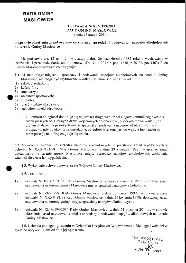 RADA G M IN Y M A S Ł O W IC E U C H W A Ł A N rX L V /199/2014 R A D Y G M IN Y M A SŁ O W IC E z dnia 27 marca 2014 r. w spraw ie określenia zasad usytuow ania m iejsc sprzedaży i podaw ania na terenie G m iny M asłow ice napojów alkoholowych N a podstawie art. 12 ust. 2 i 4 ustawy z dnia 26 października 1982 roku o wychowaniu w trzeźwości i przeciwdziałaniu alkoholizmowi (Dz. U. z 2012 r. poz. 1356, z 2013r. poz.1563) Rada Gm iny M asłowice uchwala co następuje: § 1. 1.Ustala się,że miejsca sprzedaży i podawania napojów alkoholowych na terenie Gminy M asłowice nie m o g ą być usytuow ane w odległości mniejszej niż 15 m od: 1) szkół, przed szkol i; 2) kościołów ; 3) cmentarzy ; 4) obiektów sportowych; 5) bibliotek; 6) ' placów zabaw dla dzieci; 7) - zakładów opieki zdrowotnej . 1. 2. Pomiaru odległości dokonuje się najkrótszą drogą wzdłuż osi ciągów komunikacyjnych dla ruchu pieszych od głównych drzwi wejściowych do obiektów , o których m ow a w ust. 1 , do głównych drzwi w ejściow ych miejsc sprzedaży i podawania napojów alkoholowych, a w przypadku, gdy obiekty te są ogrodzone, odległość mierzona jest do wejścia lub wjazdu na teren posesji, na której znajduje się obiekt. § 2. Zezwolenia wydane na sprzedaż napojów alkoholowych na podstawie zasad wynikających z uchwały N r X X X I/191/98 Rady Gm iny M asłowice z dnia 29 kwietnia 1998r. w sprawie zasad usytuow ania na terenie gm iny M asłowice miejsc sprzedaży napojów alkoholowych zachowują ważność do czasu ich wygaśnięcia. § 3. W ykonanie uchwały pow ierza się Wójtowi Gminy Masłowice. § 4. Traci m oc : 1) uchwała N r X X X I/191/98 Rady Gm iny M asłowice z dnia 29 kwietnia 1998r. w sprawie zasad usytuow ania na terenie gm iny Masłowice miejsc sprzedaży napojów alkoholowych 2) uchwała N r VI/51 /99 Rady Gm iny Masłowice z dnia 30 marca 1999r. w sprawie zmiany uchwały N r X X X 1/191/98 Rady Gm iny M asłowice z dnia 29 kwietnia 1998r. dotyczącej zasad usytuowania na terenie gm iny miejsc sprzedaży napojów alkoholowych , 3) uchwała N r XL1V/194/2014 Rady Gm iny M asłowice z dnia 31 stycznia 2014r.r. w sprawie określenia zasad usytuow ania miejsc sprzedaży i podawania napojów alkoholowych na terenie Gminy Masłowice. § 5. Uchwała podlega ogłoszeniu w Dzienniku Urzędowym W ojewództwa Łódzkiego i wchodzi w życie po upływie 14 dni od dnia jej ogłoszenia.