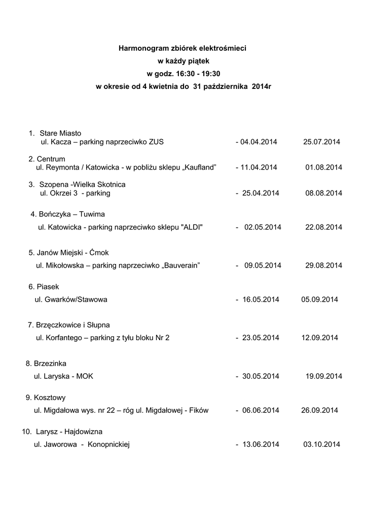 Harmonogram zbiórek elektrośmieci w każdy piątek w godz. 16:30 - 19:30 w okresie od 4 kwietnia do 31 października 2014r 1. Stare Miasto ul. Kacza – parking naprzeciwko ZUS - 04.04.2014 25.07.2014 2. Centrum ul. Reymonta / Katowicka - w pobliżu sklepu „Kaufland” - 11.04.2014 01.08.2014 3. Szopena -Wielka Skotnica ul. Okrzei 3 - parking - 25.04.2014 08.08.2014 - 02.05.2014 22.08.2014 - 09.05.2014 29.08.2014 4. Bończyka – Tuwima ul. Katowicka - parking naprzeciwko sklepu "ALDI" 5. Janów Miejski - Ćmok ul. Mikołowska – parking naprzeciwko „Bauverain” 6. Piasek ul. Gwarków/Stawowa - 16.05.2014 05.09.2014 - 23.05.2014 12.09.2014 7. Brzęczkowice i Słupna ul. Korfantego – parking z tyłu bloku Nr 2 8. Brzezinka ul. Laryska - MOK - 30.05.2014 19.09.2014 9. Kosztowy ul. Migdałowa wys. nr 22 – róg ul. Migdałowej - Fików - 06.06.2014 26.09.2014 - 13.06.2014 03.10.2014 10. Larysz - Hajdowizna ul. Jaworowa - Konopnickiej 11. Krasowy ul. PCK - plac zabaw - 27.06.2014 10.10.2014 - 04.07.2014 17.10.2014 - 11.07.2014 24.10.2014 - 18.07.2014 31.10.2014 12. Morgi ul. Ofiar Września - przy "Trójkącie" 13. Wesoła- Ławki ul. Kryształowa - przy boisku 14. Dziećkowice ul. Długa - koło krzyża