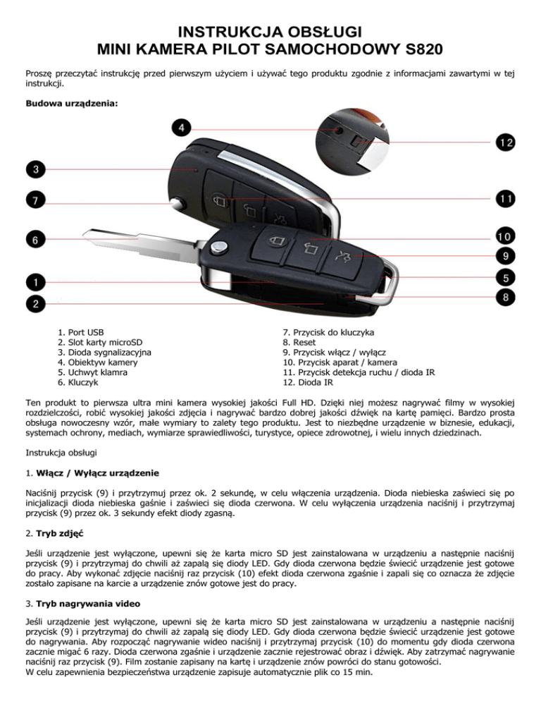 INSTRUKCJA OBSŁUGI MINI KAMERA PILOT SAMOCHODOWY S820 Proszę przeczytać instrukcję przed pierwszym użyciem i używać tego produktu zgodnie z informacjami zawartymi w tej instrukcji. Budowa urządzenia: 1. 2. 3. 4. 5. 6. Port USB Slot karty microSD Dioda sygnalizacyjna Obiektyw kamery Uchwyt klamra Kluczyk 7. Przycisk do kluczyka 8. Reset 9. Przycisk włącz / wyłącz 10. Przycisk aparat / kamera 11. Przycisk detekcja ruchu / dioda IR 12. Dioda IR Ten produkt to pierwsza ultra mini kamera wysokiej jakości Full HD. Dzięki niej możesz nagrywać filmy w wysokiej rozdzielczości, robić wysokiej jakości zdjęcia i nagrywać bardzo dobrej jakości dźwięk na kartę pamięci. Bardzo prosta obsługa nowoczesny wzór, małe wymiary to zalety tego produktu. Jest to niezbędne urządzenie w biznesie, edukacji, systemach ochrony, mediach, wymiarze sprawiedliwości, turystyce, opiece zdrowotnej, i wielu innych dziedzinach. Instrukcja obsługi 1. Włącz / Wyłącz urządzenie Naciśnij przycisk (9) i przytrzymuj przez ok. 2 sekundę, w celu włączenia urządzenia. Dioda niebieska zaświeci się po inicjalizacji dioda niebieska gaśnie i zaświeci się dioda czerwona. W celu wyłączenia urządzenia naciśnij i przytrzymaj przycisk (9) przez ok. 3 sekundy efekt diody zgasną. 2. Tryb zdjęć Jeśli urządzenie jest wyłączone, upewni się że karta micro SD jest zainstalowana w urządzeniu a następnie naciśnij przycisk (9) i przytrzymaj do chwili aż zapalą się diody LED. Gdy dioda czerwona będzie świecić urządzenie jest gotowe do pracy. Aby wykonać zdjęcie naciśnij raz przycisk (10) efekt dioda czerwona zgaśnie i zapali się co oznacza że zdjęcie zostało zapisane na karcie a urządzenie znów gotowe jest do pracy. 3. Tryb nagrywania video Jeśli urządzenie jest wyłączone, upewni się że karta micro SD jest zainstalowana w urządzeniu a następnie naciśnij przycisk (9) i przytrzymaj do chwili aż zapalą się diody LED. Gdy dioda czerwona będzie świecić urządzenie jest gotowe do nagrywania. Aby rozpocząć nagrywanie wideo naciśnij i przytrzymaj przycisk (10) do momentu gdy dioda czerwona zacznie migać 6 razy. Dioda czerwona zgaśnie i urządzenie zacznie rejestrować obraz i dźwięk. Aby zatrzymać nagrywanie naciśnij raz przycisk (9). Film zostanie zapisany na kartę i urządzenie znów powróci do stanu gotowości. W celu zapewnienia bezpieczeństwa urządzenie zapisuje automatycznie plik co 15 min. 4. Tryb nagrywania video (detekcja ruchu) Jeśli urządzenie jest wyłączone, upewni się że karta micro SD jest zainstalowana w urządzeniu a następnie naciśnij przycisk (9) i przytrzymaj do chwili aż zapalą się diody LED. Gdy dioda czerwona będzie świecić urządzenie jest gotowe do pracy. Aby uruchomić urządzenie w trybie detekcji ruchu naciśnij i przytrzymaj przycisk (11) do momentu gdy dioda czerwona i niebieska zaczną migać 6 razy. Diody zgasną i urządzenie uruchomi czujnik detekcji ruchu. Gdy pojawi się obiekt lub zmieni się światło przed obiektywem dioda niebieska mignie jeden raz i kamera zacznie rejestrować obraz i dźwięk. Urządzenie zapisuje plik co 3 min jeśli obiekt nie pojawi się ponownie kamera nie będzie nagrywać. 5. Tryb pracy w nocy (night vision) Jeśli urządzenie jest włączone naciśnij jeden raz przycisk (11) aby uruchomić diodę IR. Tryb nocny zostanie włączony i wbudowana dioda IR doświetli obszar do 2,5m w zasięgu obiektywu. Aby wyłączyć tryb pracy w nocy naciśnij ponownie jeden raz przycisk (11). 6. Dysk wymienny Gdy urządzenie zostanie podłączone do komputera za pomocą gniazda USB zostanie wykryte jako przenośna pamięć USB. Komputer wyświetli logo dysku, a także obraz katalogu plików. W czasie transferu danych pomiędzy kamerą a komputerem, gwałtownie miga dioda. W celu odłączenia urządzenia kliknij na prawy dolny róg paska zadań w opcję „BEZPIECZNE USUWANIE SPRZĘTU”, a następnie zatrzymaj urządzenie pamięci masowej USB i odłącz urządzenie. Uwaga: Zgodnie z różnicami systemu konfiguracji lub komputera czas potrzebny na wykrycie dysku przenośnego może się nieznacznie różnić. Prosimy zatem o cierpliwość, gdyż w tym czasie nie powinno się korzystać z urządzenia z uwagi na uniknięcie oddziaływania sprzętu komputerowego. W przypadku, gdy dysk przenośny nie zostaje wykryty przez dłuższy czas, należy podjąć próbę ponownego umieszczenia urządzenia. Jeśli nadal nie jest możliwe zidentyfikowanie nowego sprzętu, upewnij się, że używany system operacyjny, sterowniki i kabel połączenia USB są normalne. Zaleca się odinstalowanie urządzenia, aby uniknąć uszkodzenia komputera lub urządzenia. 7. Ładowanie akumulatora Podłącz urządzenie do portu USB komputera lub ładowarki. Podczas ładowania niebieska dioda będzie pulsować powoli czerwona dioda świeci na stałe. Po naładowaniu akumulatora niebieska dioda gaśnie, czerwona dioda świeci. Uwaga: Urządzenie posiada wbudowaną baterię litowo-polimerową o dużej wydajności. Bateria nie posiada funkcji pamięci, zatem możesz ją używać i ładować za każdym razem. Przez pięć pierwszych cykli ładowania prosimy ładować ją do pełnego naładowania po jej całkowitym wyczerpaniu. Operacje należy wykonać w celu aktywowania pełnej wydajności baterii i utrzymania standardowego czasu jej pracy. Aby zmaksymalizować wydajność akumulacyjną baterii prosimy o kontynuowanie procesu ładowania przez okres 30 min. do 1 godziny po tym jak lampka sygnalizacyjna przestanie migać. 8. Ustawienie daty i czasu Urządzenie umożliwia wyświetlanie daty i czasu na tle filmu. Po podłączeniu urządzenia do komputera, tworzymy w głównym folderze za pomocą edytora tekstu plik tekstowy time.txt o formacie: rok, miesiąc, dzień, (spacja), godzina, minuty, sekundy, wpisując aktualną datę i czas, np: 2010-04-30 10:45:00. Po zapisaniu pliku odłączamy urządzenie od komputera. Po włączeniu ur