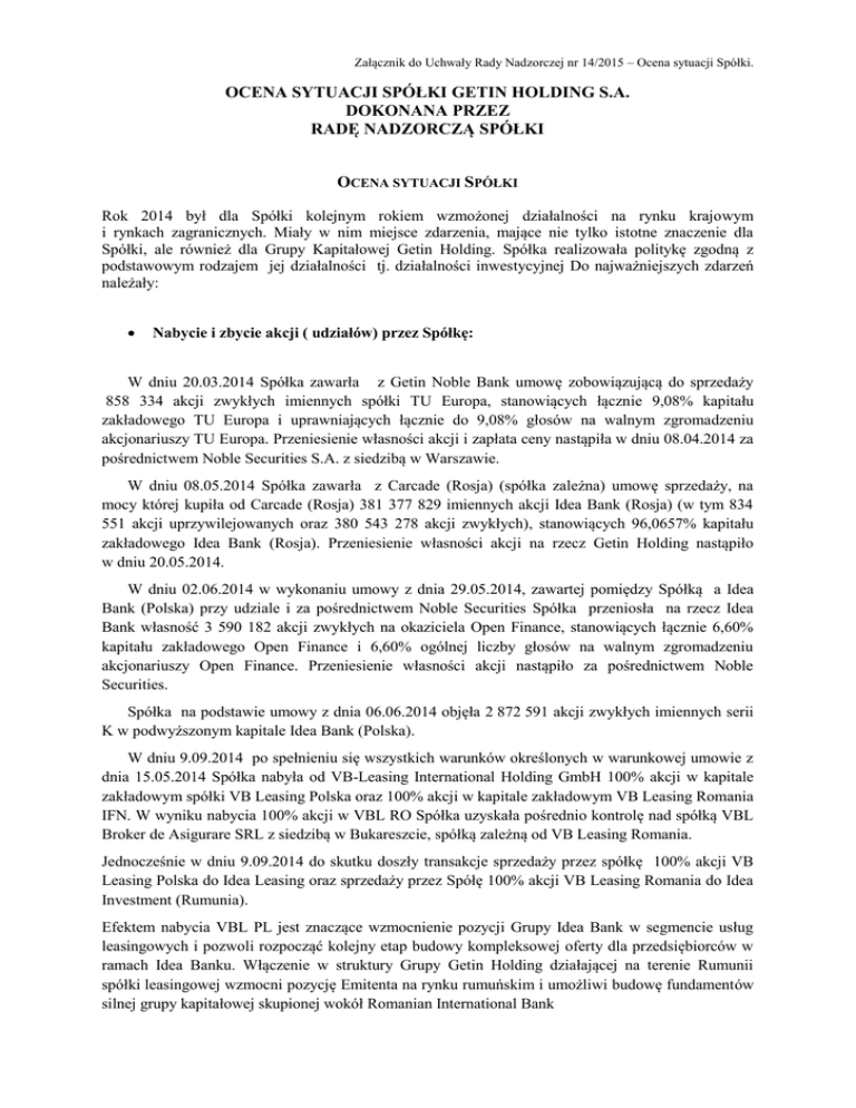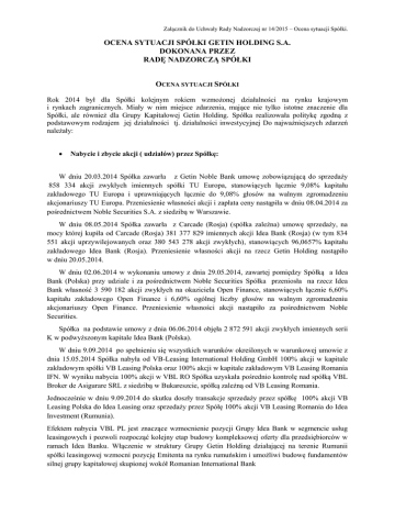 Załącznik do Uchwały Rady Nadzorczej nr 14/2015 – Ocena sytuacji Spółki. OCENA SYTUACJI SPÓŁKI GETIN HOLDING S.A. DOKONANA PRZEZ RADĘ NADZORCZĄ SPÓŁKI OCENA SYTUACJI SPÓŁKI Rok 2014 był dla Spółki kolejnym rokiem wzmożonej działalności na rynku krajowym i rynkach zagranicznych. Miały w nim miejsce zdarzenia, mające nie tylko istotne znaczenie dla Spółki, ale również dla Grupy Kapitałowej Getin Holding. Spółka realizowała politykę zgodną z podstawowym rodzajem jej działalności tj. działalności inwestycyjnej Do najważniejszych zdarzeń należały: Nabycie i zbycie akcji ( udziałów) przez Spółkę: W dniu 20.03.2014 Spółka zawarła z Getin Noble Bank umowę zobowiązującą do sprzedaży 858 334 akcji zwykłych imiennych spółki TU Europa, stanowiących łącznie 9,08% kapitału zakładowego TU Europa i uprawniających łącznie do 9,08% głosów na walnym zgromadzeniu akcjonariuszy TU Europa. Przeniesienie własności akcji i zapłata ceny nastąpiła w dniu 08.04.2014 za pośrednictwem Noble Securities S.A. z siedzibą w Warszawie. W dniu 08.05.2014 Spółka zawarła z Carcade (Rosja) (spółka zależna) umowę sprzedaży, na mocy której kupiła od Carcade (Rosja) 381 377 829 imiennych akcji Idea Bank (Rosja) (w tym 834 551 akcji uprzywilejowanych oraz 380 543 278 akcji zwykłych), stanowiących 96,0657% kapitału zakładowego Idea Bank (Rosja). Przeniesienie własności akcji na rzecz Getin Holding nastąpiło w dniu 20.05.2014. W dniu 02.06.2014 w wykonaniu umowy z dnia 29.05.2014, zawartej pomiędzy Spółką a Idea Bank (Polska) przy udziale i za pośrednictwem Noble Securities Spółka przeniosła na rzecz Idea Bank własność 3 590 182 akcji zwykłych na okaziciela Open Finance, stanowiących łącznie 6,60% kapitału zakładowego Open Finance i 6,60% ogólnej liczby głosów na walnym zgromadzeniu akcjonariuszy Open Finance. Przeniesienie własności akcji nastąpiło za pośrednictwem Noble Securities. Spółka na podstawie umowy z dnia 06.06.2014 objęła 2 872 591 akcji zwykłych imiennych serii K w podwyższonym kapitale Idea Bank (Polska). W dniu 9.09.2014 po spełnieniu się wszystkich warunków określonych w warunkowej umowie z dnia 15.05.2014 Spółka nabyła od VB-Leasing International Holding GmbH 100% akcji w kapitale zakładowym spółki VB Leasing Polska oraz 100% akcji w kapitale zakładowym VB Leasing Romania IFN. W wyniku nabycia 100% akcji w VBL RO Spółka uzyskała pośrednio kontrolę nad spółką VBL Broker de Asigurare SRL z siedzibą w Bukareszcie, spółką zależną od VB Leasing Romania. Jednocześnie w dniu 9.09.2014 do skutku doszły transakcje sprzedaży przez spółkę 100% akcji VB Leasing Polska do Idea Leasing oraz sprzedaży przez Spółę 100% akcji VB Leasing Romania do Idea Investment (Rumunia). Efektem nabycia VBL PL jest znaczące wzmocnienie pozycji Grupy Idea Bank w segmencie usług leasingowych i pozwoli rozpocząć kolejny etap budowy kompleksowej oferty dla przedsiębiorców w ramach Idea Banku. Włączenie w struktury Grupy Getin Holding działającej na terenie Rumunii spółki leasingowej wzmocni pozycję Emitenta na rynku rumuńskim i umożliwi budowę fundamentów silnej grupy kapitałowej skupionej wokół Romanian International Bank Pozostałe zdarzenia W dniu 30.05.2014 Dom Maklerski Noble Securities S.A. nabył w imieniu własnym, na rachunek Spółki , poza rynkiem regulowanym, 21 917 808 akcji własnych Spółki które stanowią 3% udziału w kapitale zakładowym Spółki oraz uprawniają do 21 917 808 głosów na walnym zgromadzeniu Spółki, co stanowi 3% ogólnej liczby głosów na walnym zgromadzeniu Spółki. Spółka zakończyła prowadzony w latach 2011 – 2014 Program Opcji Menadżerskich, w wyniku którego wprowadzono do obrotu łącznie 1 204 049 akcji serii P. Począwszy od dnia 13.08.2014 r. wysokość kapitału zakładowego Getin Holding wynosi 731 289 368 zł. W 2014 roku Spółka sprawowała nadzór właścicielski nad spółkami z sektora finansowego wchodzącym i w skład jej portfela inwestycyjnego. W obliczu znaczących spadków wartości walut krajowych w Rosji, Ukrainie i Białorusi, zwłaszcza w IV kwartale 2014, a także wysokiego poziomu inflacji w tych krajach, Getin Holding koncentrował się na przeciwdziałaniu efektom negatywnej sytuacji w Europie Wschodniej. Precyzyjne zarządzanie ryzykiem kredytowym i wzmocnienie dyscypliny płatniczej pozwoliło na utrzymanie właściwych wskaźników nadzorczych, płynnościowych i dyscypliny kosztowej, a także na utrzymanie stabilnego poziomu depozytów od klientów. Należy stwierdzić, że wskazane wyżej zdarzenia przełożyły się na zadawalający wynik finansowy na koniec roku 2014. Mając na uwadze powyższe, Rada Nadzorcza pozytywnie ocenia działalność Spółki w roku 2014, która efektywnie realizowała przyjęte plany i założenia. Rada Nadzorcza ocenia pozytywnie działalność Zarządu Spółki w roku 2014. OCENA SYSTEMU KONTROLI WEWNĘTRZNEJ I SYSTEMU ZARZĄDZANIA RYZYKIEM ISTOTNYM DLA SPÓŁKI I GRUPY KAPITAŁOWEJ System Kontroli Wewnętrznej funkcjonujący w Spółce w roku 2014 oparto na 3 linach obrony: Linia pierwsza to mechanizmy kontroli ryzyka zawarte w regulacjach wewnętrznych oraz w systemach informatycznych, Linia druga to jednostki wspierające Zarząd w identyfikacji i zarządzaniu ryzykiem oraz kontrola funkcjonalna, Linia trzecia to Audyt Wewnętrzny, którego zadania są realizowane przez Departament Audytu Spółki, podlegający Członkowi Zarządu Spółki odpowiedzialnemu za Audyt Wewnętrzny. Efektywność i prawidłowość działania mechanizmów kontroli ryzyka w tym wykonywania kontroli funkcjonalnej i identyfikacji ryzyka weryfikowano, zgodnie z zatwierdzonym przez Rady Nadzorcze Spółek Zależnych Rocznymi Planami Audytu, przez Audytorów Wewnętrznych Spółki i poszczególnych Spółek zależnych, którzy regularnie przekazywali swoje uwagi i zalecenia Zarządowi Sp