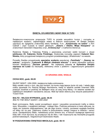 ŚWIĘTA, SYLWESTER I NOWY ROK W TVP2 Świąteczno-noworoczne propozycje TVP2 to przede wszystkim humor i rozrywka w najlepszym wydaniu, zapewniające relaks w dobrym towarzystwie. W Święta Dwójka zaprasza do oglądania znakomitej oferty familijnej, m.in. „Księżniczka na lodzie” z Kim Cattrall i Joan Cusack w rolach głównych, „Asterix i Obelix: Misja Kleopatra” ze znakomitym Gerardem Depardieu oraz „Królową być” z Catherine Denevue. Rodzinne Święta z Telewizją Polską z pewnością urozmaici wielki koncert z okazji jubileuszu 25. Kabaretu Konia Polskiego. Doskonałą rozrywkę zapewni Kabaret NeoNówka, który przygotował świąteczny program przedstawiający „Wiadomości” na wesoło. Ponadto Dwójka przygotowała specjalne wydania popularnej „Familiady” i „Szansy na sukces”, programu „Laskowik & Malicki niedziela wieczór” a także niezwykle rodzinny koncert świąteczny „Zacisze gwiazd”. Na najlepszą zabawę w Sylwestra Dwójka zaprasza do Łodzi na niezwykły, efektowny show z polskimi i zagranicznymi gwiazdami estrady. 24 GRUDNIA 2009, WIGILIA CICHA NOC, godz. 06.05 SILENT NIGHT, USA 2000, świąteczna bajka animowana. Mały osiołek marzy o tym, aby być koniem, bo konie mają lepsze życie niż osły. I wtedy jego ciotka opowiada mu historię Bożego Narodzenia, kiedy to właśnie osiołek imieniem Abib posłużył Józefowi w podróży do Betlejem wraz ze swą żoną Marią. I to właśnie osiołek był najbliższym świadkiem narodzenia Jezusa. Abib był także obecny przy wizycie pastuszków i Trzech Króli. BALTO - WILCZA WYPRAWA, godz. 06.55 BALTO THE WOLF QUEST, USA 2002 Baśń animowana. Balto został szczęśliwym ojcem i wszystkie szczeniaczki trafiły w dobre ręce. Wszystkie, z wyjątkiem jednego - małego Aleu. Podczas polowania w lesie odkrywa, że nigdy nie zostanie zaakceptowany, tak jak jego bracia i siostry, ponieważ wygląda bardziej na wilka niż na psa. Załamany ucieka w poszukiwaniu swego miejsca w świecie i sensu życia. Zaniepokojony Balto, nawiedzany przez dziwne sny, w których występuje tajemniczy biały wilk i kruk wyrusza, by przyłączyć się do Aleu. I tak rozpoczyna się niezwykła przygoda pośród lodowatych, niegościnnych bezkresów Alaski. W POSZUKIWANIU ŚWIĘTEGO MIKOŁAJA, godz. 08.10 1 Postać Świętego Mikołaja wydaje się powszechnie i od zawsze znana. Tymczasem wizerunek uśmiechniętego staruszka z biała brodą i torbą pełna prezentów, na sankach zaprzężonych w renifery, narodził się stosunkowo niedawno. Przeznaczony na święta dokument pokazuje Świętego Mikołaja jako postać, na którą złożyło się wiele tradycji i kultur z całego świata. LISICZKA, godz. 09.05 KOGITSUNE HELEN Film dla młodych widzów. Ciepła, wzruszająca opowieść o chłopcu, który zaopiekował się porzuconym lisim szczenięciem. 7-letni Taichi mieszka na wsi na wyspie Hokkaido. Chłopiec jest obdarzony żywą wyobraźnią, potrafi wymyślać niezwykłe historie, ale właśnie dlatego trudno mu znaleźć wspólny język z innymi dziećmi w szkole, które uważają go za dziwaka. Takie niezwykłe historie wymyśla dla Taichiego jego mama, która jest fotografem i z powodu swojej pracy często musi wyjeżdżać w odległe strony. Chłopiec bardzo wtedy za nią tęskni. Pewnego dnia Taichi znajduje przy drodze porzuconą maleńką lisiczkę. Zwierzątko jest głuchonieme i niewidome. Chłopiec zanosi je na posterunek policji, przekonany, że ktoś liska zgubił. Policjant kieruje go jednak do miejscowego weterynarza Koji Yajimy, który niezbyt chętnie zgadza się zająć zwierzątkiem, powtarzając, że dość ma już „podrzutków", na których nic nie może zarobić. Taichi faktycznie nie może mu zapłacić, ale stara się odpracować u weterynarza koszty opieki nad lisiczką. Z czasem lisiczka coraz bardziej przywiązuje się do chłopca. Rodzi się między nimi prawdziwa przyjaźń. Reż: Keita Kono Wyst: Takao Osawa, Yasuko Matsuyuki, Arashi Fukasawa, Ryoko Kobayashi JEŹDZIEC ZNIKĄD, godz. 11.55 SHANE Absolutna klasyka westernu. Shane przyjeżdża nie wiadomo skąd, zatrzymuje się u rodziny Starrettów, która jest terroryzowana wraz z innymi rolnikami przez bandy wynajęte dla ochrony interesów wielkich hodowców bydła. Shane staje się bohaterem dla rodziny Starrettów, zwłaszcza dla małego Joey'a. Broni rolników przed zbirami wynajętymi przez Rykera. Zabija czarne charaktery i odjeżdża nie wiadomo dokąd. Reż.: George Stevens Wyst: Alan Ladd, Jean Arthur, Van Heflin, Jack Palance GRINCH: ŚWIĄT NIE BĘDZIE, godz. 14.55 HOW THE GRINCH STOLE CHRISTMAS USA 2000 Wysoko, daleko, „na samym gór szczycie w łańcuchu Samosiów” na Mont Zsypie, nieco na północ od miasteczka, pewien stwór jaskiniowy podpatruje w maleńkim płatku śniegu jak to na dole w Ktosiowie, Ktosie gorączkowo przygotowują się do ukochanych świąt Bożego Narodzenia. Kim jest ten włochacz z kwaśną miną? To nie kto inny jak Grinch (Jim Carrey), który jak sam przyznaje wprost nienawidzi Gwiazdki i ma już po dziurki w nosie tych radosnych krzyków, śpiewów i zabawy. Nikt nie potrafi odgadnąć dlaczego Grinch jest taki ... Grinchowaty. Nikt bez wyjątku, nawet jego jedyny kompan, wiecznie przez niego nękany pies Maks. Z przebrzydłym uśmiechem, Grinch wpada na nowy szelmowski pomysł, jak by tu raz na zawsze pozbyć się tak znienawidzonych przez niego świąt. Przywdziewa kostium, który ma mu pomóc zwieść czujnych Ktosiów i w nowym przebraniu składa wizytę w Ktosiowie, pragnąc zrealizować swój własny gwiazdkowy plan… Reż: Ron Howard Wyk: Jim Carrey, Anthony Hopkins, Christine Baranski DO BETLEJEM – WIECZÓR KOLĘD Z PRZYJACIÓŁMI ZACZAROWANEJ PIOSENKI, godz. 16.40 2 Uroczysty koncert kolęd, który odbędzie się w kościele św. Jana w Gdańsku. Wystąpią Finaliści Festiwalu Zaczarowanej Piosenki z lat 2006 i 2007 oraz artyści i aktorzy m. in. Olga Bończyk, Mirosław Cz