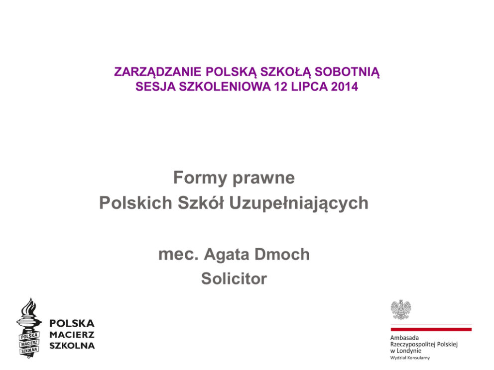 ZARZĄDZANIE POLSKĄ SZKOŁĄ SOBOTNIĄ SESJA SZKOLENIOWA 12 LIPCA 2014 Formy prawne Polskich Szkół Uzupełniających mec. Agata Dmoch Solicitor ZARZĄDZANIE POLSKĄ SZKOŁĄ SOBOTNIĄ SESJA SZKOLENIOWA 12 LIPCA 2014 Miejsce polskich szkół na mapie organizacji w UK oraz zwierzchnictwo ZARZĄDZANIE POLSKĄ SZKOŁĄ SOBOTNIĄ SESJA SZKOLENIOWA 12 LIPCA 2014 Formy prawne • Unincorporated Association (Stowarzyszenie) • Charitable Incorporated Organisations • Company Limited by Guarantee • Community Interest Company • Charity (incorporated lub unincorporated) • Duża dowolność wyboru ze względu na potrzeby organizacji non-profit ZARZĄDZANIE POLSKĄ SZKOŁĄ SOBOTNIĄ SESJA SZKOLENIOWA 12 LIPCA 2014 Miejsce polskich szkół na mapie organizacji w UK oraz zwierzchnictwo ZARZĄDZANIE POLSKĄ SZKOŁĄ SOBOTNIĄ SESJA SZKOLENIOWA 12 LIPCA 2014 Przyjęte Założenia • Cel działalność społeczna (non-profit) • Niskie opłaty • Organizacja będzie się starać o dofinansowanie • Głównym celem jest nauka • Pracujemy z dziećmi • Zarząd to głównie Wy • Organizacja nie ma lub ma niewielki kapitał/dobra trwałe (budynki, samochody, sprzęt etc.) ZARZĄDZANIE POLSKĄ SZKOŁĄ SOBOTNIĄ SESJA SZKOLENIOWA 12 LIPCA 2014 Objectives/Cele Organizacji? ZARZĄDZANIE POLSKĄ SZKOŁĄ SOBOTNIĄ SESJA SZKOLENIOWA 12 LIPCA 2014 Objectives/Cele Co będzie celami organizacji? Jeżeli Registered Chairty to Cele są odgórnie wyznaczone i muszą być „wholly and exclusively charitable” The advancement of education; The advancement of religion; The advancement of citizenship or community development; The advancement of the arts, culture, heritage or science; The advancement of amateur sport; Jeżeli nie Registered Chairty to Cele są dowolne (NB dofinansowanie) ZARZĄDZANIE POLSKĄ SZKOŁĄ SOBOTNIĄ SESJA SZKOLENIOWA 12 LIPCA 2014 Przykład ZARZĄDZANIE POLSKĄ SZKOŁĄ SOBOTNIĄ SESJA SZKOLENIOWA 12 LIPCA 2014 Decyzja o formie – co należy rozważyć: • Odpowiedzialność osobista • Własność • Fundusze i dofinansowanie • Zarządzanie • Zysk ZARZĄDZANIE POLSKĄ SZKOŁĄ SOBOTNIĄ SESJA SZKOLENIOWA 12 LIPCA 2014 W każdej konstytucji: Nazwa – sprawdzić czy już nie istnieje Cele Uprawnienia zarządu Zarząd oraz jego wybór Zgromadzenia i głosowanie Członkowstwo Rozliczenia roczne Konta Zarząd oraz powiązania Nieruchomości i dobra Inwestowanie Zmiany Rozwiązanie Prawo poszczególnych funkcjonariuszy do wiązania członków. ZARZĄDZANIE POLSKĄ SZKOŁĄ SOBOTNIĄ SESJA SZKOLENIOWA 12 LIPCA 2014 Unincorporated Association (Stowarzyszenie) ZARZĄDZANIE POLSKĄ SZKOŁĄ SOBOTNIĄ SESJA SZKOLENIOWA 12 LIPCA 2014 Formalności Nie ma ustawowej definicji Stowarzyszenia Lawton LJ in Conservative and Unionist Central Office v Burrell "two or more persons bound together for one or more common purposes, not being business purposes, by mutual undertakings each having mutual duties and obligations, in an organisation which has rules which identify in whom control of it and its funds rests and on what terms and which can be joined or left at will„ ZARZĄDZANIE POLSKĄ SZKOŁĄ SOBOTNIĄ SESJA SZKOLENIOWA 12 LIPCA 2014 Pełna odpowiedzialność zarządu (wynajem, pracownicy, umowy etc.) Bez rejestracji (wystarczy, że “two or more persons bound together for one or more common purpose”) Potrzebna jest konstytucja/ zasady stowarzyszenia (Rules/Constitution) Zarządza zarząd Głosują członkowie Można określić kto ma prawo głosu i w jakich sprawach ZARZĄDZANIE POLSKĄ SZKOŁĄ SOBOTNIĄ SESJA SZKOLENIOWA 12 LIPCA 2014 Unincorporated Association (Stowarzyszenie) Przykład konstytucji Stowarzyszenia • Model constitution for charitable unincorporated associations • http://www.charitycommission.gov.uk/media/94739/gd3text.pdf ZARZĄDZANIE POLSKĄ SZKOŁĄ SOBOTNIĄ SESJA SZKOLENIOWA 12 LIPCA 2014 Unincorporated Association (Stowarzyszenie) Za i przeciw: • Łatwość i dowolność w prowadzeniu • Nieograniczona odpowiedzialność ZARZĄDZANIE POLSKĄ SZKOŁĄ SOBOTNIĄ SESJA SZKOLENIOWA 12 LIPCA 2014 • Charitable Incorporated Organisations ZARZĄDZANIE POLSKĄ SZKOŁĄ SOBOTNIĄ SESJA SZKOLENIOWA 12 LIPCA 2014 Charitable Incorporated Organisations Rejestracja: • Obowiązkowa rejestracja w the Charity Commision (CC) “Wholly and exclusively charitable” Incorporated – więc ma osobną osobowość prawną i wstępuje w umowy jako osobny twór, a nie jako zarząd Odpowiedzialność zarządu jest ograniczona Potrzebna jest konstytucja Zarządzają trustees Obowiązkowe annual return i accounts do CC Obowiązkowa lista trustees oraz członków Dwa modele (association oraz foundation) ZARZĄDZANIE POLSKĄ SZKOŁĄ SOBOTNIĄ SESJA SZKOLENIOWA 12 LIPCA 2014 • Charitable Incorporated Organisations • https://www.deloitte.com/assets/Dcom- UnitedKingdom/Local%20Assets/Documents/Industries/uk-charitycharitable-incorporated-organisations.pdf (Rozdział 1 porównanie CIO z innymi formami, Rozdział 2 zakładanie CIO, Rozdział 3 przekształcanie istniejących organizacji w CIO). • Różnica pomiędzy CIO association v foundation • Co powinna zawierać konstytucja • http://www.charitycommission.gov.uk/media/94471/CIO- FoundationModelConstitution.pdf • http://www.charitycommission.gov.uk/media/94463/CIOAssociationModelConstitution.pdf ZARZĄDZANIE POLSKĄ SZKOŁĄ SOBOTNIĄ SESJA SZKOLENIOWA 12 LIPCA 2014 Charitable Incorporated Organisations Za i przeciw Ograniczona odpowiedzialność Najłatwiejsza forma z tych, które dają ochronę zarządowi, wiąże się jednak z większą ilością biurokracji niż Stowarzyszenie Nowa forma prawna, więc wiele niewiadomych ZARZĄDZANIE POLSKĄ SZKOŁĄ SOBOTNIĄ SESJA SZKOLENIOWA 12 LIPCA 2014 Company Limited by Guarantee ZARZĄDZANIE POLSKĄ SZKOŁĄ SOBOTNIĄ SESJA SZKOLENIOWA 12 LIPCA 2014 Company Limited by Guarantee – Rejestracja Rejestracja: • W Companies House (Form IN01); £15 lub £40 Nazwa & „Li