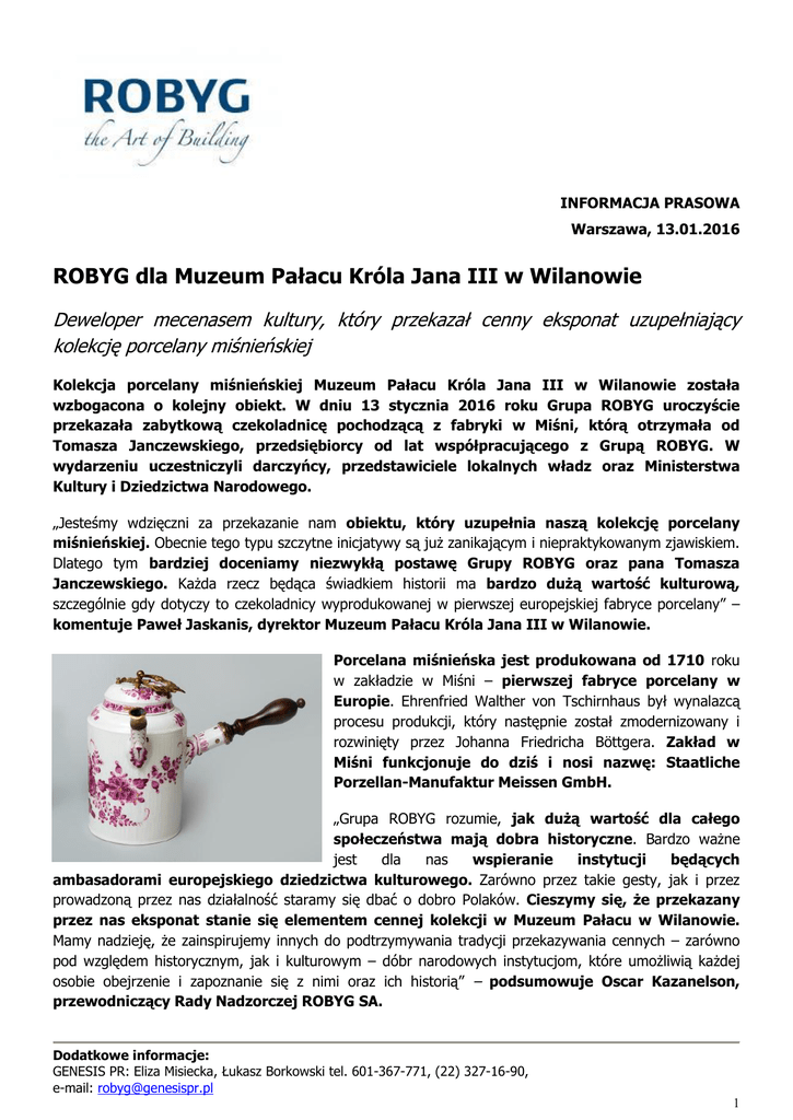 INFORMACJA PRASOWA Warszawa, 13.01.2016 ROBYG dla Muzeum Pałacu Króla Jana III w Wilanowie Deweloper mecenasem kultury, który przekazał cenny eksponat uzupełniający kolekcję porcelany miśnieńskiej Kolekcja porcelany miśnieńskiej Muzeum Pałacu Króla Jana III w Wilanowie została wzbogacona o kolejny obiekt. W dniu 13 stycznia 2016 roku Grupa ROBYG uroczyście przekazała zabytkową czekoladnicę pochodzącą z fabryki w Miśni, którą otrzymała od Tomasza Janczewskiego, przedsiębiorcy od lat współpracującego z Grupą ROBYG. W wydarzeniu uczestniczyli darczyńcy, przedstawiciele lokalnych władz oraz Ministerstwa Kultury i Dziedzictwa Narodowego. „Jesteśmy wdzięczni za przekazanie nam obiektu, który uzupełnia naszą kolekcję porcelany miśnieńskiej. Obecnie tego typu szczytne inicjatywy są już zanikającym i niepraktykowanym zjawiskiem. Dlatego tym bardziej doceniamy niezwykłą postawę Grupy ROBYG oraz pana Tomasza Janczewskiego. Każda rzecz będąca świadkiem historii ma bardzo dużą wartość kulturową, szczególnie gdy dotyczy to czekoladnicy wyprodukowanej w pierwszej europejskiej fabryce porcelany” – komentuje Paweł Jaskanis, dyrektor Muzeum Pałacu Króla Jana III w Wilanowie. Porcelana miśnieńska jest produkowana od 1710 roku w zakładzie w Miśni – pierwszej fabryce porcelany w Europie. Ehrenfried Walther von Tschirnhaus był wynalazcą procesu produkcji, który następnie został zmodernizowany i rozwinięty przez Johanna Friedricha Böttgera. Zakład w Miśni funkcjonuje do dziś i nosi nazwę: Staatliche Porzellan-Manufaktur Meissen GmbH. „Grupa ROBYG rozumie, jak dużą wartość dla całego społeczeństwa mają dobra historyczne. Bardzo ważne jest dla nas wspieranie instytucji będących ambasadorami europejskiego dziedzictwa kulturowego. Zarówno przez takie gesty, jak i przez prowadzoną przez nas działalność staramy się dbać o dobro Polaków. Cieszymy się, że przekazany przez nas eksponat stanie się elementem cennej kolekcji w Muzeum Pałacu w Wilanowie. Mamy nadzieję, że zainspirujemy innych do podtrzymywania tradycji przekazywania cennych – zarówno pod względem historycznym, jak i kulturowym – dóbr narodowych instytucjom, które umożliwią każdej osobie obejrzenie i zapoznanie się z nimi oraz ich historią” – podsumowuje Oscar Kazanelson, przewodniczący Rady Nadzorczej ROBYG SA. Dodatkowe informacje: GENESIS PR: Eliza Misiecka, Łukasz Borkowski tel. 601-367-771, (22) 327-16-90, e-mail: [email protected] 1 Egzotyczny napój trafił do Hiszpanii w I. połowie XVI w., wcześniej niż herbata czy kawa, ale zyskał zagorzałych zwolenników dopiero wówczas, gdy pozbawiono go ostrych przypraw stosowanych przez Azteków. Wybornym posunięciem okazało się dodanie do gorącego napoju śmietanki przez hiszpańskie zakonnice misjonarki i od tej pory zawrócił on w głowach mieszkańców tego kraju tak bardzo, że kobiety nie mogły zaprzestać jego picia nawet w czasie mszy. Przez następne dziesiątki lat ten importowany delikates należał zawsze do produktów droższych od kawy i herbaty – był więc dostępny w Europie dla jedynie zamożnej klienteli. Do grona jego miłośników zaliczał się też twórca wilanowskiego muzeum, Stanisław Kostka Potocki. Z zachowanych rachunków kasy domowej z jego czasów wynika, że na podawane mu śniadanie nieodmiennie składały się: sok owocowy, biszkopty i czekolada. „Jestem zaszczycony, że mogę być częścią szczytnej inicjatywy i tradycji przekazania cennych eksponatów historycznych na rzecz Muzeum Pałacu w Wilanowie. Mam nadzieje, że wartość ofiarowanego przez nas dobra narodowego – stanowiącego uzupełnienie gromadzonej kolekcji miśnieńskiej – zostanie doceniona przez gości odwiedzających tę warszawską perłę architektury z okresu baroku” – mówi Tomasz Janczewski, przedsiębiorca od lat współpracujący z Grupą ROBYG. Dzbanek do czekolady z pokrywką powstał ok. 1750–1760 r. w Miśni, wykonany jest z porcelany, ręcznie malowany w „indiańskie” kwiaty i złocony. Pionowo żłobkowany dzbanek o średnicy 9,5 cm ma drewnianą rączkę. Na szczycie pokrywki znajduje się otwór, przez który można było małą mątewką zamieszać lub spienić czekoladę. Ów otwór zamykany jest dzięki ruchomej rączce w kształcie kwiatowej gałązki, wykonanej ze złoconego brązu. Muzeum Pałacu w Wilanowie ma najliczniejszą w Polsce kolekcję porcelany miśnieńskiej, w skład której wchodzą przedmioty zarówno dekoracyjne, jak i codziennego użytku, służące do podawania herbaty, kawy i czekolady, np. imbryki i filiżanki. Wśród nich prezentowana będzie ofiarowana przez Grupę ROBYG czekoladnica. Dzięki badaniom archiwalnym wiemy, że Stanisław Kostka Potocki, który w 1805 r. otworzył w Wilanowie pierwsze muzeum sztuki na ziemiach polskich, zaczynał dzień od filiżanki czekolady. Można przypuszczać, że hrabiemu służył przy tym przedmiot podobnej klasy, co ofiarowany zabytek. Muzeum Pałacu Króla Jana III w Wilanowie publikuje artykuły naukowe i popularnonaukowe, wydania najstarszych polskich książek kucharskich, organizuje warsztaty kulinarne pozwalające odkryć dawne receptury i poznać staropolskie smaki. Czekoladnica będzie ozdobą kolekcji wilanowskiej porcelany i inspiracją dla wyobraźni gości muzeum. Więcej informacji: www.robyg.pl Dodatkowe informacje: GENESIS PR: Eliza Misiecka, Łukasz Borkowski tel. 601-367-771, (22) 327-16-90, e-mail: [email protected] 2