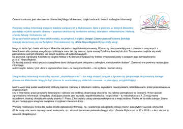 Celem konkursu jest stworzenie Literackiej Mapy Mokotowa, dzięki zebraniu dwóch rodzajów informacji. Pierwszy rodzaj informacji dotyczy tekstów związanych z Mokotowem. Idzie o pozycje, w których Mokotów pozostaje w jakiś sposób obecny – poprzez okolicę czy konkretne adresy, zdarzenia, mieszkańców, historię, a także fabułę i bohaterów itd. Do grupy takich pozycji literackich należy, na przykład, książka Uwaga! Czarny parasol! Adama Bahdaja (cała jej akcja toczy się na Sadybie i Czerniakowie) czy Aleja Niepodległości Krzysztofa Vargi. Mogą to także być dzieła, w których Mokotów nie jest szczególnie eksponowany. Wystarczy, że opowiadają one o pisarzach związanych z Mokotowem albo podają anegdoty przybliżające nam, tak czy inaczej, życie naszej Dzielnicy dawniej lub dziś. Tu zapewne znajdzie się wiele pamiętników samych literatów lub innych autorów ich wspominających. Na przykład, Agnieszka Kosińska w książce Miłosz w Krakowie przytacza trzy krótkie wypowiedzi poety o czasach jego zamieszkiwania przy al. Niepodległości. Do każdej pozycji należy podać szczegółowe dane bibliograficzne związane z odkrytym „mokotowskim śladem”. Zawierać one powinny następujące informacje: autor książki, tekstu; tytuł utworu; wydawnictwo oraz – w miarę możliwości – rok wydania i numer strony. Drugi rodzaj informacji można by nazwać „okołoliterackimi” – bo mają ukazać związek z życiem czy jakąkolwiek aktywnością danego pisarza na Mokotowie. Mogą to być pisarze tu zamieszkujący stale lub czasowo, tu pracujący, przyjeżdżający… Można więc tutaj podać wiadomość zdobytą poprzez rozmowy z członkami rodziny, sąsiadami, nauczycielami, bibliotekarzami; przez poszukiwania w czasopismach czy w Internecie; przez programy telewizyjne i radiowe lub wnikliwą obserwację otoczenia (np. tablice pamiątkowe na domach). W ten sposób zgromadzimy informacje i anegdoty, ukazujące pisarza jako sąsiada, współmieszkańca. Na przykład – tu mieszkał pisarz X. Z moją mamą (dziadkiem, siostrą) chodziła do szkoły pisarka Y. Pisarz Z korzystał z usług szewca/weterynarza z mojej rodziny. Poetka W tu robiła zakupy. Znana mi jest następująca anegdota związana z krytykiem literackim K itp… W miarę możliwości, trzeba też podać źródło zgłoszonej informacji, np.: wiadomość od sąsiadki; relacja mamy; przeczytany wywiad, artykuł itd. (O ile to się uda, warto doprecyzować wskazania, np.: strona internetowa piekarska.blog.pl albo: „Gazeta Wyborcza” nr 17 z 2016 r. – lecz nie jest to warunek obligatoryjny).