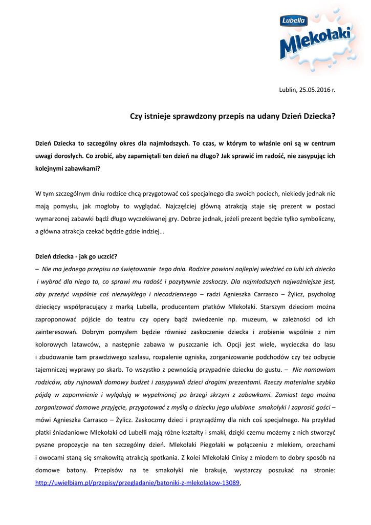 Lublin, 25.05.2016 r. Czy istnieje sprawdzony przepis na udany Dzień Dziecka? Dzień Dziecka to szczególny okres dla najmłodszych. To czas, w którym to właśnie oni są w centrum uwagi dorosłych. Co zrobić, aby zapamiętali ten dzień na długo? Jak sprawić im radość, nie zasypując ich kolejnymi zabawkami? W tym szczególnym dniu rodzice chcą przygotować coś specjalnego dla swoich pociech, niekiedy jednak nie mają pomysłu, jak mogłoby to wyglądać. Najczęściej główną atrakcją staje się prezent w postaci wymarzonej zabawki bądź długo wyczekiwanej gry. Dobrze jednak, jeżeli prezent będzie tylko symboliczny, a główna atrakcja czekać będzie gdzie indziej… Dzień dziecka - jak go uczcić? – Nie ma jednego przepisu na świętowanie tego dnia. Rodzice powinni najlepiej wiedzieć co lubi ich dziecko i wybrać dla niego to, co sprawi mu radość i pozytywnie zaskoczy. Dla najmłodszych najważniejsze jest, aby przeżyć wspólnie coś niezwykłego i niecodziennego – radzi Agnieszka Carrasco – Żylicz, psycholog dziecięcy współpracujący z marką Lubella, producentem płatków Mlekołaki. Starszym dzieciom można zaproponować pójście do teatru czy opery bądź zwiedzenie np. muzeum, w zależności od ich zainteresowań. Dobrym pomysłem będzie również zaskoczenie dziecka i zrobienie wspólnie z nim kolorowych latawców, a następnie zabawa w puszczanie ich. Opcji jest wiele, wycieczka do lasu i zbudowanie tam prawdziwego szałasu, rozpalenie ogniska, zorganizowanie podchodów czy też odbycie tajemniczej wyprawy po skarb. To wszystko z pewnością przypadnie dziecku do gustu. – Nie namawiam rodziców, aby rujnowali domowy budżet i zasypywali dzieci drogimi prezentami. Rzeczy materialne szybko pójdą w zapomnienie i wylądują w wypełnionej po brzegi skrzyni z zabawkami. Zamiast tego można zorganizować domowe przyjęcie, przygotować z myślą o dziecku jego ulubione smakołyki i zaprosić gości – mówi Agnieszka Carrasco – Żylicz. Zaskoczmy dzieci i przyrządźmy dla nich coś specjalnego. Na przykład płatki śniadaniowe Mlekołaki od Lubelli mają różne kształty i smaki, dzięki czemu możemy z nich stworzyć pyszne propozycje na ten szczególny dzień. Mlekołaki Piegołaki w połączeniu z mlekiem, orzechami i owocami staną się smakowitą atrakcją spotkania. Z kolei Mlekołaki Cinisy z miodem to dobry sposób na domowe batony. Przepisów na te smakołyki nie brakuje, wystarczy poszukać na stronie: http://uwielbiam.pl/przepisy/przegladanie/batoniki-z-mlekolakow-13089, a na pewno każdy znajdzie coś dla siebie. O czym jeszcze powinniśmy pamiętać? Świątecznej uczcie przy stole mogą towarzyszyć rodzinne tańce przy muzyce, zabawa w teatrzyk rodzinny, a nawet prawdziwy bal przebierańców. Ubranie dziecka w strój ukochanego bohatera z bajki może okazać się wspaniałą niespodzianką. Jednak nawet najbardziej oryginalne pomysły nie zastąpią samej atmosfery. – Jeśli dziecko doświadczy ze strony dorosłych otwartości, radości ze wspólnie spędzonego czasu, tym intensywniej przeżyje ten dzień i poczuje się w pełni obdarowane – mówi Agnieszka Carrasco – Żylicz. Dobrym pomysłem do zrealizowania również ze starszym dzieckiem, będzie wycieczka rowerowa bądź piknik, na który wystarczy przygotować kilka przekąsek i wziąć ze sobą koc. A potem trzeba już tylko rozłożyć swój ekwipunek i cieszyć się wspólnie spędzanym czasem na łonie natury. W budowaniu i pogłębianiu rodzinnych więzi bardzo pomagają rozmowy. Podczas spędzanych razem chwil, oprócz zabaw, warto zagospodarować czas na wzajemne słuchanie tego, czym każdy chciałby się podzielić z innymi, co go trapi, a co uszczęśliwia. Dzięki temu dzieci poczują się szczęśliwe, bo będą wiedziały, że są ważne, potrzebne, a rodzice ich słuchają. Czy znam potrzeby swojego dziecka? Pierwszy dzień czerwca to niepowtarzalna okazja, aby zastanowić się nad tym czy znamy potrzeby, zainteresowania, talenty i pragnienia swojego dziecka i czy potrafimy je zaspokajać na co dzień. – Myślę, że w tym dniu warto dokonać rodzicielskiego bilansu i spróbować poszukać odpowiedzi. Zwykle pozostaje przestrzeń i czas, aby dokonać zmian, a także rozpocząć na nowo budowanie i zacieśnianie emocjonalnej więzi z dzieckiem – mówi Agnieszka Carrasco – Żylicz – Dzień Dziecka może stać się dla rodziców okazją do popatrzenia na swoją pociechę uważniej niż dotychczas i wsłuchanie się w to co ona mówi i przeżywa. Musimy pamiętać, że dzieci potrzebują naszego zainteresowania i bliskości przez cały czas, a nie tylko od święta. Więcej informacji: Biuro prasowe: Bogumiła Sobiecka Account Executive e-mail: [email protected] tel.: 22 544 05 11 Lubella: Dorota Liszka Manager ds. Komunikacji Korporacyjnej e-mail: [email protected] tel.: 33 870 82 04 Lubella to lider na rynku makaronów w Polsce oraz znany producent wyrobów zbożowych m.in.: płatków śniadaniowych, mąki, kasz i paluszków. Produkty Lubelli charakteryzuje wysoka jakość, wyjątkowy smak i pewność efektu od ponad 130 lat. Lubella ciągle rozwija się i czerpie to, co najlepsze z polskiej tradycji oraz wzbogaca ofertę o produkty innowacyjne. Są one niejednokrotnie inspiracją dla eksperymentów w kuchni i zabawy ze smakiem. Marka jest ceniona zarówno przez handlowców, jak i konsumentów.