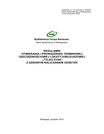 Załącznik nr 1 do Uchwały nr 35/2010 Banku Spółdzielczego w Białogardzie z dnia 20 grudnia 2010r SGB Spółdzielcza Grupa Bankowa Bank Spółdzielczy w Białogardzie REGULAMIN OTWIERANIA I PROWADZENIA TERMINOWEJ OSZCZĘDNOŚCIOWEJ LOKATYJUBILEUSZOWEJ „TYLKO ZYSK” Z DZIENNYM NALICZANIEM ODSETEK Białogard, grudzień 2010 Postanowienia ogólne §1 1. Niniejszy Regulamin określa szczegółowe warunki otwierania i prowadzenia rachunków terminowej oszczędnościowej Lokaty Jubileuszowej „tylko zysk” z dziennym naliczaniem odsetek. 2. Postanowienia Regulaminu stosuje się łącznie z postanowieniami „Ogólnych warunków otwierania i prowadzenia rachunków bankowych osób fizycznych w złotych w Banku Spółdzielczym w Białogardzie”. §2 Przez określenia użyte w Regulaminie należy rozumieć: 1. Bank – Bank Spółdzielczy w Białogardzie. 2. Dokument stwierdzający tożsamość – ważny dokument pozwalający na ustalenie tożsamości osoby dokonującej z Bankiem czynności prawnej lub faktycznej, w tym: dowód osobisty, paszport, a dla osoby małoletniej - także legitymacja szkolna z fotografią i pieczęcią szkoły zawierająca imię i nazwisko, datę urodzenia ucznia lub tymczasowy dowód osobisty. 3. Klient/Posiadacz – osoba fizyczna otwierająca terminową oszczędnościową Lokatę Jubileuszową „tylko zysk” z dziennym naliczaniem odsetek, z którą Bank zawarł umowę lokaty, a w przypadku wspólnej lokaty osób fizycznych – każdy ze współposiadaczy. 4. Lokata – terminowa oszczędnościowa Lokata Jubileuszowa „tylko zysk” z dziennym naliczaniem odsetek. 5. Osoba małoletnia – osoba w wieku od 13 – tego do 18 – tego roku życia. 6. Okres umowny – okres czasu, na który został wniesiona lokata. 7. Placówka Banku – jednostka organizacyjna Banku prowadząca działalność operacyjną. 8. Rachunek lokaty – rachunek terminowej oszczędnościowej Lokaty Jubileuszowej „tylko zysk” z dziennym naliczaniem odsetek. 9. Regulamin – Regulamin otwierania i prowadzenia terminowej oszczędnościowej Lokaty Jubileuszowej „tylko zysk” z dziennym naliczaniem odsetek. 10. Umowa - umowa rachunku terminowej oszczędnościowej Lokaty Jubileuszowej „tylko zysk” w złotych z dziennym naliczaniem odsetek. 11. Warunki - Ogólne warunki otwierania i prowadzenia rachunków bankowych osób fizycznych w złotych w Banku Spółdzielczym w Białogardzie. Postanowienia szczegółowe §3 Bank jest podmiotem objętym obowiązkowym systemem gwarantowania środków pieniężnych zgromadzonych na rachunkach bankowych, zgodnie z ustawą o Bankowym Funduszu Gwarancyjnym z dnia 14 grudnia 1994 roku z późniejszymi zmianami (tekst jedn. Dz.U. nr 70 poz.474 z 2007 roku z późniejszymi zmianami), którego celem jest zapewnienie deponentom wypłaty środków zgromadzonych na tych rachunkach. §4 Posiadaczami Lokaty mogą być wyłącznie osoby fizyczne. §5 Rachunki Lokat prowadzone są jako rachunki imienne. §6 1. Minimalna kwota jednej lokaty wynosi 1.000,00 zł., a maksymalna wynosi 15.000,00 zł. 2. Terminowe oszczędnościowe Lokaty Jubileuszowe „tylko zysk” z dziennym naliczaniem odsetek mogą być wnoszone na okres 1, 3, 6 lub 12 miesięcy. 3. Posiadacz może pozostawić Lokatę na kolejny (taki sam) okres umowny bez wydawania jakiejkolwiek dodatkowej dyspozycji. Odnowienie nastąpi na warunkach obowiązujących w pierwszym dniu kolejnego okresu umownego. §7 1. Klient wnioskujący o otwarcie i prowadzenie rachunku lokaty składa w Oddziale Wniosek według wzoru obowiązującego w Banku. 2. W przypadku, gdy Klient posiada w Banku inny rachunek bankowy, wypełnienie Wniosku nie jest konieczne. §8 1. Na dowód założenia pierwszej lokaty w ramach jednej umowy, w placówce Banku klient otrzymuje: 1) jeden egzemplarz umowy, 2) Regulamin, 3) Warunki, 4) potwierdzenie dokonania wpłaty na lokatę. 2. W przypadku otwierania kolejnych lokat Posiadacz otrzymuje potwierdzenie dokonania wpłaty na terminową oszczędnościową Lokatę Jubileuszową „tylko zysk” z dziennym naliczaniem odsetek. 3. Przed założeniem lokaty za pośrednictwem systemu Internet Banking Klient zobowiązany jest zapoznać się z Regulaminem. Dysponowanie lokatą §9 W okresie umownym utrzymywania rachunku lokaty nie ma możliwości dokonywania wpłat uzupełniających oraz częściowej wypłaty środków zgromadzonych na rachunku lokaty. Wypłata środków przed terminem skutkuje likwidacją rachunku lokaty. Naliczanie odsetek § 10 1. Wysokość oprocentowania środków zgromadzonych na rachunku terminowej oszczędnościowej Lokaty Jubileuszowej „tylko zysk” z dziennym naliczaniem odsetek wyrażana jest w stosunku rocznym. 2. Środki gromadzone na rachunku terminowej oszczędnościowej Lokaty Jubileuszowej „tylko zysk” z dziennym naliczaniem odsetek podlegają oprocentowaniu według określonej przez Zarząd Banku Spółdzielczego w Białogardzie zmiennej stopy procentowej obowiązującej dla terminowych oszczędnościowych Lokat Jubileuszowych „tylko zysk” z dziennym naliczaniem odsetek. § 11 1. Wysokość oferowanego przez Bank oprocentowania środków pieniężnych na rachunkach lokat w trakcie trwania umowy może ulec zmianie, jeżeli co najmniej jedna z podanych poniżej stawek: 1) Stopy procentowe ustalane przez Radę Polityki Pieniężnej, 2) Wskaźnik cen towarów i usług konsumpcyjnych w danym kwartale w stosunku do kwartału poprzedniego, 3) Ceny środków finansowych na rynku międzybankowym, 4) Stopy rezerwy obowiązkowej ustalanej przez Radę Polityki Pieniężnej, ulegnie zmianie o co najmniej 0,1 punktu procentowego. 2. W przypadku zmiany stawki procentowej nowa stawka obowiązuje od dnia jej wprowadzenia w Banku i jest podawana do wiadomości posiadacza w lokalach Banku w formie komunikatu na tablicy ogłoszeń oraz na stronach internetowych Banku. § 12 Do naliczania odsetek od środków pieniężnych zgromadzonych na rachunku bankowym przyjmuje 