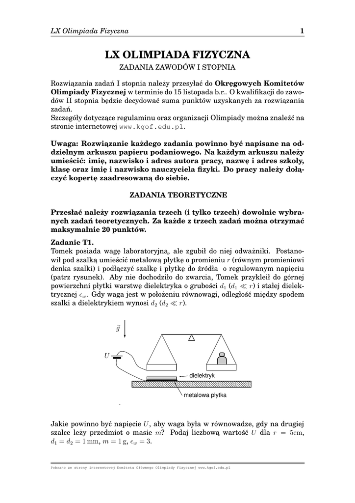 1 LX Olimpiada Fizyczna LX OLIMPIADA FIZYCZNA ZADANIA ZAWODÓW I STOPNIA Rozwiazania ˛ zadań I stopnia należy przesyłać do Okregowych ˛ Komitetów Olimpiady Fizycznej w terminie do 15 listopada b.r.. O kwalifikacji do zawodów II stopnia b˛edzie decydować suma punktów uzyskanych za rozwiazania ˛ zadań. Szczegóły dotyczace ˛ regulaminu oraz organizacji Olimpiady można znaleźć na stronie internetowej www.kgof.edu.pl. Uwaga: Rozwiazanie ˛ każdego zadania powinno być napisane na oddzielnym arkuszu papieru podaniowego. Na każdym arkuszu należy umieścić: imie, ˛ nazwisko i adres autora pracy, nazwe˛ i adres szkoły, klase˛ oraz imie˛ i nazwisko nauczyciela fizyki. Do pracy należy doła˛ czyć koperte˛ zaadresowana˛ do siebie. ZADANIA TEORETYCZNE Przesłać należy rozwiazania ˛ trzech (i tylko trzech) dowolnie wybranych zadań teoretycznych. Za każde z trzech zadań można otrzymać maksymalnie 20 punktów. Zadanie T1. Tomek posiada wag˛e laboratoryjna, ˛ ale zgubił do niej odważniki. Postanowił pod szalka˛ umieścić metalowa˛ płytk˛e o promieniu r (równym promieniowi denka szalki) i podłaczyć ˛ szalk˛e i płytk˛e do źródła o regulowanym napi˛eciu (patrz rysunek). Aby nie dochodziło do zwarcia, Tomek przykleił do górnej powierzchni płytki warstw˛e dielektryka o grubości d1 (d1 r) i stałej dielektrycznej w . Gdy waga jest w położeniu równowagi, odległość mi˛edzy spodem szalki a dielektrykiem wynosi d2 (d2 r). ~g U PSfrag replacements dielektryk metalowa płytka Jakie powinno być napi˛ecie U , aby waga była w równowadze, gdy na drugiej szalce leży przedmiot o masie m? Podaj liczbowa˛ wartość U dla r = 5cm, d1 = d2 = 1 mm, m = 1 g, w = 3. Pobrano ze strony internetowej Komitetu Głównego Olimpiady Fizycznej www.kgof.edu.pl LX Olimpiada Fizyczna 2 Szalki sa˛ metalowe, a ich dno jest płaskie. Płytka pod szalka˛ jest przymocowana do podłoża. Przyspieszenie ziemskie g = 9, 8 m/s, przenikalność elektryczna próżni 0 = 8, 9 · 10−12 F/m. Zadanie T2. W maszynie parowej woda o temperaturze poczatkowej ˛ t0 = 20o C jest podgrzewana do temperatury t1 = 120o C, przy czym jej ciśnienie wzrasta do wartości p1 = 2, 0 · 105 Pa. W temperaturze t1 i ciśnieniu p1 zachodzi przemiana wody w par˛e. Powstała para przesuwa tłok, a nast˛epnie jest wypuszczana do otoczenia o ciśnieniu p0 = 1, 0 · 105 Pa. Oblicz maksymalna˛ sprawność tej maszyny w dwóch przypadkach: a) para przesuwajaca ˛ tłok ma stale ciśnienie p1 , a potem jest wypuszczana do atmosfery; b) maszyna pracuje dwuetapowo: najpierw para przesuwa tłok jak w pkt. a), a nast˛epnie przesuwajac ˛ tłok (ten sam lub inny – zależnie od rozwiazań konstrukcyjnych) ulega adiabatycznemu rozpr˛eżeniu aż osiagnie ˛ temperatur˛e tw = 100o C, po czym wylatuje do atmosfery. Ciepło parowania wody temperaturze t1 (i pod ciśnieniem p1 ) wynosi q1 = 2, 2 · 106 J/kg, ciepło właściwe wody jest równe cw = 4, 2 · 103 J/(kg · K), ciepło właściwe pary wodnej przy stałym ciśnieniu cp = 2, 0 · 103 J/(kg · K). Par˛e wodna˛ potraktuj jako gaz doskonały. Uniwersalna stała gazowa jest równa R = 8, 3 J/(mol · K). Zadanie T3. Kulka o promieniu R, poruszajaca ˛ si˛e z pr˛edkościa˛ v po poziomej podłodze, uderza w kraw˛edź progu o wysokości h (patrz rysunek). Zderzenie jest doskonale spr˛eżyste i trwa bardzo krótko. Jaki warunek (lub warunki) powinno spełniać v, aby kulka po uderzeniu w próg "wskoczyłańa znajdujac ˛ a˛ si˛e za nim cz˛eść podłogi, nie zderzajac ˛ si˛e powtórnie z kraw˛edzia˛ progu? Pomiń tarcie i opór powietrza. Sprawdź, czy ten warunek jest spełniony dla nast˛epujacych wartości parametrów: a) R = 0, 02 m, h = R/2, v = 1 m/s; b) R = 0, 02 m, h = R/4, v = 3 m/s; c) R = 0, 02 m, h = R/8, v = 0, 5 m/s; d) R = 0, 04 m, h = R/16, v = 0, 3 m/s. Przyjmij, że przyspieszenie ziemskie g = 9, 8 m/s2 . Pr˛edkość ~v jest prostopadła do kraw˛edzi progu. Uwaga: Gdy h < R, wygodnie jest wprowadzić kat ˛ α, taki że h = R (1 − cos α). Pobrano ze strony internetowej Komitetu Głównego Olimpiady Fizycznej www.kgof.edu.pl 3 LX Olimpiada Fizyczna ~v ~g R PSfrag replacements h Zadanie T4. NUMERYCZNE. Statek piracki wystrzelił z armaty (falkonetu) w kierunku statku przeciwnika żelazna˛ kul˛e o promieniu r = 2, 5 cm. Zaraz po opuszczeniu lufy kula miała pr˛edkość v = 300 m/s skierowana˛ pod katem ˛ α do poziomu. Nast˛epnie kula poruszała si˛e w powietrzu, a jedynymi siłami na nia˛ działajacymi ˛ były: stała siła grawitacji oraz siła oporu powietrza skierowana w kierunku przeciwnym do kierunku poruszania si˛e kuli, o wartości proporcjonalnej do kwadratu pr˛edkości ~v 1 F~R = − κ S ρp v 2 , 2 v gdzie ~v jest pr˛edkościa˛ kuli, a κ – stałym współczynnikiem oporu aerodynamicznego, który dla kuli w przybliżeniu jest równy 0, 45. S jest powierzchnia˛ rzutu obiektu (kuli) na płaszczyzn˛e prostopadła˛ do kierunku ruchu, ρp – g˛estościa˛ powietrza. Posługujac ˛ si˛e komputerem (np. wykorzystujac ˛ znany ci j˛ezyk programowania lub arkusz kalkulacyjny) lub programowalnym kalkulatorem, wyznacz kat, ˛ przy którym zasi˛eg strzału jest najwi˛ekszy. Zastosuj poniższy schemat: 1. Zaproponuj dla tego problemu i uzasadnij schemat różnicowy oparty na metodzie Eulera (patrz PRZYKŁAD) lub innej metodzie numerycznej. 2. Wykreśl tory dla α = 30◦ , α = 45◦ , oraz α = 60◦ . 3. Wykreśl zależność zasi˛egu od kata ˛ i na tej podstawie oszacuj kat ˛ αmax , dla którego zasi˛eg jest najwi˛ekszy. Podaj ten zasi˛eg. Przyjmij g˛estość żelaza ρFe = 7900kg/m3 i powietrza ρp = 1, 2kg/m3 przyspieszenie ziemsie g = 9, 8 m/s2 . Punkt upadku kuli znajduje si˛e na tej samej wysokości, co punkt jej wystrzelenia. Pomiń krzywizn˛e Ziemi. Pobrano ze strony internetowej Komitetu Głównego Olimpiady Fizycznej www.kgof.edu.pl 4 LX Olimpiada Fizyczna PRZYKŁAD Algoryt