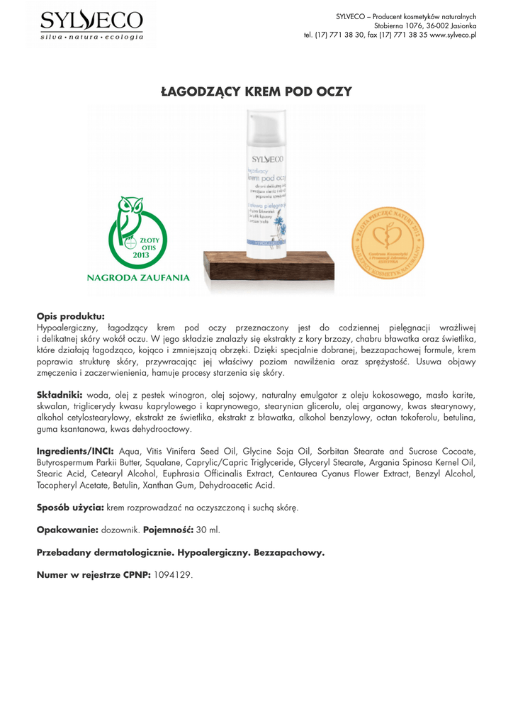 SYLVECO – Producent kosmetyków naturalnych Stobierna 1076, 36-002 Jasionka tel. (17) 771 38 30, fax (17) 771 38 35 www.sylveco.pl ŁAGODZĄCY KREM POD OCZY Opis produktu: Hypoalergiczny, łagodzący krem pod oczy przeznaczony jest do codziennej pielęgnacji wrażliwej i delikatnej skóry wokół oczu. W jego składzie znalazły się ekstrakty z kory brzozy, chabru bławatka oraz świetlika, które działają łagodząco, kojąco i zmniejszają obrzęki. Dzięki specjalnie dobranej, bezzapachowej formule, krem poprawia strukturę skóry, przywracając jej właściwy poziom nawilżenia oraz sprężystość. Usuwa objawy zmęczenia i zaczerwienienia, hamuje procesy starzenia się skóry. Składniki: woda, olej z pestek winogron, olej sojowy, naturalny emulgator z oleju kokosowego, masło karite, skwalan, triglicerydy kwasu kaprylowego i kaprynowego, stearynian glicerolu, olej arganowy, kwas stearynowy, alkohol cetylostearylowy, ekstrakt ze świetlika, ekstrakt z bławatka, alkohol benzylowy, octan tokoferolu, betulina, guma ksantanowa, kwas dehydrooctowy. Ingredients/INCI: Aqua, Vitis Vinifera Seed Oil, Glycine Soja Oil, Sorbitan Stearate and Sucrose Cocoate, Butyrospermum Parkii Butter, Squalane, Caprylic/Capric Triglyceride, Glyceryl Stearate, Argania Spinosa Kernel Oil, Stearic Acid, Cetearyl Alcohol, Euphrasia Officinalis Extract, Centaurea Cyanus Flower Extract, Benzyl Alcohol, Tocopheryl Acetate, Betulin, Xanthan Gum, Dehydroacetic Acid. Sposób użycia: krem rozprowadzać na oczyszczoną i suchą skórę. Opakowanie: dozownik. Pojemność: 30 ml. Przebadany dermatologicznie. Hypoalergiczny. Bezzapachowy. Numer w rejestrze CPNP: 1094129.