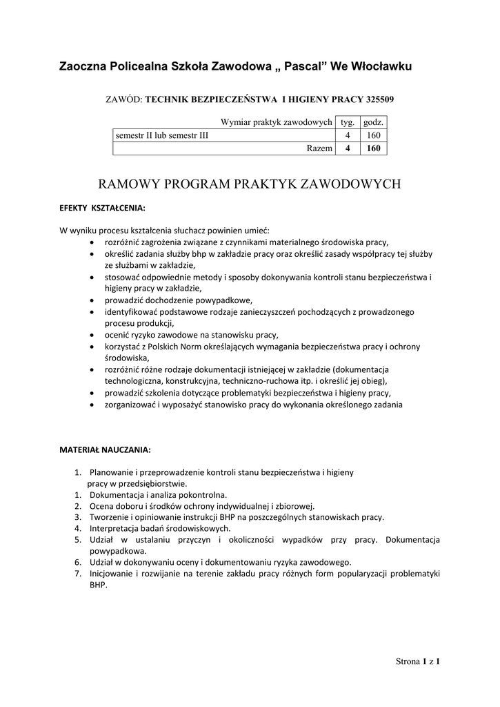 Zaoczna Policealna Szkoła Zawodowa „ Pascal” We Włocławku ZAWÓD: TECHNIK BEZPIECZEŃSTWA I HIGIENY PRACY 325509 semestr II lub semestr III Wymiar praktyk zawodowych tyg. godz. 4 160 Razem 4 160 RAMOWY PROGRAM PRAKTYK ZAWODOWYCH EFEKTY KSZTAŁCENIA: W wyniku procesu kształcenia słuchacz powinien umieć: rozróżnić zagrożenia związane z czynnikami materialnego środowiska pracy, określić zadania służby bhp w zakładzie pracy oraz określić zasady współpracy tej służby ze służbami w zakładzie, stosować odpowiednie metody i sposoby dokonywania kontroli stanu bezpieczeństwa i higieny pracy w zakładzie, prowadzić dochodzenie powypadkowe, identyfikować podstawowe rodzaje zanieczyszczeń pochodzących z prowadzonego procesu produkcji, ocenić ryzyko zawodowe na stanowisku pracy, korzystać z Polskich Norm określających wymagania bezpieczeństwa pracy i ochrony środowiska, rozróżnić różne rodzaje dokumentacji istniejącej w zakładzie (dokumentacja technologiczna, konstrukcyjna, techniczno-ruchowa itp. i określić jej obieg), prowadzić szkolenia dotyczące problematyki bezpieczeństwa i higieny pracy, zorganizować i wyposażyć stanowisko pracy do wykonania określonego zadania MATERIAŁ NAUCZANIA: 1. Planowanie i przeprowadzenie kontroli stanu bezpieczeństwa i higieny pracy w przedsiębiorstwie. 1. Dokumentacja i analiza pokontrolna. 2. Ocena doboru i środków ochrony indywidualnej i zbiorowej. 3. Tworzenie i opiniowanie instrukcji BHP na poszczególnych stanowiskach pracy. 4. Interpretacja badań środowiskowych. 5. Udział w ustalaniu przyczyn i okoliczności wypadków przy pracy. Dokumentacja powypadkowa. 6. Udział w dokonywaniu oceny i dokumentowaniu ryzyka zawodowego. 7. Inicjowanie i rozwijanie na terenie zakładu pracy różnych form popularyzacji problematyki BHP. Strona 1 z 1