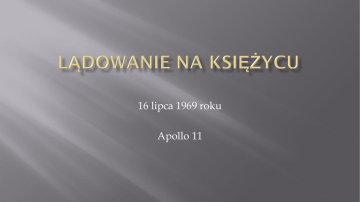 16 lipca 1969 roku Apollo 11 Program Apollo – seria amerykańskich lotów kosmicznych przygotowywanych od roku 1961 zrealizowanych w latach 1966-1972. Celem programu było lądowanie człowieka na Księżycu, a następnie jego bezpieczny powrót na Ziemię. Zadanie zostało zrealizowane w 1969 roku, w czasie misji Apollo 11. Program był kontynuowany do roku 1972 w celu przeprowadzenia dokładniejszej naukowej eksploracji Księżyca. Całkowity koszt programu wyniósł 25,4 miliarda dolarów. Ilość pozyskanego i dostarczonego na Ziemię materiału to 381,7 kg. Bóg jako trzeci Program kosmiczny „Apollo”(od Apollona – greckiego boga muzyki, piękna i wróżb) był trzecim w kolejności po programie „Mercury” (pierwsza planeta układu słonecznego i rzymski odpowiednik Hermesa) oraz „Gemini”(łac. Bliźnięta). Początki Powołany został przez administrację prezydenta Eisenhower’a jako program rozszerzający załogowe loty kosmiczne zapoczątkowane przez „Mercurego”. Prezydent Kennedy przeobraził go w program lotów i lądowań na Księżycu. Polityczne podłoże Podstawowe cele Kennedy wyłożył 25 maja 1961 roku. USA przegrywające „wyścig w kosmos” ze Związkiem Radzieckim (pierwszy sztuczny satelita Ziemi oraz pierwszy człowiek w kosmosie – Sputnik i Gagarin) miały przejąć inicjatywę w tej rywalizacji. Przebieg Program Apollo składał się z jedenastu lotów załogowych, począwszy od Apollo 7, skończywszy na Apollo 17. Wszystkie starty odbywały się z położonego na przylądku Canaveral Centrum Kosmicznego im. Johna F. Kennedy'ego. Misje Apollo 2 do Apollo 6 były bezzałogowymi lotami testowymi. Apollo 1 był planowanym załogowym lotem, niestety trening przed startem zakończył się pożarem kabiny, w której zginęło trzech członków załogi. W pierwszym locie jako rakietę nośną zastosowano Saturn IB, następne wykorzystywały znacznie mocniejsze rakiety Saturn V. Loty: (Apollo 7 i Apollo 9) były ziemskimi misjami orbitalnymi, (Apollo 8 i Apollo 10) były księżycowymi misjami orbitalnymi, pozostałe sześć lotów (poza Apollo 13) zakończyły się lądowaniem na Księżycu. Cięcia w budżecie Planowano jeszcze wykonanie 3 lotów: (Apollo 18, 19 i 20). W związku z ograniczeniem budżetu NASA podjęto decyzję o zakończeniu prac nad następcą rakiety nośnej - Saturn V, a następnie o przerwaniu całego programu Apollo. Fundusze zostały przeznaczone na program lotów wahadłowców. Ostatnie wyprodukowane kapsuły Apollo wykorzystano w programie Skylab i we wspólnej, amerykańsko-radzieckiej misji Sojuz-Apollo. Ciekawostki związane z lądowaniem na Księżycu Flaga pozostawiona przez Amerykanów na skutek promieniowania wyblakła i jest zupełnie białą flagą Michael Collins - czyli trzeci członek załogi Apollo 11 - pozostał w kabinie Apolla, gdy Aldrin i Armstrong znajdowali się na Księżycu. Collins w tym czasie okrążył Księżyc. Co ciekawe, w czasie kiedy Collins znajdował się po drugiej stronie Księżyca (niewidocznej z Ziemi), całkowicie stracił kontakt z Ziemia. Odzyskał go po kilku, może kilkunastu godzinach, kiedy Apollo znów był widoczny z Ziemi. Wniosek? Collins był przez kilka godzin najsamotniejszym człowiekiem w historii. Amerykańska agencja lotów kosmicznych NASA zgubiła oryginalny materiał filmowy dokumentujący pierwsze lądowanie człowieka na Księżycu. Rozpoczęła więc przeglądanie 13 tysięcy taśm ze wszystkich misji programu Apollo. Oryginalne taśmy pod koniec 1969 roku trafiły do amerykańskich archiwów państwowych. Później NASA próbowała je odzyskać i właśnie w tym czasie ślad po nich się urwał. Według rzecznika NASA Richarda Nafzgera, dokument z 21 czerwca 1969 roku może znajdować się gdzieś w jednej z 2600 skrzynek archiwów centrum lotów kosmicznych Goddarda w stanie Maryland. John Sarkissian z obserwatorium astronomicznego Parksa w Australii - jednej z trzech placówek, które nagrywały oryginalny materiał, zanim przesłały go do centrum kosmicznego w Houston (USA) - podkreśla, że jakość tamtego przekazu filmowego była dużo lepsza niż współczesne nagrania wideo. Jak napisał brytyjski dziennik "Daily Telegraph", ten powszechnie znany z telewizji film ukazujący "pierwszy krok w kosmosie" Neila Armstronga można porównać do fotokopii odbitki ksero; oryginał jest o wiele bardziej wyraźny.