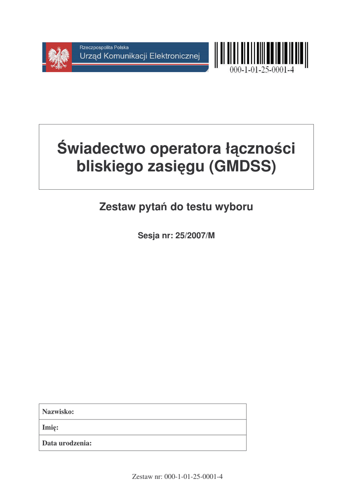 wiadectwo operatora ł czno ci bliskiego zasi gu (GMDSS) Zestaw pyta do testu wyboru Sesja nr: 25/2007/M Nazwisko: Imi : Data urodzenia: Zestaw nr: 000-1-01-25-0001-4 Sesja nr: 25/2007/M Ogólna wiedza o podsystemach i urz dzeniach radiowych GMDSS, stosowanych na obszarze morza A1 1. W skład systemu COSPAS-SARSAT wchodzi blok satelitów poruszaj cych si po orbitach polarnych. Które z poni szych stwierdze jest prawdziwe: A. wysoko B. wysoko C. wysoko orbit polarnych wynosi około 3000 km orbit polarnych wynosi 850 - 1000 km orbit polarnych wynosi około 240 km 2. Utworzony system GMDSS pozwala na: A. automatyczne ustanawiania poł cze radiokomunikacyjnych B. automatyczne ustanawiania poł cze za pomoc kodu sekwencyjnego C. r czne ustanawiania radiotelegraficznych poł cze statek-l d 3. redni zasi g ł czno ci alarmowej za pomoc DSC w obszarze A1 wynosi: A. 10 mil morskich B. 20 mil morskich C. 50 mil morskich 4. Radiopławy systemu COSPAS-SARSAT mog by uruchomione: A. automatycznie za pomoc zwalniaka hydrostatycznego, gdy statek tonie B. przez wpisanie wła ciwego kodu C. zdalnie z RCC 5. Do nadawania sygnałów alarmowych w obszarze A1 stosowane s : A. kanał 13 B. kanał 6 C. kanał 70 Praktyczna obsługa urz dze radiowych podsystemów GMDSS, stosowanych na obszarze morza A1 1. Przetestuj radiopław EPIRB 406 MHz. A. Poł cz wystaj ce metalowe bolce na bokach radiopławy przewodem o długo ci około 20 cm, obserwuj jej zachowanie, powinno by zgodne z opisem na obudowie B. Zdejmij radiopław z obudowy i umie j w naczyniu z wod morsk , obserwuj jej zachowanie, powinno by zgodne z opisem na obudowie C. Zdejmij radiopław z obudowy, przesu d wigni w poło enie TEST, obserwuj jej zachowanie, powinno by zgodne z opisem na obudowie Zestaw nr: 000-1-01-25-0001-4 Str. 3 Sesja nr: 25/2007/M 2. Wywołaj inny statek, przy u yciu radiotelefonu VHF i przeprowad z nim rozmow rutynow . A. Obró [P1], wci nij [16], nadaj „znak wywoływanej stacji, 3x znak własnej stacji”, po zgłoszeniu si wywoływanej stacji prowad rozmow B. Obró [P1], wci nij [1], wci nij [3], nadaj „znak wywoływanej stacji, 3x znak własnej stacji”, po zgłoszeniu si wywoływanej stacji prowad rozmow C. Obró [P1], wci nij [16], nadaj „znak wywoływanej stacji, 3x znak własnej stacji”, po zgłoszeniu si wywoływanej stacji uzgodnij kanał roboczy, ustaw go i prowad rozmow 3. Wprowad pozycj geograficzn do przystawki DSC VHF. A. Obró [VOL], wci nij [FUNC], wci nij [EDIT], wprowad pozycj B. Obró [VOL], wci nij [CALL], wci nij [EDIT], wprowad pozycj C. Obró [VOL], wci nij [FUNC], wci nij [>], wci nij [NEXT], wprowad czas i pozycj , wci nij [NEXT] Zestaw nr: 000-1-01-25-0001-4 Str. 4 Sesja nr: 25/2007/M 4. Przetestuj przystawk DSC VHF. A. Obró [VOL], wci nij [FUNC], wci nij [NEXT] B. Obró [VOL], wci nij [FUNC], wci nij [>] tyle razy, a wyró nione zostanie słowo Test, wci nij [NEXT] C. Obró [VOL], wci nij [FUNC], wci nij [CALL], wci nij [NEXT] 5. Uruchom radiopław EPIRB 406 MHz b d c na tratwie ratunkowej. A. Przywi zabran ze statku radiopław do szalupy i wrzu j do wody B. Wci nij przycisk ON i umie j mo liwie wysoko na tratwie C. Wrzu radiopław natychmiast do wody Regulaminy i podstawowe terminy angloj zyczne stosowane w słu bie radiokomunikacyjnej morskiej 1. Fala sejsmiczna jest przewidywana przed … UTC. A. Tsunami waited for by … UTC. B. Freak wave expected by … UTC. C. Tsunami expected by .. UTC. 2. Przed ka dym wywołaniem poprzedzaj cym korespondencje w niebezpiecze stwie nale y u y sygnału niebezpiecze stwa: A. PAN PAN B. MAYDAY C. MAYDAY MAYDAY MAYDAY 3. Emisja G3E to emisja: A. z modulacj fazy B. cyfrowa C. z jednowst gow modulacj amplitudy Zestaw nr: 000-1-01-25-0001-4 Str. 5 Sesja nr: 25/2007/M 4. W zakresie VHF, operator stacji statkowej mo e nada potwierdzenie odbioru alarmowania DSC za pomoc : A. tylko DSC B. radiotelefonii lub DSC C. tylko radiotelefonii 5. Stacja nadbrze na to stacja prowadz ca ł czno : A. ruchu portowego B. ruchu statków C. publiczn Zestaw nr: 000-1-01-25-0001-4 Str. 6
