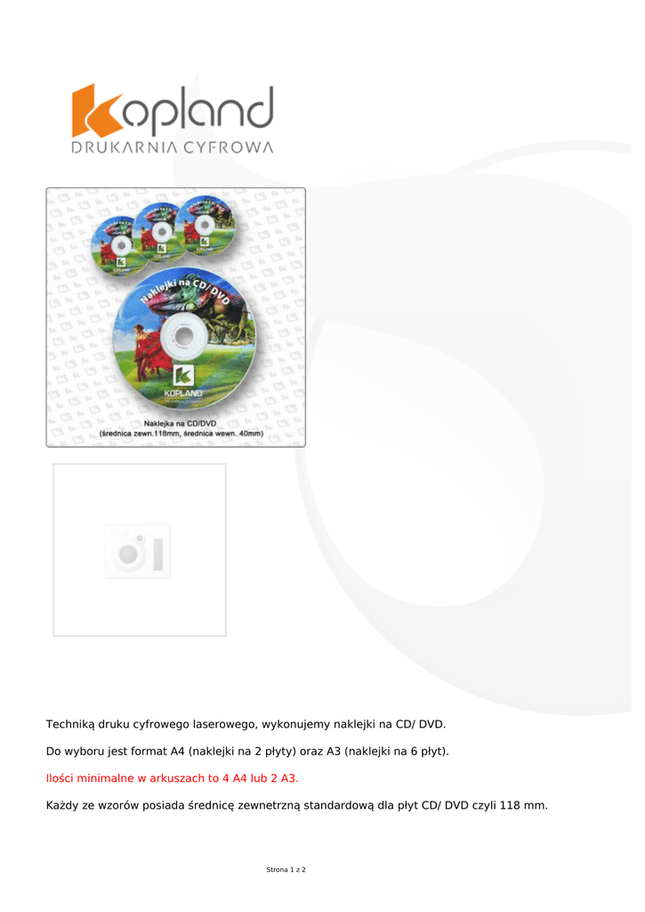 Techniką druku cyfrowego laserowego, wykonujemy naklejki na CD/ DVD. Do wyboru jest format A4 (naklejki na 2 płyty) oraz A3 (naklejki na 6 płyt). Ilości minimalne w arkuszach to 4 A4 lub 2 A3. Każdy ze wzorów posiada średnicę zewnetrzną standardową dla płyt CD/ DVD czyli 118 mm. Strona 1 z 2 Średnica wewnętrzna może być w 2 wersjach, tj. 25 mm oraz 40 mm. Wygląd danej średnicy pokazują zdjęcia poglądowe. Dodatkowo oferujemy zapis danych na CD/ DVD oraz aplikację wydrukowanych przez nas naklejek (dotyczy wersji z dużą średnicą w środku, tj. 118-40 mm). Oferujemy także opakowania dla zleceń archiwizacji/ zapisu danych na płytach z nadrukami aplikowanymi w naszej firmie. Do dyspozycji są koperty i pudełka plastikowe (slim) bez okładki i z drukowaną przez nas okładką z dostarczonego pliku. Klienci zalogowani otrzymują 10% rabatu na usługę. Strona 2 z 2 Powered by TCPDF (www.tcpdf.org)
