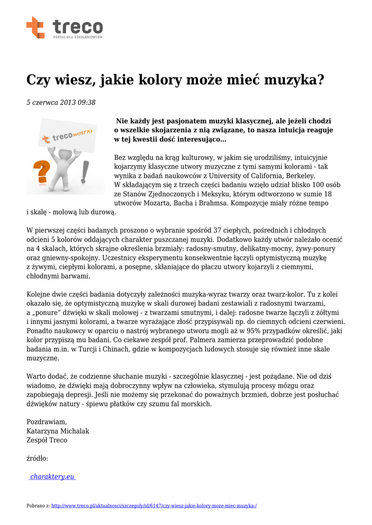 Czy wiesz, jakie kolory może mieć muzyka? 5 czerwca 2013 09:38 Nie każdy jest pasjonatem muzyki klasycznej, ale jeżeli chodzi o wszelkie skojarzenia z nią związane, to nasza intuicja reaguje w tej kwestii dość interesująco… Bez względu na krąg kulturowy, w jakim się urodziliśmy, intuicyjnie kojarzymy klasyczne utwory muzyczne z tymi samymi kolorami - tak wynika z badań naukowców z University of California, Berkeley. W składającym się z trzech części badaniu wzięło udział blisko 100 osób ze Stanów Zjednoczonych i Meksyku, którym odtworzono w sumie 18 utworów Mozarta, Bacha i Brahmsa. Kompozycje miały różne tempo i skalę - molową lub durową. W pierwszej części badanych proszono o wybranie spośród 37 ciepłych, pośrednich i chłodnych odcieni 5 kolorów oddających charakter puszczanej muzyki. Dodatkowo każdy utwór należało ocenić na 4 skalach, których skrajne określenia brzmiały: radosny-smutny, delikatny-mocny, żywy-ponury oraz gniewny-spokojny. Uczestnicy eksperymentu konsekwentnie łączyli optymistyczną muzykę z żywymi, ciepłymi kolorami, a posępne, skłaniające do płaczu utwory kojarzyli z ciemnymi, chłodnymi barwami. Kolejne dwie części badania dotyczyły zależności muzyka-wyraz twarzy oraz twarz-kolor. Tu z kolei okazało się, że optymistyczną muzykę w skali durowej badani zestawiali z radosnymi twarzami, a „ponure” dźwięki w skali molowej - z twarzami smutnymi, i dalej: radosne twarze łączyli z żółtymi i innymi jasnymi kolorami, a twarze wyrażające złość przypisywali np. do ciemnych odcieni czerwieni. Ponadto naukowcy w oparciu o nastrój wybranego utworu mogli aż w 95% przypadków określić, jaki kolor przypiszą mu badani. Co ciekawe zespół prof. Palmera zamierza przeprowadzić podobne badania m.in. w Turcji i Chinach, gdzie w kompozycjach ludowych stosuje się również inne skale muzyczne. Warto dodać, że codzienne słuchanie muzyki - szczególnie klasycznej - jest pożądane. Nie od dziś wiadomo, że dźwięki mają dobroczynny wpływ na człowieka, stymulują procesy mózgu oraz zapobiegają depresji. Jeśli nie możemy się przekonać do poważnych brzmień, dobrze jest posłuchać dźwięków natury - śpiewu płatków czy szumu fal morskich. Pozdrawiam, Katarzyna Michalak Zespół Treco źródło: charaktery.eu Pobrano z: http://www.treco.pl/aktualnosci/szczegoly/id/6147/czy-wiesz-jakie-kolory-moze-miec-muzyka-/ Pobrano z: http://www.treco.pl/aktualnosci/szczegoly/id/6147/czy-wiesz-jakie-kolory-moze-miec-muzyka-/