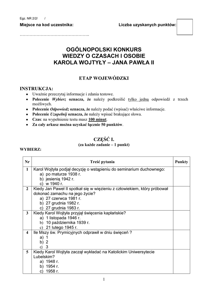 Egz. NR 2/2/ / Liczba uzyskanych punktów: Miejsce na kod uczestnika: ………………………………………….. OGÓLNOPOLSKI KONKURS WIEDZY O CZASACH I OSOBIE KAROLA WOJTYŁY – JANA PAWŁA II ETAP WOJEWÓDZKI INSTRUKCJA: Uważnie przeczytaj informacje i zdania testowe. Polecenie Wybierz oznacza, że należy podkreślić tylko jedną odpowiedź z trzech możliwych. Polecenie Odpowiedz oznacza, że należy podać (wpisać) właściwe informacje. Polecenie Uzupełnij oznacza, że należy wpisać brakujące słowa. Czas: na wypełnienie testu masz 100 minut. Za cały arkusz można uzyskać łącznie 50 punktów. CZĘŚĆ I. (za każde zadanie – 1 punkt) WYBIERZ: Nr 1 2 3 4 5 Treść pytania Karol Wojtyła podjął decyzję o wstąpieniu do seminarium duchownego: a) po maturze 1938 r. b) jesienią 1942 r. c) w 1940 r. Kiedy Jan Paweł II spotkał się w więzieniu z człowiekiem, który próbował dokonać zamachu na jego życie? a) 27 czerwca 1981 r. b) 27 grudnia 1982 r. c) 27 grudnia 1983 r. Kiedy Karol Wojtyła przyjął święcenia kapłańskie? a) 1 listopada 1946 r. b) 10 października 1939 r. c) 21 lutego 1945 r. Ile Mszy św. Prymicyjnych odprawił w dniu święceń ? a) 1 b) 2 c) 3 Kiedy Karol Wojtyła zaczął wykładać na Katolickim Uniwersytecie Lubelskim? a) 1948 r. b) 1954 r. c) 1958 r. 1 Punkty Egz. NR 2/2/ / Nr Treść pytania 6 W obradach jakiego Soboru brał udział biskup Wojtyła? a) Sobór Watykański I b) Sobór Watykański II c) Sobór Trydencki Karol Wojtyła w czasie okupacji przez 4 lata pracował jako robotnik w fabryce Solvay. Czym się zajmował? a) pracował przy taśmie produkcyjnej, montował samochody b) pracował fizycznie w kamieniołomach a następnie w oczyszczalni wody c) pracował przy budowie schronów przeciwlotniczych Ile lat trwał pontyfikat Jana Pawła II? a) 30 b) 27 c) 25 Papież udziela uroczystego błogosławieństwa „Urbi et Orbi”. Co to znaczy to sformułowanie? a) Papież błogosławi „miastu i światu” b) Papież życzy szczęścia „ludziom dobrej woli” c) Papież udziela błogosławieństwa wszystkim „kobietom i mężczyznom” Ile pielgrzymek do Polski odbył Jan Paweł II? a) 10 b) 8 c) 7 Jaki przedmiot wykładał bp Karol Wojtyła na Katolickim Uniwersytecie Lubelskim? a) Polonistykę b) Teologię c) Etykę Kto udzielił Karolowi Wojtyle święceń kapłańskich ? a) Kard. A. Hlond b) Kard. A. Sapieha c) Kard. S. Wyszyński Kiedy i gdzie miał miejsce zamach na Jana Pawła II? a) 12 maja 1980 r. — Paryż (Francja) b) 10 czerwca 1981 r. — Turyn (Włochy) c) 13 maja 1981 r. – Rzym (Włochy) Jak wyglądał słynny gest, który papież Jan Paweł II wykonywał przez wiele lat na początku każdej wizyty zagranicznej, zaraz po zejściu z pokładu samolotu? a) Ucałowanie ziemi b) Uczynienie znaku krzyża c) Wzniesienie rąk do góry Gdzie Ojciec Święty wybrał się w swoją pierwszą podróż zagraniczną? a) Do Polski b) Do Republiki Dominikańskiej, Meksyku i na Wyspy Bahama c) Do Francji i Niemiec 7 8 9 10 11 12 13 14 15 2 Punkty Egz. NR 2/2/ Nr / Treść pytania 16 Myślą przewodnią pielgrzymki Ojca Świętego do Polski w 1991 roku był: a) Zbiór przypowieści Pana Jezusa b) Fragment Konstytucji 3-go Maja c) Dekalog 17 Jakie studia rozpoczął Karol Wojtyła po zdaniu matury w 1938 roku? a) Aktorskie b) Polonistyczne c) Teologiczne 18 Matka Karola Wojtyły zmarła a) 13 kwietnia 1929 r. b) 16 kwietnia 1941 r. c) 18 maja 1920 r. 19 Która z pielgrzymek Jana Pawła II do Polski odbywała się w stanie wojennym? a) Pierwsza b) Druga c) Trzecia 20 Jakie wezwanie nosiła druga parafia pracy księdza Wojtyły? a) Matki Bożej b) Apostoła Piotra c) św. Floriana 21 Jaki znany poemat, wydany w 2003 r., napisał Jan Paweł II? a) „Pamięć i tożsamość” b) „Osoba i czyn” c) „Tryptyk Rzymski” 22 „List do rodzin” Jan Paweł II ogłosił w dniu: a) 02. 02. 1994 r. b) 20. 02. 1992 r. c) 02. 02. 1996 r. 23 W którym roku Karol Wojtyła został mianowany biskupem? a) 1960 b) 1958 c) 1956 24 Pierwsza encyklika Jana Pawła II była zatytułowana: a) Laborem exercens b) Redemptor hominis c) Redemptoris Mater 25 Kto powiedział te słowa do Jana Pawła II: „Masz wprowadzić Kościół w trzecie tysiąclecie”? a) kard. Stanisław Dziwisz b) Kard. Jozef Ratzinger c) Kard. Stefan Wyszyński 26 Karol Wojtyła miał brata Edmunda. Który z podanych faktów dotyczących życia Edmunda jest fałszywy? a) był lekarzem b) zmarł w wieku 26 lat na szkarlatynę c) był młodszym bratem Karola Wojtyły 3 Punkty Egz. NR 2/2/ Nr / Treść pytania 27 W której z wymienionych organizacji religijnych Karol Wojtyła w okresie nauki w gimnazjum pełnił funkcję sekretarza? a) III Zakon św. Franciszka b) Sodalicja Mariańska c) ruch Światło Życie 28 Jak nazywa się rzymska uczelnia, na której w 1948 r. Karol Wojtyła obronił swoją pracę doktorską? a) Angelicum b) Biblicum c) Gregorianum 29 Karol Wojtyła jako poeta był zafascynowany romantyzmem, a szczególnie twórczością: a) Adama Mickiewicza b) Juliusza Słowackiego c) Cypriana Kamila Norwida 30 Jakiemu dniowi tygodnia poświęcił Jan Paweł II List apostolski „Dies Domini”? a) Sobocie b) Niedzieli c) Niedzieli Zmartwychwstania Pańskiego 31 Na jakim cmentarzu znajduje się grób rodziny Wojtyłów? a) Cmentarz Rakowicki w Krakowie b) Cmentarz Powązkowski w Warszawie c) Cmentarz w Wadowicach 32 Znak, któremu sprzeciwiać się będą – to tekst rekolekcji metropolity krakowskiego, które zostały wygłoszone w Watykanie w roku a) 1964 b) 1976 c) 1978 33 Przyjacielem Karola Wojtyły, z którym zorganizował w Krakowie konspiracyjny Teatr Rapsodyczny był: a) Mieczysław Kotlarczyk b) Mieczysław Maliński c) Juliusz Kydryński 34 W roku 1960 ukazała się książka Karola Wojtyły, wydana przez Towarzystwo Naukowe KUL. Jej tytuł brzmi: a) Osoba i czyn b) Elementarz etyczny c) Miłość i odpowiedzialność 35 W roku 1976 New York Times um