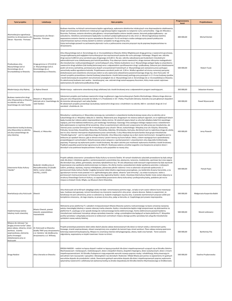 Opis projektu Prognozowany koszt Projektodawca Akomodacyjna sygnalizacja Skrzyżowanie ulic Okrzei świetlna na skrzyżowaniu ulic Rycerska - Portowa Okrzei - Rycerska - Portowa Budowa masztów, na których zamontowana będzie sygnalizacja, wykonanie detektorów indukcyjnych oraz doprowadzenie okablowania. Dzięki zamontowanym detektorom indukcyjnym sygnalizacja będzie reagowała na natężenie ruchu samochodów. Ciąg ulic Mieszka I, Rycerska, Portowa, zostanie określony jako główny i otrzymywał będzie zielone światło zawsze, kierunek podporządkowany – po wzbudzeniu. Detektory zainstalowane będą tylko na wlotach podporządkowanych (z obu stron ul. Okrzei) Sygnalizacja świetlna wyposażona zostanie również w ręczne wyzwalacze dla pieszych. Po ich wciśnięciu osoba czekająca przy pasach praktycznie natychmiastowo wymusi zmianę świateł na zielone i przejdzie na drugą stronę ulicy. Użyta technologia pozwoli na zachowanie płynności ruchu a jednocześnie znacznie przyczyni się do poprawy bezpieczeństwa na skrzyżowaniu. 400 000,00 Michał Osiński Przebudowa ulicy Wyszyńskiego (od ul. Żeromskiego do ul. Grunwaldzkiej) w Otwocku Droga gminna nr 271119 W ul. Wyszyńskiego (od ul. Żeromskiego do ul. Grunwaldzkiej) w Otwocku. Ulica Wyszyńskiego (od ul. Żeromskiego do ul. Grunwaldzkiej) w Otwocku Wólce Mlądzkiej jest drogą gminną o nawierzchni gruntowej, nieuporządkowaną pod względem komunikacyjnym bez wyznaczonych pasów dla ruchu pieszego i kołowego. Długość ww. odcinka drogi wynosi 0,285 km przy szerokości pasa drogowego ok 6,60 m. Na ww. odcinku zabudowana jest budynkami mieszkalnymi jednorodzinnymi oraz zlokalizowany jest kościół parafialny. Przy obecnym stanie nawierzchni, droga stanowi olbrzymie niedogodności dla mieszkańców i osób przejeżdżających i przechodzących ulicą. Roboty budowlane na ul. Wyszyńskiego polegać będą na utwardzeniu nawierzchni drogi asfaltem (lub kostką betonową) wraz z odpowiednim sprofilowaniem drogi i podbudową. Zalecane jest zlokalizowanie jezdni od strony zachodniej, ponieważ przy dużych uroczystościach kościelnych ul. Wyszyńskiego jest zastawiona przez parkujące samochody wzdłuż ogrodzenia kościoła. Projektowana szerokość jezdni ok. 5,50 m. Wzdłuż ogrodzeń od strony numeracji parzystej (zlokalizowane jest oświetlenie uliczne) pas zieleni w celu wykonania odwodnienia powierzchownego drogi /np. dren francuski/. W ramach projektu przewidziano również budowę (utwardzenie z kostki betonowej) parkingu przy posesjach nr 2 i 4 oraz budowę zjazdów z kostki betonowej do wszystkich nieruchomości przyległych do ul. Wyszyńskiego (od ul. Żeromskiego do ul. Grunwaldzkiej) w Otwocku. Po zakończonej budowie sieci wodno - kanalizacyjnej ww. odcinek drogi został wysypany tłuczniem, który może zostać częściowo wykorzystany do wykonania podbudowy drogi. 500 000,00 Robert Turyk Modernizacja ulicy Rybnej ul. Rybna Otwock Modernizacja - wykonanie utwardzonej drogi asfaltowej lub z kostki brukowej wraz z odpowiednimi progami zwalniającymi. 350 000,00 Sebastian Krawiec 500 000,00 Paweł Wysoczarski Mieszkańcy i użytkownicy ul. Mazurskiej zwracają się z wnioskiem o utwardzenie kostką brukową naszej ulicy na odcinku od ul. Łukasińskiego do ul. Wiejskiej i dalej do ul. Szkolnej. Wykonanie prac drogowych nie stwarza żadnych zagrożeń, że w najbliższych latach będą musiały być robione jakieś nieprzewidziane roboty ziemne. W ostatnich pięciu latach w ulicy był układany kabel linii wysokiego napięcia, jest linia kablowa telefoniczna, jest wodociąg i kanalizacja. Gazociąg i linia zasilająca niskiego napięcia wraz z oświetleniem były wykonywane co najmniej 20 lat wcześniej. Ulica na wymienionym odcinku jest uczęszczana nie tylko przez jej mieszkańców, ale również przez uczniów Gimnazjum Nr 4 mieszkających przy ulicach: Okrzei, Łukasińskiego i Wiejskiej oraz ulic Giżycka, Olsztyńska, Pułtuska, Szczecińska, Koszalińska, Mazurska, Poznańska, Gdyńska, Wrocławska, Kartuska, dla których jest to najkrótsza droga do szkoły. Jest to ulica również intensywnie eksploatowana przez samochody. Z ulicy Mazurskiej korzysta bardzo duża grupa mieszkańców "Osiedla Zygmunta" - jest to najkrótsza droga do Kościoła. Ulica Mazurska znajduje się w złym stanie technicznym. Szczególnie jest to widoczne po opadach deszczu, gdy w okresie wiosny i jesieni tworzą się liczne kałuże i błoto, a latem występuje kurz spowodowany przejeżdżającymi samochodami. Dotychczasowe prace związane z wyrównywaniem i utwardzaniem ulicy dają tylko krótkotrwałą poprawę. Proponuje się wykonanie jezdni z kostki brukowej. Na całym odcinku jest możliwość wykonania chodnika z kostki brukowej. Prędkość pojazdów powinna być ograniczona do 30km/h. Realizacja zadania umożliwi wygodne oraz bezpieczne przejście dzieci i dorosłych oraz podniesie bezpieczeństwo i kulturę ruchu pojazdów na naszej ulicy. 430 000,00 Jerzy Piasecki Projekt zakłada utworzenie i prowadzenie Klubu Kultury na terenie Świdra. W ramach działalności placówki prowadzone by były sekcje stałe dla dzieci i młodzieży zgodne z zainteresowaniem uczestników (np. plastyczne, taneczne, modelarskie, sportowe itp.) oraz zajęcia dla dorosłych (np. pilates, gimnastyka, warsztaty rękodzielnicze itp.). W celu aktywizacji osób starszych organizowane by były wycieczki krajoznawcze oraz spotkania okolicznościowe na miejscu. Do oferty można z powodzeniem dodać spotkania autorskie z ciekawymi ludźmi, prelekcje, wystawy, imprezy mikołajkowe, plenerowe pikniki rodzinne i inne w zależności od potrzeb społeczności. Z pomieszczeń klubu kultury Świder mogłyby korzystać także lokalne organizacje pozarządowe, czy świderskie drużyny harcerskie, a na ogrodzonym terenie może powstać m.in. ogólnodostępny plac zabaw, siłownia "pod chmurką", czy wiata turystyczna. Jedno z pomieszczeń można przezn