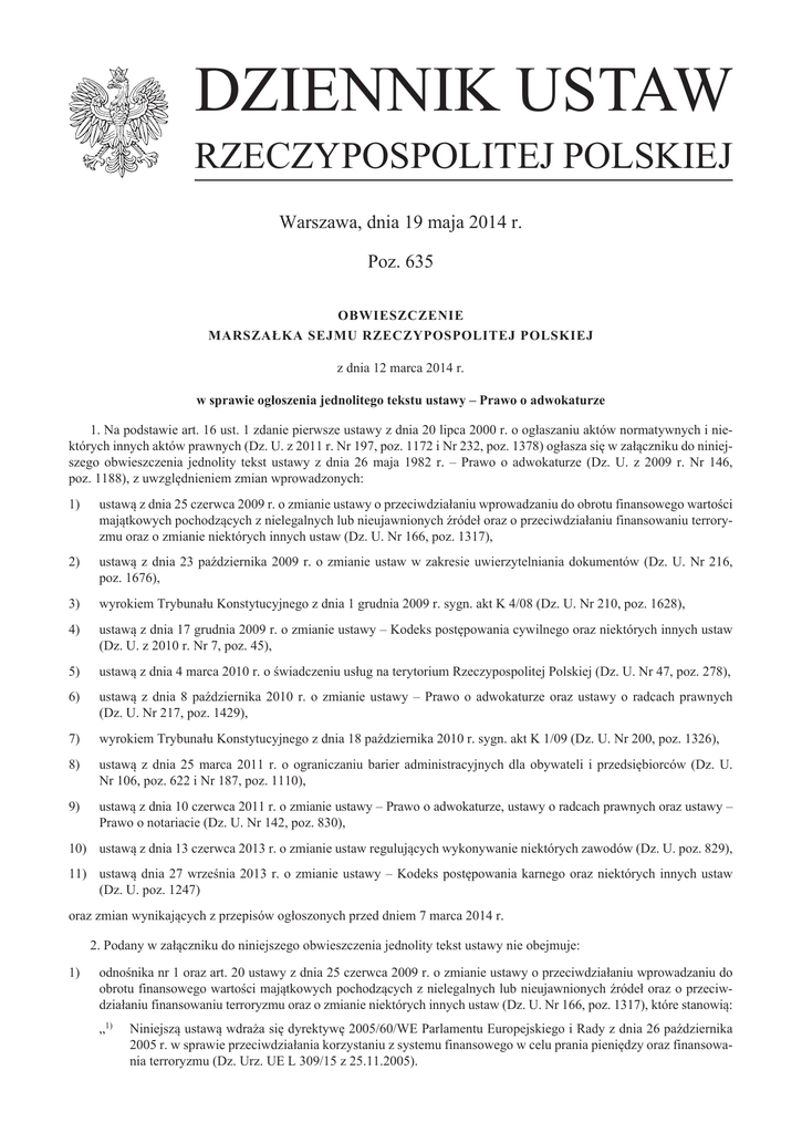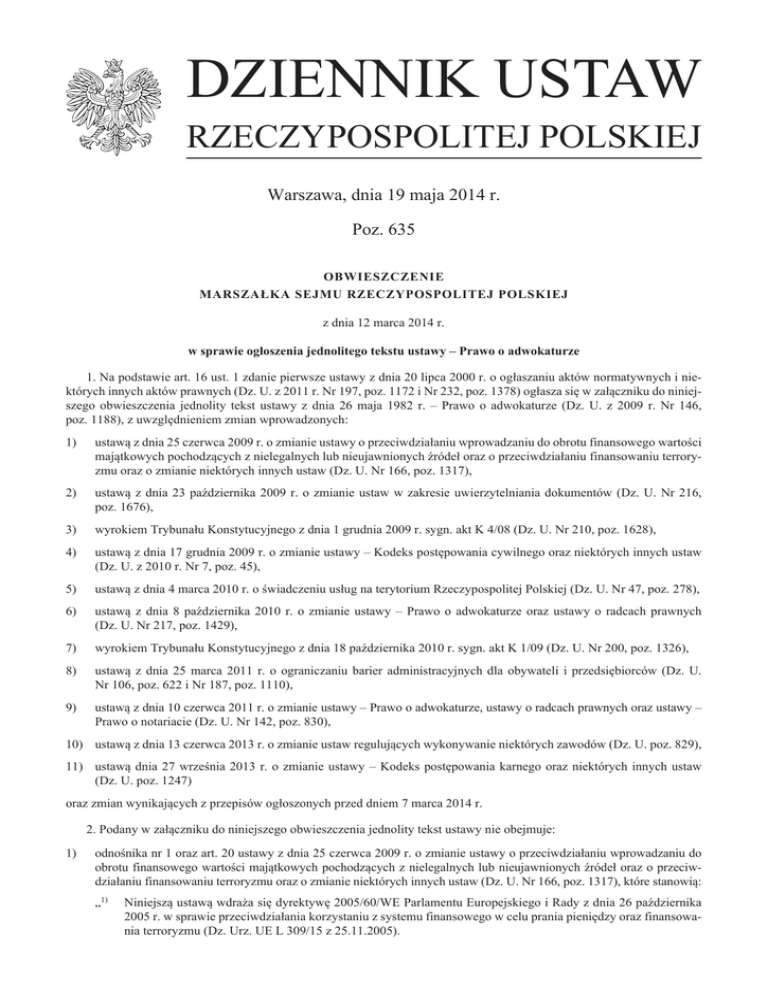 DZIENNIK USTAW RZECZYPOSPOLITEJ POLSKIEJ Warszawa, dnia 19 maja 2014 r. Poz. 635 OBWIESZCZENIE MARSZAŁKA SEJMU RZECZYPOSPOLITEJ POLSKIEJ z dnia 12 marca 2014 r. w sprawie ogłoszenia jednolitego tekstu ustawy – Prawo o adwokaturze 1. Na podstawie art. 16 ust. 1 zdanie pierwsze ustawy z dnia 20 lipca 2000 r. o ogłaszaniu aktów normatywnych i niektórych innych aktów prawnych (Dz. U. z 2011 r. Nr 197, poz. 1172 i Nr 232, poz. 1378) ogłasza się w załączniku do niniejszego obwieszczenia jednolity tekst ustawy z dnia 26 maja 1982 r. – Prawo o adwokaturze (Dz. U. z 2009 r. Nr 146, poz. 1188), z uwzględnieniem zmian wprowadzonych: 1)ustawą z dnia 25 czerwca 2009 r. o zmianie ustawy o przeciwdziałaniu wprowadzaniu do obrotu finansowego wartości majątkowych pochodzących z nielegalnych lub nieujawnionych źródeł oraz o przeciwdziałaniu finansowaniu terroryzmu oraz o zmianie niektórych innych ustaw (Dz. U. Nr 166, poz. 1317), 2)ustawą z dnia 23 października 2009 r. o zmianie ustaw w zakresie uwierzytelniania dokumentów (Dz. U. Nr 216, poz. 1676), 3)wyrokiem Trybunału Konstytucyjnego z dnia 1 grudnia 2009 r. sygn. akt K 4/08 (Dz. U. Nr 210, poz. 1628), 4)ustawą z dnia 17 grudnia 2009 r. o zmianie ustawy – Kodeks postępowania cywilnego oraz niektórych innych ustaw (Dz. U. z 2010 r. Nr 7, poz. 45), 5)ustawą z dnia 4 marca 2010 r. o świadczeniu usług na terytorium Rzeczypospolitej Polskiej (Dz. U. Nr 47, poz. 278), 6)ustawą z dnia 8 października 2010 r. o zmianie ustawy – Prawo o adwokaturze oraz ustawy o radcach prawnych (Dz. U. Nr 217, poz. 1429), 7)wyrokiem Trybunału Konstytucyjnego z dnia 18 października 2010 r. sygn. akt K 1/09 (Dz. U. Nr 200, poz. 1326), 8)ustawą z dnia 25 marca 2011 r. o ograniczaniu barier administracyjnych dla obywateli i przedsiębiorców (Dz. U. Nr 106, poz. 622 i Nr 187, poz. 1110), 9)ustawą z dnia 10 czerwca 2011 r. o zmianie ustawy – Prawo o adwokaturze, ustawy o radcach prawnych oraz ustawy – Prawo o notariacie (Dz. U. Nr 142, poz. 830), 10)ustawą z dnia 13 czerwca 2013 r. o zmianie ustaw regulujących wykonywanie niektórych zawodów (Dz. U. poz. 829), 11)ustawą dnia 27 września 2013 r. o zmianie ustawy – Kodeks postępowania karnego oraz niektórych innych ustaw (Dz. U. poz. 1247) oraz zmian wynikających z przepisów ogłoszonych przed dniem 7 marca 2014 r. 2. Podany w załączniku do niniejszego obwieszczenia jednolity tekst ustawy nie obejmuje: 1)odnośnika nr 1 oraz art. 20 ustawy z dnia 25 czerwca 2009 r. o zmianie ustawy o przeciwdziałaniu wprowadzaniu do obrotu finansowego wartości majątkowych pochodzących z nielegalnych lub nieujawnionych źródeł oraz o przeciwdziałaniu finansowaniu terroryzmu oraz o zmianie niektórych innych ustaw (Dz. U. Nr 166, poz. 1317), które stanowią: „1)Niniejszą ustawą wdraża się dyrektywę 2005/60/WE Parlamentu Europejskiego i Rady z dnia 26 października 2005 r. w sprawie przeciwdziałania korzystaniu z systemu finansowego w celu prania pieniędzy oraz finansowania terroryzmu (Dz. Urz. UE L 309/15 z 25.11.2005). Dziennik Ustaw –2– Poz. 635 Niniejszą ustawą zmienia się ustawę z dnia 26 maja 1982 r. – Prawo o adwokaturze, ustawę z dnia 6 lipca 1982 r. o radcach prawnych, ustawę z dnia 14 lipca 1983 r. o narodowym zasobie archiwalnym i archiwach, ustawę z dnia 14 lutego 1991 r. – Prawo o notariacie, ustawę z dnia 28 września 1991 r. o kontroli skarbowej, ustawę z dnia 13 października 1995 r. o zasadach ewidencji i identyfikacji podatników i płatników, ustawę z dnia 5 lipca 1996 r. o doradztwie podatkowym, ustawę z dnia 6 czerwca 1997 r. – Kodeks karny, ustawę z dnia 29 sierpnia 1997 r. – Ordynacja podatkowa, ustawę z dnia 29 sierpnia 1997 r. – Prawo bankowe, ustawę z dnia 28 października 2002 r. o odpowiedzialności podmiotów zbiorowych za czyny zabronione pod groźbą kary, ustawę z dnia 14 lutego 2003 r. o udostępnianiu informacji gospodarczych, ustawę z dnia 22 maja 2003 r. o działalności ubezpieczeniowej oraz ustawę z dnia 29 lipca 2005 r. o obrocie instrumentami finansowymi.” „Art. 20. Ustawa wchodzi w życie po upływie 14 dni od dnia ogłoszenia, z wyjątkiem art. 1 pkt 21, który wchodzi w życie po upływie 12 miesięcy od dnia ogłoszenia.”; 2)art. 11 i art. 12 ustawy z dnia 23 października 2009 r. o zmianie ustaw w zakresie uwierzytelniania dokumentów (Dz. U. Nr 216, poz. 1676), które stanowią: „Art. 11. W sprawach wszczętych przed dniem wejścia w życie ustawy stosuje się, do czasu zakończenia postępowania w pierwszej instancji, dotychczasowe przepisy w zakresie uwierzytelniania dokumentów. Art. 12. Ustawa wchodzi w życie z dniem 1 stycznia 2010 r., z wyjątkiem art. 10, który wchodzi w życie z dniem 31 grudnia 2009 r.”; 3)art. 4 i art. 6 ustawy z dnia 17 grudnia 2009 r. o zmianie ustawy – Kodeks postępowania cywilnego oraz niektórych innych ustaw (Dz. U. z 2010 r. Nr 7, poz. 45), które stanowią: „Art. 4. 1. W sprawach wszczętych przed dniem wejścia w życie ustawy, do czasu zakończenia postępowania w danej instancji, stosuje się przepisy dotychczasowe, z zastrzeżeniem ust. 2. 2. Przepisy art. 95, art. 117–1191, art. 122, art. 124, art. 373, art. 39823, art. 829 pkt 8 ustawy, o której mowa w art. 1, art. 28 ust. 2 ustawy, o której mowa w art. 2, oraz art. 102 ust. 1, art. 105 ust. 1 i art. 112 ustawy, o której mowa w art. 3, w brzmieniu nadanym niniejszą ustawą, stosuje się z dniem wejścia w życie niniejszej ustawy.” „Art. 6. Ustawa wchodzi w życie po upływie 3 miesięcy od dnia ogłoszenia.”; 4)odnośnika nr 1 oraz art. 57 ustawy z dnia 4 marca 2010 r. o świadczeniu usług na terytorium Rzeczypospolitej Polskiej (Dz. U. Nr 47, poz. 278), które stanowią: „1)Niniejsza ustawa dokonuje w zakresie swojej regulacji wdrożenia dyrektywy 2006/123/WE Parlamentu Europejskiego i Rady z dnia 12 grudnia 2006 r. dotyczącej usług na rynku wewnętrznym (Dz. Urz. UE L 376 z