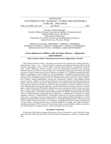 ANNALES UNIVERSITATIS MARIAE CURIE-SKŁODOWSKA LUBLIN - POLONIA VOL.LX, SUPPL. XVI, 654 SECTIO D 2005 Katedra i Zakład Radiologii1, Katedra i Klinika Chirurgii Naczyniowej, Ogólnej i Transplantacyjnej2, Akademii Medycznej we Wrocławiu Departament of Radiology1, Department of Vascular, General and Transplantological Surgery2, Medical University, Wrocław, Poland URSZULA ZALESKA- DOROBISZ1, ANDRZEJ T. DOROBISZ2, ELŻBIETA CZAPIGA1, VIOLETTA SOKOLSKA1, URSZULA KOŹMIŃSKA1, BOGUSLAWA BAŁTYCKA- UGORSKA1, KRZYSZTOF MOROŃ1 Acute abdomen in children with oncologic diseases – diagnostics and treatment Ostry brzuch u dzieci z chorobą nowotworową- diagnostyka i leczenie Ostre objawy brzuszne u dzieci z chorobami nowotworowymi stanowią duży problem kliniczny i diagnostyczny. Dzieci z tzw. „ostrym brzuchem” wymagają szczegółowej obserwacji klinicznej lub leczenia operacyjnego, często w trybie pilnym. Objawy ostrego brzucha są najczęściej wywołane przez czynniki infekcyjne- bakterie, grzyby, wirusy lub bezpośrednie naciekanie ścian przewodu pokarmowego przez nowotwór, mogą występować w każdej fazie choroby nowotworowej. Jako jedną z przyczyn ostrego brzucha coraz częściej wymienia się typhlitis [1,2]. Typhlitis jest poważnym powikłaniem występującym u dzieci będących w okresie neutropenii w przebiegu leczenia białaczek, chłoniaków, anemii aplastycznej, po przeszczepach szpiku kostnego. Częstość występowania i patogeneza schorzenia nie są dokładnie poznane [2,6]. Do czynników sprawczych zalicza się wpływ cytostatyków, sterydów, zakażeń bakteryjnych, wirusowych i grzybiczych. Zmiany o typie typhlitis opisano również u dzieci z AIDS [1,2,3,4]. Przebieg kliniczny ostrych chorób jamy brzusznej najczęściej jest bardzo ciężki, gdyż dotyczy pacjentów onkologicznych z niewydolnością procesów odpornościowych. Poza typowymi objawami, jak nagły początek, ból, obrona mięśniowa i obecność objawów otrzewnowych charakteryzuje się gorączką septyczną, cechami niedrożności porażennej, obecnością wolnego płynu w jamie otrzewnowej. Prawidłowe ustalenie przyczyny zaburzeń jest bardzo ważne, gdyż decyduje o wyborze taktyki postępowania leczniczego i w wielu przypadkach pozwala uniknąć obciążającego i ryzykownego w tych stanach zabiegu chirurgicznego. W typhlitis obowiązuje leczenie zachowawcze i każda ingerencja chirurgiczna może zakończyć się niepomyślnie dla dziecka. W ostrym zapaleniu wyrostka, w niedrożnościach i perforacjach konieczne jest leczenie chirurgiczne. Podstawową rolę w rozpoznaniu przyczyn ostrego brzucha u dzieci odgrywa badanie radiologiczne i seryjne badania ultrasonograficzne wysokiej rozdzielczości z technikami dopplerowskimi. Celem pracy była analiza wyników badań obrazowych, ze szczególnym uwzględnieniem USG wysokiej rozdzielczości w ocenie dzieci z chorobą nowotworową, u których dodatkowo wystąpiły ostre objawy brzuszne i określenie przydatności USG w procesie różnicowania zmian, ocenie powikłań, wpływu na postawienie szybkiej diagnozy i podjęcie decyzji o wyborze postępowania leczniczego. MATERIAŁ I METODA W Pracowni USG Kliniki Chirurgii Pediatrycznej AM we Wrocławiu w latach 1999-2003 wykonano 245 badań USG jamy brzusznej u dzieci leczonych onkologicznie, u których wystąpiły dolegli388 wości bólowe brzucha. Przebadano 144 dziewczynek i 101 chłopców w wieku 1 m. ż. do 14 r. ż. (średnia wieku 7,3 lat). Wskazaniem do wykonania badania USG jamy brzusznej były przeważnie objawy tzw. ostrego brzucha, które wystąpiły u 133 dzieci, rzadziej niespecyficzne objawy, jak wymioty, biegunka, zaparcia, czy infekcje. Badania były wykonywane w trakcie leczenia onkologicznego, najczęściej chemioterapii, radioterapii lub po przeszczepach szpiku. W ostrym okresie choroby u każdego dziecka oznaczano parametry hematologiczne: Hb, liczbę erytrocytów, leukocytów, granulocytów i płytek krwi. Badania USG jamy brzusznej wykonano aparatem HDI 3500, głowicą 2- 5MHz, metodą B- mode i technikami dopplerowskimi: color Doppler (CD)), Power Doppler (PD) i DuplexDoppler. Dla lepszego uwidocznienia jelit, wyrostka robaczkowego, węzłów chłonnych i otrzewnej wykorzystywano głowicę liniową o częstotliwości 7- 12 MHz, stosując skalę szarości i opcje dopplerowskie. W USG określano grubość i strukturę ściany jelita, unaczynienie, obecność powiększonych węzłów chłonnych, kolekcje płynu, perystaltykę, nieprawidłowe ogniska poza ścianą jelita. U 14 dzieci wykonano tomografię komputerową (TK), u 5 magnetyczny rezonans (MR). U dzieci operowanych rozpoznanie ostateczne ustalano na podstawie oceny śródoperacyjnej i badania histopatologicznego, u dzieci leczonych zachowawczo na podstawie badań klinicznych, laboratoryjnych i kontrolnych badań USG. WYNIKI I OMÓWIENIE BADAŃ W badanej grupie 133 dzieci z objawami ostrego brzucha przeważały dzieci z ALL(ostra białaczka limfoblastyczna)- 92 i AML(ostra białaczka mielodysplastyczna)-16. Rodzaje chorób nowotworowych przedstawiono w tabeli1, najczęstsze przyczyny ostrego brzucha w tabeli 2 (Tabela1, Tabela2). Tabela 1. Rodzaj choroby nowotworowej u dzieci z ostrym brzuchem Lp. 1. 2. 3. 4. 5. 6. 7. Rodzaj nowotworu ALL AML Sarcoma Ewinga Osteosarcoma NHL HL Guzy lite Liczba(%) 92(69) 16(12) 3(2,5) 3(2,5) 8(6,5) 4(3) 4(3) Tabela 2. Przyczyny ostrego brzucha u dzieci z chorobą nowotworową Lp 1. 2. 3. 4. 5. 6. 7. 8. 9. 10 Rodzaj zmian Zapalenie niespecyficzne, krwotoczne żołądka Zapalenie niespecyficzne, krwotoczne jelita Zapalenie kątnicy (typhlitis) Zapalenie wyrostka robaczkowego Zapalenie trzustki Perforacja żołądka Perforacja jelita cienkiego Perforacja jelita grubego Ropnie Ostre zapalenie pęcherzyka żółciowego Liczba(%) 18(13,5) 53(39,5) 26(19,5) 12(9,5) 7(5,5) 2(1,5) 2(1,5) 4(3) 14(10,5) 7(5,5) Na podstawie analizy objawów klinicznych i wyników badań laboratoryjnych wyodrębniono dwie g