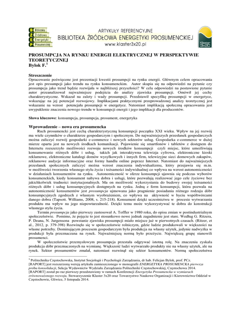 PROSUMPCJA NA RYNKU ENERGII ELEKTRYCZNEJ W PERSPEKTYWIE TEORETYCZNEJ Bylok F.1 Streszczenie Opracowanie po więcone jest prezentacji kwestii prosumpcji na rynku energii. Głównym celem opracowania jest opis presumpcji jako trendu na rynku konsumenckim. Autor skupia się na odpowiedzi na pytanie czy prosumpcja jako trend będzie rozwijała w najbliższej przyszło ci? W celu odpowiedzi na postawione pytanie autor przeanalizował najważniejsze podej cia do analizy zjawiska prosumpcji. Omówił jej cechy charakterystyczne. Wskazał na zalety i wady prosumpcji. Przedstawił specyfikę prosumpcji w energetyce, wskazując na jej potencjał rozwojowy. Implikacjami praktycznymi przeprowadzonej analizy teoretycznej jest wskazanie na wzrost potencjału prosumpcji w energetyce. Natomiast implikacją społeczną opracowania jest uwypuklenie znaczenia nowego trendu w konsumpcji energii i jego implikacji dla producentów. Słowa kluczowe: konsumpcja, prosumpcja, prosument, energetyka Wprowadzenie – nowa era prosumencka Ruch prosumencki jest cechą charakterystyczną konsumpcji początku XXI wieku. Wpływ na jej rozwój ma wiele czynników o charakterze gospodarczym i społecznym. Do najważniejszych przesłanek gospodarczych można zaliczyć rozwój gospodarki e-commerce i nowych sektorów usług. Gospodarka e-commerce w dużej mierze oparta jest na nowych rodkach komunikacji. Pojawienie się smartfonów i tabletów z dostępem do Internetu rozszerzyło możliwo ci rozwoju nowych rodków konsumpcji czyli miejsc, które umożliwiają konsumowanie różnych dóbr i usług, takich jak interaktywna telewizja cyfrowa, elektroniczne kioski reklamowe, elektroniczne katalogi domów wysyłkowych i innych firm, telewizyjne sieci domowych zakupów, reklamowe audycje informacyjne oraz formy handlu online poprzez Internet. Natomiast do najważniejszych przesłanek społecznych zaliczyć można wzrost znaczenia indywidualizmu, który przejawia się m.in. w możliwo ci tworzenia własnego stylu życia i tożsamo ci indywidualnej co wpływa na wzrost autonomiczno ci w działaniach konsumentów na rynku. Autonomiczno ć w sferze konsumpcji ujawnia się podczas wyborów konsumenckich, kiedy konsument nabywa dobra i usługi, które pozwalają realizować jego cele życiowe bez jakichkolwiek trudno ci instytucjonalnych. Ma on możliwo ć wykorzystania do budowy swojej tożsamo ci różnych dóbr i usług konsumpcyjnych dostępnych na rynku. Jedną z form konsumpcji, która pozwala na autonomiczno ć konsumentów jest prosumpcja ujmowana jako pragnienie posiadania różnego rodzaju dóbr konsumpcyjnych zgodnych z własnym wyobrażeniem, co wpływa na aktywno ć w byciu współtwórcami danego dobra (Tapsott. Williams, 2008, s. 215-218). Konsument dzięki uczestnictwu w procesie wytwarzania produktu ma wpływ na jego niepowtarzalno ć. Dzięki temu może wykorzystywać te dobra do konstrukcji własnego stylu życia. Termin prosumpcja jako pierwszy zastosował A. Toffler w 1980 roku, do opisu zmian w postindustrialnym społeczeństwie. Pomimo, że pojęcie to jest stosunkowo nowe jednak zagadnienie jest stare. Według G. Ritzera, P. Deana, N. Jurgensona powstanie zjawiska prosumpcji miało miejsce już w pierwotnych czasach. (Ritzer, et al., 2012, p. 379-398) Rozwinęło się w społeczeństwie rolniczym, gdzie ludzie produkowali w większo ci na własne potrzeby. Dominującym procesem gospodarczym była produkcja na własny użytek, jedynie nadwyżka w produkcji była przeznaczana na rynek. Najważniejszą normą było przeżycie. Największą grupę stanowili prosumenci. W społeczeństwie przemysłowym prosumpcja przestała odgrywać istotną rolę. Na znaczeniu zyskała produkcja dóbr przeznaczonych na wymianę. Większo ć ludzi wytwarzało produkty nie na własny użytek, ale na rynek. Sektor prosumentów zmalał, natomiast rozwinął się sektor konsumentów. Normą społeczeństwa Politechnika Częstochowska, Instytut Socjologii i Psychologii Zarządzania, dr hab. Felicjan Bylok, prof. PCz. [RAPORT] jest rozszerzoną wersją artykułu zamieszczonego w monografii ENERGETYKA PROSUMENCKA pierwsza próba konsolidacji, Sekcja Wydawnictw Wydziału Zarządzania Politechniki Częstochowskiej, Częstochowa 2014. [RAPORT] został po raz pierwszy przedstawiony w ramach Konferencji Energetyka Prosumencka w wymiarach zrównoważonego rozwoju, Stowarzyszenie Klaster 3x20 oraz Towarzystwo Naukowe Organizacji i Kierownictwa Oddział w Częstochowie, Gliwice, 5 listopada 2014. 1 przemysłowego stała się masowa konsumpcja. Pomimo dominacji wymiany rynkowej w życiu gospodarczym prosumpcja nie zanikła, jedynie zmieniła swój charakter. Występowała jako nieodpłatna praca np. praca gospodyni domowej, wychowywanie dzieci, itd. Stała się czę cią niewidoczną dla ekonomii. Renesans prosumpcji obserwujemy pod koniec XX wieku. Prosumpcja zmieniając swoją postać wyszła z ukrycia. Sprzyja temu procesowi przej cie od konsumenta pasywnego charakterystycznego dla społeczeństwa masowej konsumpcji, którego cechowała bierno ć, uleganie manipulacjom i zachowania ograniczone do spożycia do konsumenta aktywnego, który chce realizować indywidualne cele. Jedną z form jego aktywno ci jest prosumpcja, przejawiająca się w uczestnictwie w procesie produkcji zindywidualizowanego dobra konsumpcyjnego. W dużej mierze wzrost zachowań prosumenckich jest rezultatem indywidualizacji współczesnego społeczeństwa. Prosumpcja stała się jednym z możliwych sposobów wyrażenia własnej indywidualno ci. 1. Wokół pojęcia prosumpcja Twórcą pojęcia prosument jest A.Toffler, który odrzucił tradycyjną koncepcję biernego konsumenta, wskazując na rozwój aktywnego konsumenta, zaangażowanego w poszukiwaniu produktu najbardziej odpowiadającemu jego oczekiwaniom. W jego ujęciu prosument jest specyficznym podmiotem rynku, który zajmuje się produkcją na własny użytek (Toffler, 2006, s.306). W tym rozumieniu produkcja i konsum
