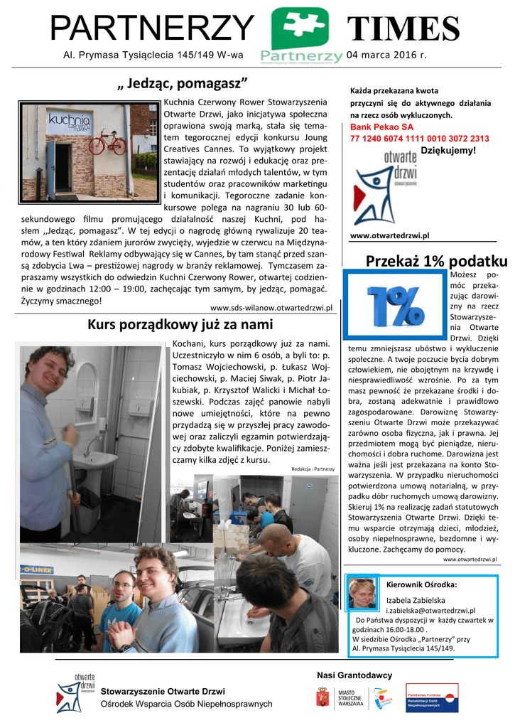 TIMES PARTNERZY Al. Prymasa Tysiąclecia 145/149 W -wa 04 marca 2016 r. „ Jedząc, pomagasz” Kuchnia Czerwony Rower Stowarzyszenia Otwarte Drzwi, jako inicjatywa społeczna oprawiona swoją marką, stała się tematem tegorocznej edycji konkursu Joung Creatives Cannes. To wyjątkowy projekt stawiający na rozwój i edukację oraz prezentację działań młodych talentów, w tym studentów oraz pracowników marketingu i komunikacji. Tegoroczne zadanie konkursowe polega na nagraniu 30 lub 60sekundowego filmu promującego działalność naszej Kuchni, pod hasłem ,,Jedząc, pomagasz”. W tej edycji o nagrodę główną rywalizuje 20 teamów, a ten który zdaniem jurorów zwycięży, wyjedzie w czerwcu na Międzynarodowy Festiwal Reklamy odbywający się w Cannes, by tam stanąć przed szansą zdobycia Lwa – prestiżowej nagrody w branży reklamowej. Tymczasem zapraszamy wszystkich do odwiedzin Kuchni Czerwony Rower, otwartej codziennie w godzinach 12:00 – 19:00, zachęcając tym samym, by jedząc, pomagać. Życzymy smacznego! www.sds-wilanow.otwartedrzwi.pl Kurs porządkowy już za nami Kochani, kurs porządkowy już za nami. Uczestniczyło w nim 6 osób, a byli to: p. Tomasz Wojciechowski, p. Łukasz Wojciechowski, p. Maciej Siwak, p. Piotr Jakubiak, p. Krzysztof Walicki i Michał Łoszewski. Podczas zajęć panowie nabyli nowe umiejętności, które na pewno przydadzą się w przyszłej pracy zawodowej oraz zaliczyli egzamin potwierdzający zdobyte kwalifikacje. Poniżej zamieszczamy kilka zdjęć z kursu. Redakcja : Partnerzy Każda przekazana kwota przyczyni się do aktywnego działania na rzecz osób wykluczonych. Bank Pekao SA 77 1240 6074 1111 0010 3072 2313 Dziękujemy! www.otwartedrzwi.pl Przekaż 1% podatku Możesz pomóc przekazując darowizny na rzecz Stowarzyszenia Otwarte Drzwi. Dzięki temu zmniejszasz ubóstwo i wykluczenie społeczne. A twoje poczucie bycia dobrym człowiekiem, nie obojętnym na krzywdę i niesprawiedliwość wzrośnie. Po za tym masz pewność że przekazane środki i dobra, zostaną adekwatnie i prawidłowo zagospodarowane. Darowiznę Stowarzyszeniu Otwarte Drzwi może przekazywać zarówno osoba fizyczna, jak i prawna. Jej przedmiotem mogą być pieniądze, nieruchomości i dobra ruchome. Darowizna jest ważna jeśli jest przekazana na konto Stowarzyszenia. W przypadku nieruchomości potwierdzona umową notarialną, w przypadku dóbr ruchomych umową darowizny. Skieruj 1% na realizację zadań statutowych Stowarzyszenia Otwarte Drzwi. Dzięki temu wsparcie otrzymają dzieci, młodzież, osoby niepełnosprawne, bezdomne i wykluczone. Zachęcamy do pomocy. www.otwartedrzwi.pl Kierownik Ośrodka: Izabela Zabielska [email protected] Do Państwa dyspozycji w każdy czwartek w godzinach 16.00-18.00 . W siedzibie Ośrodka „Partnerzy” przy Al. Prymasa Tysiąclecia 145/149. Nasi Grantodawcy Stowarzyszenie Otwarte Drzwi Ośrodek Wsparcia Osób Niepełnosprawnych Zbliża się czas rozliczenia Kochani, zostało niecałe 2 miesiące na to by wesprzeć Stowarzyszenie Otwarte Drzwi przekazując 1% na działalność naszych Ośrodków. By móc pomagać jak największej liczbie osób niepełnosprawnych oraz wykluczonych społecznie potrzebujemy Państwa wsparcia. Dlatego też kierujemy do Państwa nasze słowa, licząc na zrozumienie. pracownia Ceramiczna działająca w Ośrodku "Partnerzy" również przyłącza się do akcji. Poniżej fotorelacja. Jak na wesprzeć sprawdź na:http://1procent.otwartedrzwi.pl/ Pracownia Duży Pokój Niedawno gościliśmy w Pracowni Duży Pokój na wystawie fotografii Wojciecha Tuszko. Jest to jego pierwsza wystawa chociaż autor zdjęć ma już ponad dziewięćdziesiąt lat. Wcześniej zajmował się jednak tłumaczeniem książek o fotografii czy pracą w laboratoriach fotograficznych a zdjęcia robił dla siebie tworząc ogromne archiwum. Wnuk Wojciecha Tuszko opowiedział nam o pracach swojego dziadka i o działalności Pracowni Duży Pokój. Z tym miejscem związanych jest kilka organizacji samorządowych zajmujących się wieloma tematami np. sprawami Romów czy sytuacją na Białorusi . m Hamburgery domowej roboty W środę nasza Pracownia Umiejętności Życiowych zamieniła się w fast food - robiliśmy hamburgery domowej roboty. Pracy było mnóstwo - krojenie, siekanie, przygotowanie sosu, smażenie mięsa i wkładanie do bułek hamburgera i wszystkich dodatków. Składniki: 1 kg karkówki wieprzowej, 1 por, 1-2 łyżki klarowanego masła, 1 łyżka suszonego oregano, 1/2 ząbka czosnku, 1 łyżka oliwy, sól i pieprz, bułeczki hamburgerowe, sałata, pomidor, ser żółty, cebula. Sposób przygotowania: Odciąć zielone liście pora, pozostawić białą i jasnozieloną część. Przekroić wzdłuż na pół i. Osuszyć i pokroić na plasterki. Roztopić masło na patelni, dodać pory, szczyptę soli i mieszając od czasu do czasu zeszklić je przez około 10 minut nie rumieniąc.. Mięso pokroić na kawałki i zmielić z przygotowanym porem, natką pietruszki i czosnkiem. Doprawić suszonym oregano, solą i świeżo zmielonym pieprzem.. Do miski po mięsie wlać oliwę, brać kolejno w dłonie burgery i smarować je oliwą, odkładać na tackę. Rozgrzać dobrze dużą patelnię i położyć pierwszą partię burgerów. Smażyć na dużym ogniu przez około 4 minuty, następnie przełożyć na drugą stronę i smażyć kolejne 4 minuty Czas smażenia powinien być dopasowany do wielkości i grubości kotlecików. Bułeczki podgrzać, kroić na połówki i układać dodatki: sałatę, chili, pomidora, cebulę, burgera, ser. www. kwestiasmaku.com Beneficjenci w Kadrze Pan Adam Nazywam się Adam. W Ośrodku jestem drugi tydzień, na co dzień lubię słuchać muzyki i pisać wiersze. Lubię oglądać ciekawe oraz dobre i smutne filmy. Kocham zwierzęta. Lubię też zwiedzać ciekawe miejsca. Staram się pomagać ludziom, zwłaszcza tym mniej sprawnym ode mnie. Nie lubię jeśli ktoś krzywdzi zwierzęta. Sprawia mi t