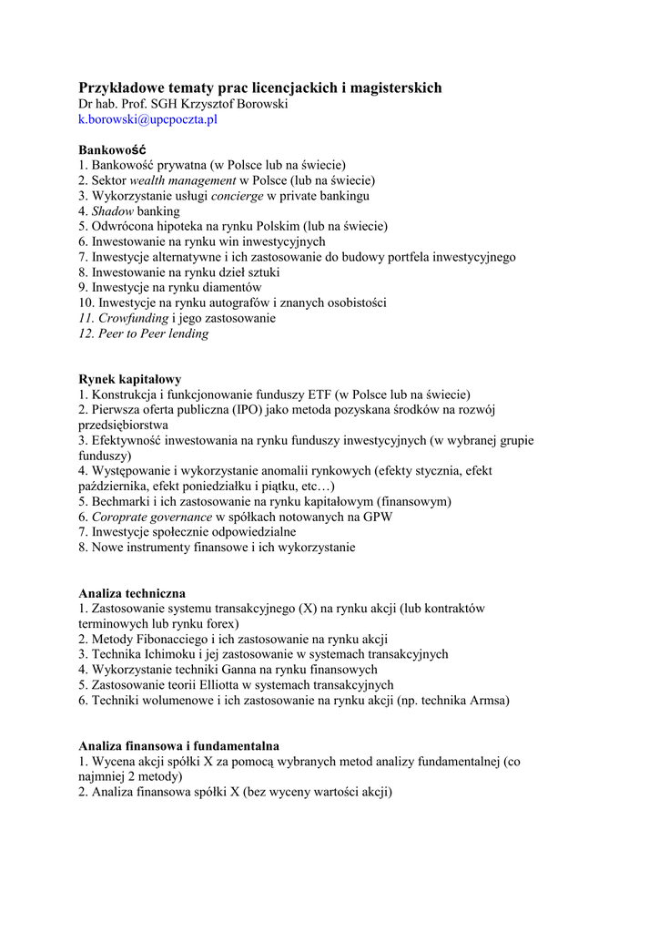 Przykładowe tematy prac licencjackich i magisterskich Dr hab. Prof. SGH Krzysztof Borowski [email protected] Bankowość 1. Bankowość prywatna (w Polsce lub na świecie) 2. Sektor wealth management w Polsce (lub na świecie) 3. Wykorzystanie usługi concierge w private bankingu 4. Shadow banking 5. Odwrócona hipoteka na rynku Polskim (lub na świecie) 6. Inwestowanie na rynku win inwestycyjnych 7. Inwestycje alternatywne i ich zastosowanie do budowy portfela inwestycyjnego 8. Inwestowanie na rynku dzieł sztuki 9. Inwestycje na rynku diamentów 10. Inwestycje na rynku autografów i znanych osobistości 11. Crowfunding i jego zastosowanie 12. Peer to Peer lending Rynek kapitałowy 1. Konstrukcja i funkcjonowanie funduszy ETF (w Polsce lub na świecie) 2. Pierwsza oferta publiczna (IPO) jako metoda pozyskana środków na rozwój przedsiębiorstwa 3. Efektywność inwestowania na rynku funduszy inwestycyjnych (w wybranej grupie funduszy) 4. Występowanie i wykorzystanie anomalii rynkowych (efekty stycznia, efekt października, efekt poniedziałku i piątku, etc…) 5. Bechmarki i ich zastosowanie na rynku kapitałowym (finansowym) 6. Coroprate governance w spółkach notowanych na GPW 7. Inwestycje społecznie odpowiedzialne 8. Nowe instrumenty finansowe i ich wykorzystanie Analiza techniczna 1. Zastosowanie systemu transakcyjnego (X) na rynku akcji (lub kontraktów terminowych lub rynku forex) 2. Metody Fibonacciego i ich zastosowanie na rynku akcji 3. Technika Ichimoku i jej zastosowanie w systemach transakcyjnych 4. Wykorzystanie techniki Ganna na rynku finansowych 5. Zastosowanie teorii Elliotta w systemach transakcyjnych 6. Techniki wolumenowe i ich zastosowanie na rynku akcji (np. technika Armsa) Analiza finansowa i fundamentalna 1. Wycena akcji spółki X za pomocą wybranych metod analizy fundamentalnej (co najmniej 2 metody) 2. Analiza finansowa spółki X (bez wyceny wartości akcji) Rynek finansowy 1. Rynek kontraktów terminowych (lub opcji) w Polsce (lub w innych krajach). 2. Wybrane strategie opcyjne 3. Rynek kredytów hipotecznych w latach 2007 – do dzisiaj 4. Zarządzanie ryzykiem stopy procentowej przy wykorzystaniu wybranych instrumentów pochodnych (np. SWAP, CDS) 5. Kontrakt SWAP jako przykład instrumentu pochodnego 6. Zastosowanie wybranych elementów finansów behawioralnych na rynku akcji 7. Wykorzystanie efektu (tutaj nazwa efektu z finansów behawioralnych) na rynku akcji (czy teŜ rynku FX) 8. Model X (tutaj jego nazwa) i jego zastosowanie w finansach behawioralnych 9. Zarządzanie ryzykiem walutowym za pomocą wybranych instrumentów pochodnych 10. Wykorzystanie obligacji korporacyjnych do finansowania przedsiębiorstw 11. Agencje ratingowe i ich wpływ na wycenę premii za ryzyko na rynku obligacji korporacyjnych i rządowych 12. Krachy giełdowe i manie (np. Tulipmania czy Internetmania) 13. Kryzysy finansowe Rynek surowców 1. Inwestowanie na rynku złota 2. Inwestowanie na rynku wybranych metali szlachetnych (srebro, platyna) 3. Inwestowanie na rynku ropy naftowej 4. Inwestowanie na rynku produktów rolnych (np. pszenica, półtusze wieprzowe, kawa, kakao, etc.) Finanse behawioralne 1. Opis poszczególnych efektów z finansów behawioralnych jak np.: 1. Efekt kotwiczenia 2. Efekt okrągłych cen 3. Efekt „halo” 4. Efekt pewności siebie etc… 2. Anomalie rynkowe i ich wytłumaczenie za pomocą finansów behawioralnych 3. Efekt tłumu 4. Budowa portfela behawioralnego Absolutna nowość 1. Elementy rynku finansowego w filmie 2. Elementy tynku finansowego w literaturze
