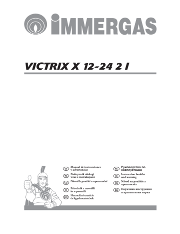 VICTRIX X 12-24 2 I ES Manual de instrucciones y advertencias RU «ÎÅɽɿÌͽÉÊÉ ØÅÌÊÆÎ»Í»ÑÃà PL Podręcznik obsługi wraz z instrukcjami IE Instruction booklet and warning SK Návod na použitie a upozornenia BG Наръчник инструкции и превентивни мерки CZ Návod k použití a upozornění SI Priročnik z navodili in o pozorili HU Használati utasítás és figyelmeztetések ES Apreciado Cliente, Felicitaciones por haber elegido Immergas. Esta caldera es un producto de alta calidad que le garantiza muchos años de bienestar y seguridad. Usted podrá contar con el apoyo de un Servicio Autorizado de Asistencia Técnica fiable y actualizado, capaz de mantener constante la eficiencia de la caldera. Lea atentamente este manual de instrucciones de uso: le brindará sugerencias útiles sobre el correcto uso del dispositivo, si las cumple, estará totalmente satisfecho con el producto que le brinda Immergas. Diríjase ya a su Centro Autorizado de Asistencia Técnica más cercano para pedir la prueba inicial de funcionamiento. Nuestro técnico controlará el funcionamiento, efectuará las regulaciones necesarias y le mostrará cómo utilizar el generador. Para cualquier necesidad de intervención o mantenimiento ordinario, diríjase a los Centros Autorizados Immergas: los cuales disponen de los componentes originales y del personal cualificado, puesto a su disposición directamente por el fabricante. Advertencias generales Este manual de instrucciones es una parte esencial del producto y debe entregarse al usuario, incluso en caso de cambio de propiedad. El mismo deberá conservarse con cuidado y consultarse atentamente, ya que contiene indicaciones de seguridad importantes para la fases de instalación, uso y mantenimiento. La instalación y el mantenimiento deben ser efectuados por personal cualificado que posea la competencia técnica que exige la ley y aplique las normas vigentes y las instrucciones del fabricante. Una instalación incorrecta puede causar daños a personas, animales y cosas por los que el fabricante no es responsable. El mantenimiento requiere personal técnico autorizado. El Servicio Autorizado de Asistencia Técnica Immergas es garantía de cualificación y profesionalidad. El equipo debe utilizarse sólo para los fines para los que ha sido diseñado. Cualquier otro uso se considera inadecuado y por tanto peligroso. El fabricante se exime de toda responsabilidad contractual o no contractual por eventuales daños y la garantía queda anulada, en caso de errores de instalación, uso o mantenimiento debidos al incumplimiento de la norma técnica y/o de las instrucciones del manual o del fabricante. Para obtener más información sobre la instalación de los generadores de calor con funcionamiento a gas consulte la página de Immergas: www.immergas.com DECLARACIÓN CE DE CONFORMIDAD De conformidad con la Directiva gas CE 90/396, la Directiva EMC CE 2004/108, la Directiva rendimientos CE 92/42 y la Directiva Baja Tensión 2006/95 CE. El fabricante: Immergas S.p.A. v. Cisa Ligure n° 95 42041 Brescello (RE) DECLARA QUE: las calderas Immergas modelo: Victrix X 12-24 2 I están en conformidad con dichas Directivas Comunitarias Mauro Guareschi Firma: Director de Investigación y Desarrollo PL Szanowny Kliencie, CZ Vážený zákazníku, Gratulujemy wyboru wysokiej jakości produktu Immergas, który na długi okres jest w stanie zapewnić Ci dobre samopoczucie i bezpieczeństwo. Jako Klient Immergas, będziesz mógł zawsze liczyć na pomoc wykwalifikowanego personelu Autoryzowanego Serwisu Technicznego, szkolonego w celu zagwarantowania nieustannej wydajności Twojego kotła. Prosimy przeczytać z uwagą poniższe strony: można w nich znaleźć przydatne wskazówki dotyczące prawidłowej eksploatacji urządzenia, których przestrzeganie potwierdzi satysfakcję z produktu Immergas. Prosimy o natychmiastowe zwrócenie się do naszego lokalnego Autoryzowanego Centrum Serwisowego z prośbą o dokonanie wstępnej kontroli działania. Nasz technik sprawdzi stan działania, dokona koniecznych regulacji kalibrowania i zademonstruje właściwą eksploatację generatora. W celu ewentualnych prac i regularnej konserwacji prosimy o zwrócenie się do Autoryzowanych Punktów Serwisowych Immergas: dysponują one oryginalnymi częściami i konkretnym przygotowaniem pod bezpośrednim nadzorem producenta. Ostrzeżenia ogólne Instrukcja obsługi stanowi integralną i istotną część produktu i będzie musiała zostać przekazana użytkownikowi również w przypadku przekazania własności. Należy się z nią uważnie zapoznać i zachować ją na przyszłość, ponieważ wszystkie uwagi w niej zawarte dostarczają ważnych wskazówek dotyczących bezpieczeństwa podczas instalacji, eksploatacji i konserwacji. Instalacja i konserwacja muszą zostać przeprowadzone zgodnie z obowiązującymi normami, według wskazówek producenta i przez wykwalifikowany personel, t.j. osoby posiadające konkretną wiedzę techniczną z zakresu instalacji. Niewłaściwa instalacja może być powodem obrażeń u osób i zwierząt oraz szkód na rzeczach, za które producent nie jest odpowiedzialny. Konserwacja musi zostać przeprowadzona przez wykwalifikowany personel techniczny, a Autoryzowany Punkt Serwisowy firmy Immergas jest w takim przypadku gwarancją kwalifikacji i profesjonalizmu. Urządzenie można wykorzystać wyłącznie do celu, dla którego zostało zaprojektowane. Jakiekolwiek inne użycie należy uważać za niewłaściwe i w konsekwencji niebezpieczne. W przypadku błędów podczas konstrukcji, eksploatacji lub prac konserwacyjnych, spowodowanych nieprzestrzeganiem obowiązującego prawodawstwa, przepisów lub instrukcji zawartych w niniejszej instrukcji (lub innych, dostarczonych przez producenta), producent uchyla się od jakiejkolwiek odpowiedzialności kontraktowej lub poza kontraktowej za powstałe szkody i gwarancja dotycząca urządzenia trac