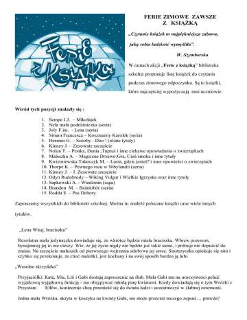 FERIE ZIMOWE ZAWSZE Z KSIĄŻKĄ „Czytanie książek to najpiękniejsza zabawa, jaką sobie ludzkość wymyśliła”. W. Szymborska W ramach akcji „Ferie z książką” biblioteka szkolna proponuje listę książek do czytania podczas zimowego odpoczynku. Są to książki, które najczęściej wypożyczają nasi uczniowie. Wśród tych pozycji znalazły się : 1. Sempe J.J. – Mikołajek 2. Nela mała podróżniczka (seria) 3. Joly F.iin. - Lena (seria) 4. Simon Francesca – Koszmarny Karolek (seria) 5. Herman G. – Scooby - Doo ! (różne tytuły) 6. Kinney J. – Zezowate szczęście 7. Nolan T. – Pestka, Dunia ,Tuptuś i inne ciekawe opowiadania o zwierzątkach 8. Maleszka A. – Magiczne Drzewo:Gra, Cień smoka i inne tytuły 9. Kwietniewska Talarczyk M. – Lusia, gdzie jesteś? i inne opowieści o zwierzętach 10. Thorpe K. – Pewnego razu w Nibylandii (seria) 11. Kinney J. – J. Zezowate szczęście 12. Odyn Rudobrody – Wiking Vulgar i Wielkie Igrzyska oraz inne tytuły 13. Sapkowski A. - Wiedźmin (saga) 14. Brandon M. – Baśniobór (seria) 15. Rodda E. – Pas Deltory Zapraszamy wszystkich do biblioteki szkolnej. Można tu znaleźć polecane książki oraz wiele innych tytułów. „Lena Witaj, braciszku” Rezolutna mała jedynaczka dowiaduje się, że wkrótce będzie miała braciszka. Wbrew pozorom, bynajmniej jej to nie cieszy. Wie, że jej życie nigdy nie będzie już takie samo, i próbuje nie dopuścić do zmian. Na szczęście maluszek od pierwszego wejrzenia zdobywa jej serce. Siostrzyczka opiekuje się nim i szybko się przekonuje, że choć maleńki, jest kochany i na swój sposób bardzo ją lubi. „Weselne skrzydeka” Przyjaciółki: Kate, Mia, Liii i Gabi dostają zaproszenie na ślub. Mała Gabi ma na uroczystości pełnić wyjątkową wyjątkową funkcję - ma obsypywać młodą parę kwiatami. Kiedy dowiadują się o tym Wróżki z Przystani Elfów, koniecznie chcą przenieść się do świata ludzi i uczestniczyć w ślubnej ceremonii. Jedna mała Wróżka, ukryta w koszyku na kwiaty Gabi, nie może przecież niczego zepsuć… prawda? „Nela na 3 kontynentach” Nela ma dziewięć lat i jest prawdopodobnie jedną z najmłodszych podróżniczek. Odkąd skończyła pięć lat podróżuje po świecie i nagrywa filmy. Odwiedziła już Etiopię, Zanzibar, Tanzanię, Kenię i Mauritius, Tajlandię, Kambodżę, Malezję, Indonezję, Filipiny, Wietnam, a ostatnio też Sri Lankę. W Ameryce Południowej podróżowała po Peru, Boliwii, Chile, a niedawno również po Kostaryce i Panamie. Jej idolem jest Steve Irwin.Przepiękne zdjęcia i pasjonujące historie zaciekawią nie tylko rówieśników Neli."Świat jest cudowny i oczami wyobraźni możesz podróżować ze mną oraz przeżywać wspaniałe przygody!" „Koszmarny Karolek” Strzeżcie się, Koszmarny Karolek znów atakuje! W każdym tomie czekają na Was koszmarne wybryki, złowrogie pomysły, odjazdowe ciekawostki oraz ulubione kawały Koszmarnego Karolka. „Baśniobór” Stowarzyszenie Gwiazdy Wieczornej nie ustaje w poszukiwaniu talizmanów. Kendra, pragnąca ze wszystkich sił powstrzymać Stowarzyszenie, dowiaduje się, gdzie jest klucz do skarbca, w którym ukryto jeden z nich. Aby go zdobyć, Rycerze Świtu muszą narazić się na śmiertelne niebezpieczeństwo przekroczyć próg smoczej świątyni. Misja się nie powiedzie, jeśli nikt nie zdobędzie się na kradzież świętego przedmiotu, zazdrośnie strzeżonego przez centaury. Chwileczkę, ale czy ktoś widział Setha? „Pas Deltory” Deltora to kraina magii i potworów. Tyrania nikczemnego Władcy Mroku w Deltorze dobiegła końca. On i wyczarowane przez niego kreatury zostali wygnani za góry. Jednak wielu mieszkańców Deltory nadal jest zniewolonych na Mrocznych Ziemiach, w przerażającym i tajemniczym królestwie wroga.Aby ich ocalić, Lief, Barda i Jasmine, bohaterowie wyprawy po Pas Deltory, muszą znaleźć broń potężną na tyle, aby pozwoliła pokonać Władcę Mroku na jego własnym terytorium.Podobno jedyną rzeczą, jakiej lęka się tyran, jest legendarna Pirrańska Piszczałka. Ale czy ona naprawdę istnieje? A jeśli tak, to jakim niebezpieczeństwom będą musieli stawić czoło przyjaciele, aby ją odszukać?