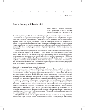 R e c e n z j e ETYKA 45, 2012 Dekonstruując mit kobiecości Betty Friedan, Mistyka kobiecości, przeł. Agnieszka Grzybek, Wydawnictwo Czarna Owca, Warszawa 2012 Po blisko pięćdziesięciu latach od amerykańskiego wydania, nakładem Wydawnictwa Czarna Owca, ukazała się na polskim rynku wydawniczym Mistyka kobiecości Betty Friedan. Książka, która zdemaskowała nabrzmiewającą podskórnie frustrację Amerykanek w rzeczywistości, w której kariera była zarezerwowana dla mężczyzn, a miejscem kobiety, bez względu na jej talenty czy pragnienia, była kuchnia. Praca Friedan artykułowała rosnące niezadowolenie i zagubienie kobiet wobec obowiązującego wzorca kobiecości, dostarczając impulsu, który przekształcił się w wielką falę społecznej i obyczajowej zmiany − dziś zwanej drugą falą feminizmu. Historyczna wartość tej książki jest niepodważalna. Betty Friedan miała szczęście wyrazić pewną prawdę o swoim społeczeństwie i czasie, uchwycić istotny aspekt doświadczenia kobiet Ameryki lat 50. i 60. Zarazem zaś jej praca rozpaliła iskrę przemian, które miały przeorganizować społeczną rzeczywistość, zdefiniować ją całkowicie na nowo. Polski przekład, autorstwa Agnieszki Grzybek, który otrzymujemy po tak długim czasie od pierwszego wydania, dostarczyć może pretekstu, by zastanowić się, na ile rozważania Friedan mogą być dla dzisiejszych czytelników i czytelniczek czymś więcej niż obowiązkową pozycją na liście lektur kursu „Wprowadzenie do feminizmu”. „Porzucić świat, zaszyć się w czterech ścianach” W 1920 roku, na mocy 19. poprawki do konstytucji, Amerykanki uzyskały wywalczone przez ruch feministyczny prawo do głosu. Wydawało się, że walki o w pełni egalitarne społeczeństwo, którego pragnęły sygnatariuszki deklaracji z Seneca Falls, nie da się już powstrzymać. Okres II wojny światowej był dla wielu kobiet czasem koniecznego usamodzielnienia, w którym przyjmowały na siebie obowiązki głowy rodziny i masowo wchodziły na rynek pracy. Jednak zaledwie w ciągu dekady od zakończenia wojny i powrotu 16 milionów weteranów z frontu, ów emancypacyjny pęd został zatrzymany. Zdawało się, że działać tu musiała jakaś potężna siła, która zdołała wepchnąć kobiety z powrotem do domu i zredukować ich świat, świat wyzwań, odpowiedzialności i samosprawstwa, który dopiero zaczął się przed nimi otwierać, do spraw związanych z prowadzeniem gospodarstwa domowego, troską o dzieci i dogadzaniem mężowi. Więcej nawet, siła ta sprawiła, że rola gospodyni domowej jawiła się samym kobietom jako ta, w której mogą w pełni urzeczywistnić swoje kobiece powołanie. Friedan siłę tę zdemaskowała i nazwała: oto właśnie „mistyka kobiecości”. „Mistyka kobiecości” stoi za wytworzeniem nowego wizerunku kobiety, który, zakorzeniwszy się w każdym niemal obszarze życia, stał się obowiązkowym, zdawało się 134 RECENZJE pozbawionym alternatywy wzorcem. Dziewiętnastowieczną amerykańską pionierkę, która u boku mężczyzny podejmuje trud wyprawy w nieznane, walczącą z niesprawiedliwością sufrażystkę, a nawet wesołą „dziewczynę pracującą” z lat 30., zastąpiła „matka niepracująca zawodowo”: wystrojona w pin‑upową sukienkę daje mężowi buziaka zanim ten wyjdzie do pracy, a ona poświęci się gotowaniu, ścieraniu kurzy, pielęgnacji ogrodu i zabawom z dziećmi. Tę sielankę Friedan bierze pod lupę, by dopatrzeć się pod pozorami idealnego, dostatniego, spełnionego życia pokładów lęku, znużenia i osamotnienia, tego „dziwnego, kłującego poczucia niezadowolenia, tęsknoty”1. Idealna pani domu macha mężowi na pożegnanie i wraca do domu, by umalowanymi ustami wziąć porządnego łyka z ukrytej gdzieś butelki whiskey i jakoś przetrwać kolejny dzień wypełniony powtarzalną, nudną i bezsensowną krzątaniną i poczuciem winy, że nie jest się ani szczęśliwą, ani idealną. Nieocenione są w Mistyce kobiecości analizy społecznych przeobrażeń, które obowiązujący ideał kobiecości wytwarzają. Friedan podąża tropem „mistyki kobiecości”, wykrywa logikę jej działania, przygląda się jej przejawom w dominujących teoriach dotyczących ról płciowych, w uniwersyteckich programach kształcenia, kobiecej prasie, reklamie, odkrywa jej źródła tkwiące w amerykańskich lękach i pragnieniach. W latach 50., nazywanych przez Amerykanów czasem niewinności, zagrożenia świata zewnętrznego, te obecne i te właśnie minione, spowodowały „wielką ucieczkę w prywatność”, ostoję tradycyjnych wartości, ciepła i bezpieczeństwa, której strzec miały kobiety. Rzut oka na statystyki pokazuje konsekwencje, jakie przyniosło działanie „mistyki kobiecości”, owo „wielkie zamknięcie”, któremu poddane zostały kobiety: w latach 60. większość kobiet, bo aż dwie trzecie Amerykanek2, nie pracowała poza domem, wiek zawierania związków małżeńskich radykalnie się obniżył (70% kobiet wychodziło za mąż przed ukończeniem 24. roku życia3), przyrost naturalny raptownie wzrósł: 60% kobiet rzucało studia w college’u, by wyjść za mąż lub z obawy, że zbyt gruntowne wykształcenie (sic!) uczyni je nieatrakcyjnymi w oczach mężczyzn4. Friedan diagnozuje zmiany, które dokonują się w życiu kobiet za sprawą „mistyki kobiecości”, opisuje, jak zawęża się horyzont ich pragnień i możliwości wyboru, jak stają się więźniarkami własnych domów, zakładniczkami potrzeb swoich mężów i dzieci. O ile starsze pokolenie, do którego należała Friedan i jej koleżanki – absolwentki prestiżowego Smith College – czują się niespełnione, tęskniąc za innym, pełniejszym życiem, o tyle wychowane w oparach „mistyki kobiecości” młode dziewczęta, nie potrafią nawet pomyśleć, że można żyć inaczej. Zamknięte w czterech ścianach, pozbawione jakichkolwiek intelektualnyc