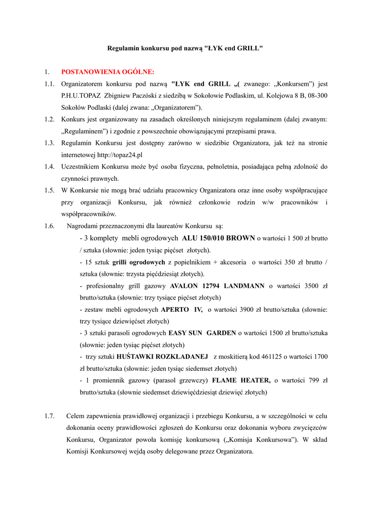 Regulamin konkursu pod nazwą "ŁYK end GRILL" 1. POSTANOWIENIA OGÓLNE: 1.1. Organizatorem konkursu pod nazwą "ŁYK end GRILL „( zwanego: „Konkursem”) jest P.H.U.TOPAZ Zbigniew Paczóski z siedzibą w Sokołowie Podlaskim, ul. Kolejowa 8 B, 08-300 Sokołów Podlaski (dalej zwana: „Organizatorem”). 1.2. Konkurs jest organizowany na zasadach określonych niniejszym regulaminem (dalej zwanym: „Regulaminem”) i zgodnie z powszechnie obowiązującymi przepisami prawa. 1.3. Regulamin Konkursu jest dostępny zarówno w siedzibie Organizatora, jak też na stronie internetowej http://topaz24.pl 1.4. Uczestnikiem Konkursu może być osoba fizyczna, pełnoletnia, posiadająca pełną zdolność do czynności prawnych. 1.5. W Konkursie nie mogą brać udziału pracownicy Organizatora oraz inne osoby współpracujące przy organizacji Konkursu, jak również członkowie rodzin w/w pracowników i współpracowników. 1.6. Nagrodami przeznaczonymi dla laureatów Konkursu są: - 3 komplety mebli ogrodowych ALU 150/010 BROWN o wartości 1 500 zł brutto / sztuka (słownie: jeden tysiąc pięćset złotych). - 15 sztuk grilli ogrodowych z popielnikiem + akcesoria o wartości 350 zł brutto / sztuka (słownie: trzysta pięćdziesiąt złotych). - profesionalny grill gazowy AVALON 12794 LANDMANN o wartości 3500 zł brutto/sztuka (słownie: trzy tysiące pięćset złotych) - zestaw mebli ogrodowych APERTO IV, o wartości 3900 zł brutto/sztuka (słownie: trzy tysiące dziewięćset złotych) - 3 sztuki parasoli ogrodowych EASY SUN GARDEN o wartości 1500 zł brutto/sztuka (słownie: jeden tysiąc pięćset złotych) - trzy sztuki HUŚTAWKI ROZKŁADANEJ z moskitierą kod 461125 o wartości 1700 zł brutto/sztuka (słownie: jeden tysiąc siedemset złotych) - 1 promiennik gazowy (parasol grzewczy) FLAME HEATER, o wartości 799 zł brutto/sztuka (słownie siedemset dziewięćdziesiąt dziewięć złotych) 1.7. Celem zapewnienia prawidłowej organizacji i przebiegu Konkursu, a w szczególności w celu dokonania oceny prawidłowości zgłoszeń do Konkursu oraz dokonania wyboru zwycięzców Konkursu, Organizator powoła komisję konkursową („Komisja Konkursowa”). W skład Komisji Konkursowej wejdą osoby delegowane przez Organizatora. 2. ZAŁOŻENIA KONKURSU: 2.1. Konkurs będzie trwał w dniach 21.04.2016 r. - 12.06.2016r. 2.2. Aby wziąć udział w konkursie „ŁYK end GRIL” należy zakupić w Sieci Sklepów TOPAZ produkty marek – KNORR, HELLMANN’S, TORTEX o wartości minimum 10 zł UWAGA!!!: zachować paragon. Następnie opracować hasło reklamujące produkty KNORR, HELLMANN` S, TORTEX (Zadanie Konkursowe) i wysłać je na adres e-mail: [email protected] wraz z imieniem, nazwiskiem, adresem zamieszkania, numeru telefonu, numeru paragonu oraz zgodą na publikację hasła w materiałach reklamowych firmy Topaz oraz Unilever. 2.3. Przystąpienie do Konkursu uzależnione jest od wyrażenia zgody przez Uczestnika na gromadzenie i przetwarzanie danych osobowych w zakresie, jakim jest to związane z udziałem w Konkursie oraz z prowadzeniem działalności handlowej przez Organizatora Konkursu i jego Partnerów handlowych. 3. ZASADY PROWADZENIA KONKURSU: 3.1. Organizator zamieści ogłoszenia o Konkursie, o których mowa w pkt 2.1 powyżej, informacje o zasadach Konkursu, nagrodach, oraz ramach czasowych Konkursu. 3.2. Uczestnicy Konkursu są identyfikowani przez Organizatora na podstawie adresu e-mail, z którego wysyłają zgłoszenia w Konkursie. 3.3. Konkurs będzie składał się z jednego etapu. 3.4. Konkurs polegać będzie na wykonaniu zadania konkursowego opisanego w ogłoszeniu o Konkursie oraz wysłaniu odpowiedzi pod adres e-mail [email protected] podany także w ogłoszeniach o Konkursie, o którym mowa w pkt. 2.1 niniejszego Regulaminu. Komisja Konkursowa wybierze najciekawsze, najbardziej pomysłowe i oryginalne hasło reklamujące produkty firmy UNILEVER (KNORR, HELLMANN`S, TORTEX). Nie ma znaczenia kolejność zgłoszeń. Termin nadsyłania zgłoszeń upłynie z dniem 12.06.2016 r.(Zamknięcie Zgłoszeń) 3.5. Po Zamknięciu Zgłoszeń, Komisja Konkursowa dokona wyłonienia Laureatów Konkursu (Rozstrzygnięcie Konkursu). 3.6. Wyłonieni przez Komisję Konkursową Laureaci w liczbie 27 zostaną poinformowani mailowo lub telefonicznie o wygranej, w ciągu 20 dni od Rozstrzygnięcia Konkursu. 3.7. Uczestnik zobowiązany jest do przesłania swoich pełnych danych osobowych zawierających: imię, nazwisko, adres, numer telefonu kontaktowego, numer paragonu i zgodę na publikację hasła w materiałach reklamowych Topaz oraz Unilever. 3.8 Nagrody wskazane w pkt. 1.6 zostaną przyznane po spełnieniu warunków określonych w niniejszym Regulaminie, w tym warunku, o którym mowa w pkt 4.3 poniżej, jeśli dotyczy. Jedna osoba może wziąć udział w Konkursie (rozwiązać zadanie konkursowe) dowolną ilość razy, jednak może wygrać tylko jedną nagrodę, niezależnie od ilości adresów e- mail, do których korzystania osoba taka jest uprawniona i z których to adresów korzystała w trakcie Konkursu. 3.9 Laureaci będą identyfikowani za pomocą adresu e-mail, imienia, nazwiska jak i adresu zamieszkania. W celu uniknięcia wątpliwości, osoba posługująca się różnymi adresami e-mail może być uprawniona tylko do jednej nagrody. Laureatami Konkursu nie mogą być jednocześnie krewni i powinowaci do drugiego stopnia powinowactwa, ani inne osoby zameldowane pod tym samym adresem lub przebywający pod tym samym adresem.W sytuacji, gdy Laureatami Konkursu zostaną ww. osoby, nagrodę otrzyma tylko Laureat, którego wiadomość e -mail ze zgłoszeniem do Konkursu została najszybciej odebrana, przez Organizatora, (wg rejestru Organizatora), natomiast nagroda dla drugiego uczestnika przechodzi na rzecz Organizatora. W przypadku gdyby wiadomości e- mail uczestników zostały odebrane przez Organizatora w identycznym czasie, Organizatorowi przysługuje prawo wyboru Laureata. 