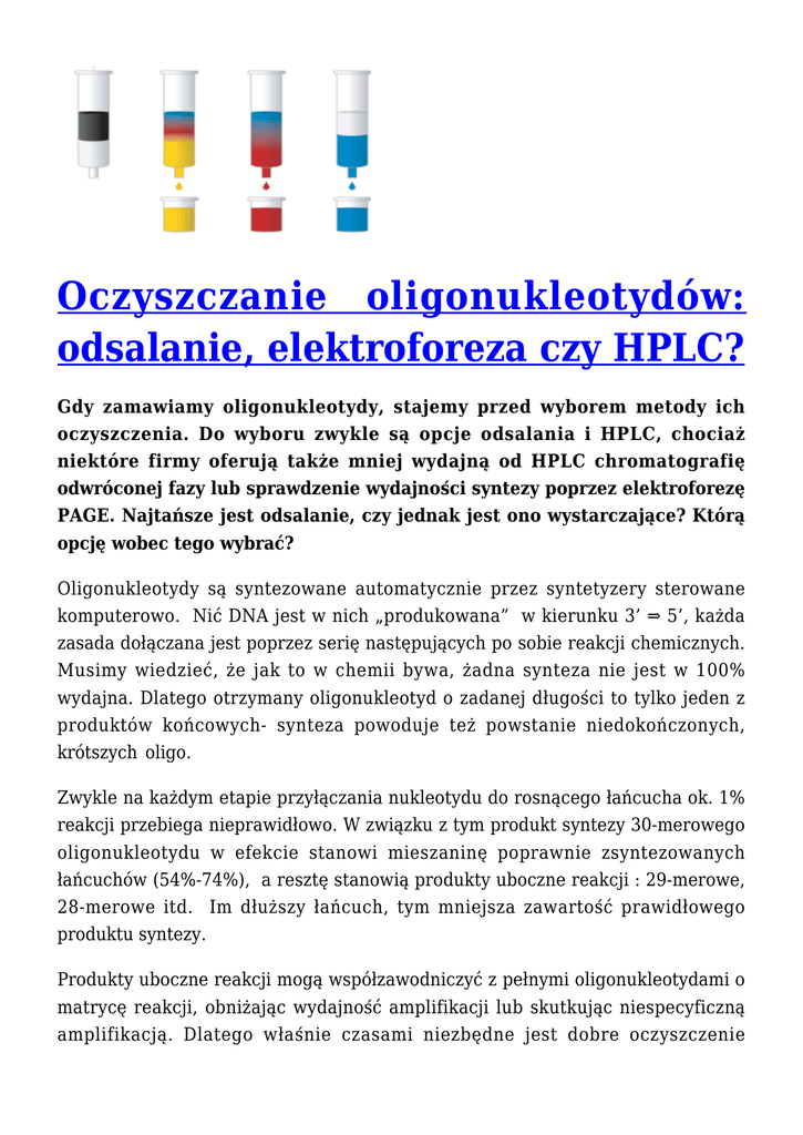 Oczyszczanie oligonukleotydów: odsalanie, elektroforeza czy HPLC? Gdy zamawiamy oligonukleotydy, stajemy przed wyborem metody ich oczyszczenia. Do wyboru zwykle są opcje odsalania i HPLC, chociaż niektóre firmy oferują także mniej wydajną od HPLC chromatografię odwróconej fazy lub sprawdzenie wydajności syntezy poprzez elektroforezę PAGE. Najtańsze jest odsalanie, czy jednak jest ono wystarczające? Którą opcję wobec tego wybrać? Oligonukleotydy są syntezowane automatycznie przez syntetyzery sterowane komputerowo. Nić DNA jest w nich „produkowana” w kierunku 3’ ⇒ 5’, każda zasada dołączana jest poprzez serię następujących po sobie reakcji chemicznych. Musimy wiedzieć, że jak to w chemii bywa, żadna synteza nie jest w 100% wydajna. Dlatego otrzymany oligonukleotyd o zadanej długości to tylko jeden z produktów końcowych- synteza powoduje też powstanie niedokończonych, krótszych oligo. Zwykle na każdym etapie przyłączania nukleotydu do rosnącego łańcucha ok. 1% reakcji przebiega nieprawidłowo. W związku z tym produkt syntezy 30-merowego oligonukleotydu w efekcie stanowi mieszaninę poprawnie zsyntezowanych łańcuchów (54%-74%), a resztę stanowią produkty uboczne reakcji : 29-merowe, 28-merowe itd. Im dłuższy łańcuch, tym mniejsza zawartość prawidłowego produktu syntezy. Produkty uboczne reakcji mogą współzawodniczyć z pełnymi oligonukleotydami o matrycę reakcji, obniżając wydajność amplifikacji lub skutkując niespecyficzną amplifikacją. Dlatego właśnie czasami niezbędne jest dobre oczyszczenie oligonukleotydu, jeżeli korzystamy np. z czułych metod allelospecyficznych, albo jeżeli potrzebne nam są sondy molekularne, lub długie oligo (>40pz). Istnieje pięć głównych metody oczyszczania: odsalanie, chromatografia odwróconej fazy („Cartdridge”) , wysokoprężna chromatografia cieczowa (HPLC), oczyszczanie żelowe na akrylamidzie (PAGE), oraz filtracja żelowa * Podczas odsalania roztwór oligonukleotydu jest przepuszczany przez prostą kolumnę chromatograficzną, z której odpłukiwane są sole, natomiast produkty uboczne syntezy nie są usuwane. Odsalanie jest standardowym wyborem dla starterów tradycyjnych PCR, oraz dla większości starterów do reakcji qPCR. * Metoda chromatografii odwróconej fazy w kardridżu wymywa oprócz soli także część produktów niespecyficznych, pozwalając na otrzymanie frakcji ok. 80-90% żądanego oligonukleotydu. Ustępuje skuteczności HPLC, zapewnia też niższy odzysk oligonukleotydu więc jest dobra tylko dla małych skal syntezy. Metoda nie ma zastosowania dla bardzo długich oligo (>50nt). * Wspomniana już wyżej technika HPLC to najwydajniejsza metoda oczyszczania (ale też najdroższa). Pozwala ona na oczyszczenie nawet dużych ilości oligonukleotydów w najwyższej skali syntezy, o dużej czystości (90-97%). Metoda tak jak poprzednia, nie ma zastosowania dla bardzo długich oligo (>50nt). * Rozdział żelowy PAGE jest jedynym skutecznym sposobem oczyszczania długich oligonukleotydów, którym nie podoła HPLC. Pozwala otrzymać bardzo czyste (do 99% czystości) oligonukleotydy, jednakże ma poważną wadę: niski odzysk z żelu znacząco zmniejsza ilość końcową czystego oligo. Tak oczyszcza się aptamery i krótkie konstrukty syntetyczne. * Sączenie żelowe jest metodą z wyboru dla konstruktów zawierających fofotioniany (tzw. s-oligo) w badaniach nad antysensem. Ma także zastosowanie dla wszelkich oligonukleotydów podawanych do hodowli komórkowych, ponieważ zapewnia najlepsze odpłukanie śladowych zanieczyszczeń chemicznych. Filtracja żelowa pozwala podobnie jak PAGE na oczyszczenie dużych fragmentów DNA. Jest wykorzystywana np. podczas oczyszczania sond do techniki FISH, doskonale wymywając niezwiązany z sondą barwnik. Marzena Wojtaszewska Chromatografia czy sączenie żelowe? wybór metody oczyszczania zależy od wielkości oligonukleotydu i zastosowań Źródło: Life Technologies SigmaAldrich Testujemy tanie polimerazy Specjalnie dla Was postanowiliśmy w naszym laboratorium przetestować tanie polimerazy, których cena wynosi około 50 groszy za 1U. Ku naszemu zaskoczeniu tanie polimerazy sprawdzają się bardzo dobrze w rutynowych oznaczeniach wykonywanych metodą PCR. Postanowiliśmy przetestować jakość nowego enzymu zawartego w polimerazach DNA pochodzącego z gatunku Pyrococcus furiosus, w odróżnieniu od najczęściej stosowanych enzymów, izolowanych z bakterii Thermus aquaticus. W celu porównania wydajności reakcji PCR, użyto dwóch rodzajów zestawów enzymów służących do przeprowadzania reakcji PCR: Paq5000 DNA Polymerase (Agilent Technologies) oraz PfuPlus! DNA Polymerase (EURx). Jako matrycy użyto 3 próbek DNA izolowanego z krwi obwodowej. Powstałe produkty PCR w dalszej kolejności miały zostać poddane sekwencjonowaniu. Reakcje PCR prowadzono w końcowej objętości mieszaniny reakcyjnej 50ul (w tym 2ul DNA) zgodnie z rekomendacjami producentów, ponadto skład mieszaniny PCR-mix oraz profil termiczny reakcji prowadzono również ściśle wg zaleceń producentów. Stosowano ten sam zestaw starterów o stężeniu końcowym 0,5uM a w celu optymalizacji PCR, reakcje prowadzono w gradiencie temperatur (50°C, 55°C oraz 60°C) w tym samym termocyklerze (Biometra). Po zakończonej reakcji, próbki rozdzielano elektroforetycznie w żelu agarozowym. W wyniku przeprowadzonych analiz stwierdzono, że produkty PCR (rycina) odpowiadające szukanemu fragmentowi są zasadniczo tej samej intensywności po zastosowaniu polimerazy firmy Agilent Technologies oraz EURx. We wszystkich 3 amplifikowanych próbkach pojawił się produkt PCR w temperaturach 50°C, 55°C i 60°C; w przypadku polimerazy Paq5000 DNA temperatura 50°C okazała się najbardziej optymalna, natomiast w przypadku PfuPlus!, zależności od próbki, temperatura 50°C lub 55°C wydaje się być optymalna – wymaga to dopracowania warunków reakcji l
