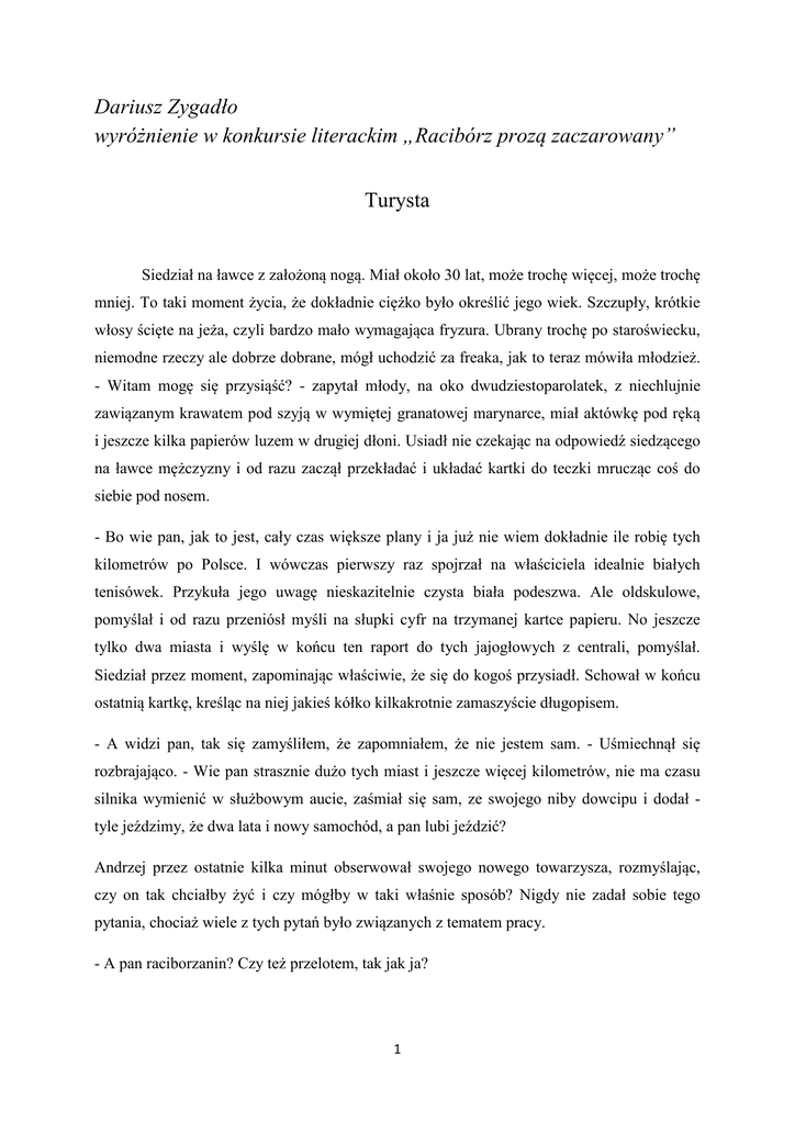Dariusz Zygadło wyróżnienie w konkursie literackim „Racibórz prozą zaczarowany” Turysta Siedział na ławce z założoną nogą. Miał około 30 lat, może trochę więcej, może trochę mniej. To taki moment życia, że dokładnie ciężko było określić jego wiek. Szczupły, krótkie włosy ścięte na jeża, czyli bardzo mało wymagająca fryzura. Ubrany trochę po staroświecku, niemodne rzeczy ale dobrze dobrane, mógł uchodzić za freaka, jak to teraz mówiła młodzież. - Witam mogę się przysiąść? - zapytał młody, na oko dwudziestoparolatek, z niechlujnie zawiązanym krawatem pod szyją w wymiętej granatowej marynarce, miał aktówkę pod ręką i jeszcze kilka papierów luzem w drugiej dłoni. Usiadł nie czekając na odpowiedź siedzącego na ławce mężczyzny i od razu zaczął przekładać i układać kartki do teczki mrucząc coś do siebie pod nosem. - Bo wie pan, jak to jest, cały czas większe plany i ja już nie wiem dokładnie ile robię tych kilometrów po Polsce. I wówczas pierwszy raz spojrzał na właściciela idealnie białych tenisówek. Przykuła jego uwagę nieskazitelnie czysta biała podeszwa. Ale oldskulowe, pomyślał i od razu przeniósł myśli na słupki cyfr na trzymanej kartce papieru. No jeszcze tylko dwa miasta i wyślę w końcu ten raport do tych jajogłowych z centrali, pomyślał. Siedział przez moment, zapominając właściwie, że się do kogoś przysiadł. Schował w końcu ostatnią kartkę, kreśląc na niej jakieś kółko kilkakrotnie zamaszyście długopisem. - A widzi pan, tak się zamyśliłem, że zapomniałem, że nie jestem sam. - Uśmiechnął się rozbrajająco. - Wie pan strasznie dużo tych miast i jeszcze więcej kilometrów, nie ma czasu silnika wymienić w służbowym aucie, zaśmiał się sam, ze swojego niby dowcipu i dodał tyle jeździmy, że dwa lata i nowy samochód, a pan lubi jeździć? Andrzej przez ostatnie kilka minut obserwował swojego nowego towarzysza, rozmyślając, czy on tak chciałby żyć i czy mógłby w taki właśnie sposób? Nigdy nie zadał sobie tego pytania, chociaż wiele z tych pytań było związanych z tematem pracy. - A pan raciborzanin? Czy też przelotem, tak jak ja? 1 - Tutaj mieszkam. Tutaj - jestem. Odezwał się po praz pierwszy Andrzej. Miał cichy, lekko ochrypnięty glos, jakby od dawna się nie odzywał. - To małe miasteczko, ja tutaj tylko sprzedaję, podpisuję a busikami chłopaki z transportu dowożą towar, wie pan jak to się kręci teraz w handlu? Zadał pytanie retoryczne. A pan co budżetówka, prywatny biznes? Teraz lato i jak pan do południa na ławce siedzi to pewnie urlopik, co? Praca jest ważna, ale nie tyle kilometrów, kręgosłup będę leczyć na starość od tego jeżdżenia a podobno kolejki po lekarzach teraz długie. - Jest tutaj coś ciekawego? - zapytał młody handlowiec, przeskakując na inny temat. - Co chciałbym pan wiedzieć, czy są atrakcje? Galerie, te prawdziwe, czy handlowe? Czy można się realizować, mieć marzenia, spełniać się zawodowo, rodzinnie, jakie są średnie zarobki i jaki poziom usług medycznych, to wszystko chce pan wiedzieć? - zapytał Andrzej, nie patrząc na rozmówcę, w końcu jednak obrócił powoli głowę, jakby w zwolnionym tempie i spojrzał mu prosto w oczy. - Ile masz czasu? - zapytał Andrzej, zmieniając ton na bardziej bezpośredni nie mrugnąwszy nawet powiekami. W tym momencie młody człowiek jakby zwolnił obroty, położył obie ręce równo na czarnej teczce i oparł się plecami o oparcie ławki. Dotychczas cały czas siedział lekko pochylony nad swoją teczką. - Mam - odpowiedział jednym słowem. To słowo, plus dziesięciocentymetrowy ruch tułowia do tyłu były znakiem, że młody w końcu zwolnił i zrozumiał w sekundzie, gdzie siedzi, koło kogo, w jakim konkretnie miejscu i o co właściwie pyta. Wcześniej potok słów wydobywał się automatycznie, jak gdyby jeszcze cały czas przekonywał klienta do podpisania umowy. Andrzej siedział cały czas nieruchomo, odwrócił tylko takim samym powolnym ruchem głowę na wprost i zaczął mówić. To jest normalne miasto, normalnych ludzi. Ja też podróżuję, choć w inny sposób, ale tylko tutaj mogę być prawdziwym turystą. Tylko turyści mogą zobaczyć tajemnice miasta, które mieszkańcy bardzo rzadko są wstanie dostrzec. Czasami dzieje się to przypadkiem, czasami pamiętają coś z dzieciństwa, gdy jeszcze dziwił ich szczegół, faktura, perspektywa. Teraz wszyscy starzejąc się biegną. Czasami syndrom turysty daje jeszcze o sobie znać, gdy biegają z przewodnikiem po miastach, szukając w ujęciach obiektywu dokładnie tych samych scen, jakie były zamieszczone w folderach reklamowych ich wycieczki. Wtedy jeszcze są 2 wstanie coś zobaczyć, ale znowu czas i napięty program zabija nawet te momenty. Żeby poczuć miasto trzeba mieć czas, trzeba poczuć chwilę, zatrzymać się i odciąć od całego ruchu, trzeba zwolnić siebie, zmysły i zatrzymać również dane miejsce tylko dla siebie. Teraz wyszedłeś od klienta i widzisz tylko na „jedno spojrzenie”. To tylko kilka metrów jak dochodzisz do samochodu, potem może kilkadziesiąt jak włączasz się do ruchu i nie więcej. Bez żadnych szczegółów, bez detalu, widzisz tylko tyle, ile jest ci potrzebne, rejestrujesz w tle plamy nieokreślonych kolorów, nie czując ich odcieni. Nie zastawiasz się nad perspektywą ulicy, na której stoisz. To jest ulica Opawska, jedna z głównych ulic w Raciborzu. Tutaj są sklepy, firmy, usługi, park, normalne miasto ale tam kawałek za zakrętem, jak będziesz przejeżdżał koło placu Arki Bożka, na horyzoncie po lewej stronie można zobaczyć wieżowce przy ul. Słowackiego. Są jak żaglowce płynące po morzu zieleni, to wrażenie robią niewidoczne ogródki działkowe. Jest tylko zieleń i te samotne wieżowce. Tutaj jest tło, czyli patrzymy nie na „jedno spojrzenie”, ale na kilka do przodu. To, co wid