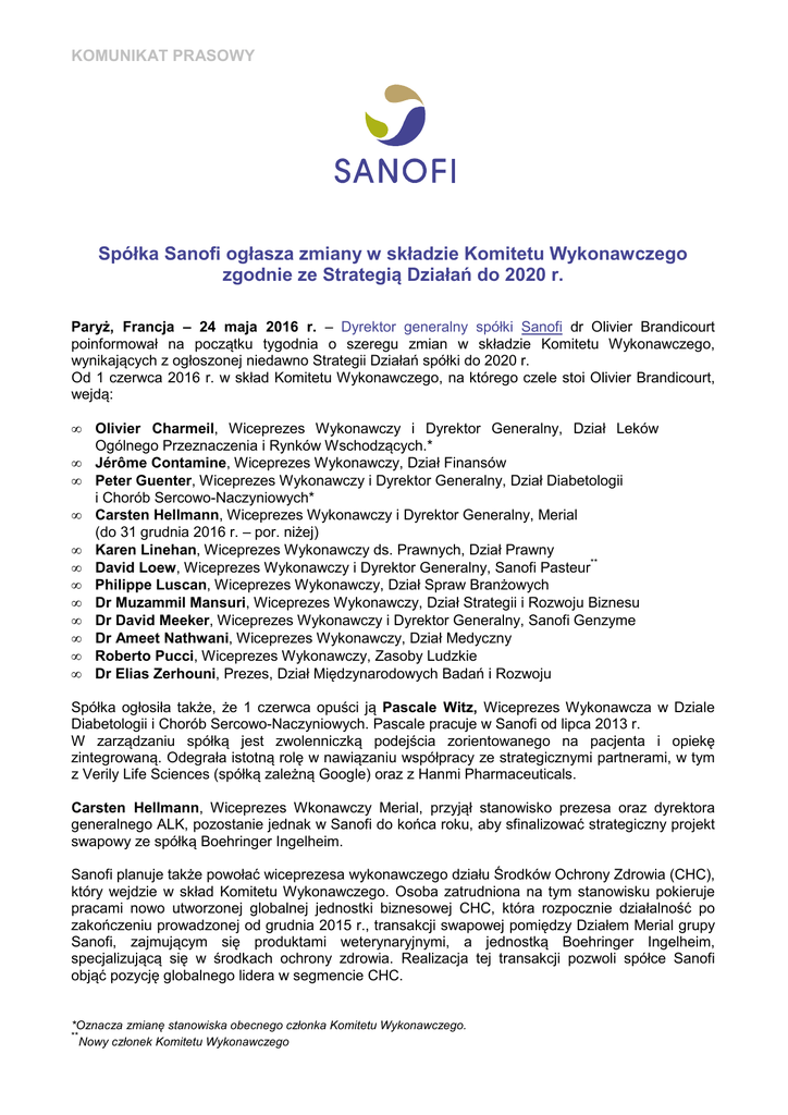 KOMUNIKAT PRASOWY Spółka Sanofi ogłasza zmiany w składzie Komitetu Wykonawczego zgodnie ze Strategią Działań do 2020 r. Paryż, Francja – 24 maja 2016 r. – Dyrektor generalny spółki Sanofi dr Olivier Brandicourt poinformował na początku tygodnia o szeregu zmian w składzie Komitetu Wykonawczego, wynikających z ogłoszonej niedawno Strategii Działań spółki do 2020 r. Od 1 czerwca 2016 r. w skład Komitetu Wykonawczego, na którego czele stoi Olivier Brandicourt, wejdą: • • • • • • • • • • • • Olivier Charmeil, Wiceprezes Wykonawczy i Dyrektor Generalny, Dział Leków Ogólnego Przeznaczenia i Rynków Wschodzących.* Jérôme Contamine, Wiceprezes Wykonawczy, Dział Finansów Peter Guenter, Wiceprezes Wykonawczy i Dyrektor Generalny, Dział Diabetologii i Chorób Sercowo-Naczyniowych* Carsten Hellmann, Wiceprezes Wykonawczy i Dyrektor Generalny, Merial (do 31 grudnia 2016 r. – por. niżej) Karen Linehan, Wiceprezes Wykonawczy ds. Prawnych, Dział Prawny David Loew, Wiceprezes Wykonawczy i Dyrektor Generalny, Sanofi Pasteur** Philippe Luscan, Wiceprezes Wykonawczy, Dział Spraw Branżowych Dr Muzammil Mansuri, Wiceprezes Wykonawczy, Dział Strategii i Rozwoju Biznesu Dr David Meeker, Wiceprezes Wykonawczy i Dyrektor Generalny, Sanofi Genzyme Dr Ameet Nathwani, Wiceprezes Wykonawczy, Dział Medyczny Roberto Pucci, Wiceprezes Wykonawczy, Zasoby Ludzkie Dr Elias Zerhouni, Prezes, Dział Międzynarodowych Badań i Rozwoju Spółka ogłosiła także, że 1 czerwca opuści ją Pascale Witz, Wiceprezes Wykonawcza w Dziale Diabetologii i Chorób Sercowo-Naczyniowych. Pascale pracuje w Sanofi od lipca 2013 r. W zarządzaniu spółką jest zwolenniczką podejścia zorientowanego na pacjenta i opiekę zintegrowaną. Odegrała istotną rolę w nawiązaniu współpracy ze strategicznymi partnerami, w tym z Verily Life Sciences (spółką zależną Google) oraz z Hanmi Pharmaceuticals. Carsten Hellmann, Wiceprezes Wkonawczy Merial, przyjął stanowisko prezesa oraz dyrektora generalnego ALK, pozostanie jednak w Sanofi do końca roku, aby sfinalizować strategiczny projekt swapowy ze spółką Boehringer Ingelheim. Sanofi planuje także powołać wiceprezesa wykonawczego działu Środków Ochrony Zdrowia (CHC), który wejdzie w skład Komitetu Wykonawczego. Osoba zatrudniona na tym stanowisku pokieruje pracami nowo utworzonej globalnej jednostki biznesowej CHC, która rozpocznie działalność po zakończeniu prowadzonej od grudnia 2015 r., transakcji swapowej pomiędzy Działem Merial grupy Sanofi, zajmującym się produktami weterynaryjnymi, a jednostką Boehringer Ingelheim, specjalizującą się w środkach ochrony zdrowia. Realizacja tej transakcji pozwoli spółce Sanofi objąć pozycję globalnego lidera w segmencie CHC. *Oznacza zmianę stanowiska obecnego członka Komitetu Wykonawczego. ** Nowy członek Komitetu Wykonawczego Suresh Kumar, dotychczasowy Wiceprezes Wykonawczy ds. Kontaktów Zewnętrznych z przyczyn osobistych zdecydował się wrócić do Stanów Zjednoczonych. Mając na uwadze amerykańską sytuację rynkową oraz zbliżające się wybory prezydenckie, Suresh zgodził się reprezentować interesy spółki Sanofi w Stanach Zjednoczonych do końca roku. Olivier Brandicourt będzie pełnił obowiązki szefa Działu Kontaktów Zewnętrznych do czasu znalezienia następcy Suresha na tym stanowisku. Informacje o firmie Sanofi Firma Sanofi, działający na skalę globalną lider sektora farmaceutycznego, zajmuje się odkrywaniem, opracowywaniem i upowszechnianiem rozwiązań terapeutycznych, które zaspokajają potrzeby pacjentów. Sanofi rozwija pozycję lidera w siedmiu głównych obszarach terapeutycznych: rozwiązania dla cukrzyków, szczepionki dla ludzi, innowacyjne leki, środki ochrony zdrowia, rynki wschodzące, zdrowie zwierząt oraz nowa spółka Genzyme. Firma Sanofi jest notowana na giełdach w Paryżu (EURONEXT: SAN) i Nowym Jorku (NYSE: SNY). Do Grupy Sanofi w Polsce należą: Sanofi-Aventis Sp. z o.o. – producent leków innowacyjnych i OTC (bez recepty), Sanofi Pasteur, największy na świecie producent szczepionek, Zentiva – lider produkcji leków generycznych w Europie Środkowo-Wschodniej, Nepentes Pharma, uznana spółka działająca w branży dermokosmetycznej, Genzyme, producent leków stosowanych w chorobach rzadkich oraz Merial, światowy lider w branży weterynaryjnej. Jedna z 112 fabryk Grupy Sanofi na świecie, jest zlokalizowana w Rzeszowie. Grupa Sanofi w Polsce zatrudnia ponad 1000 pracowników. Według danych IMS Health Polska, Grupa zajmuje jedno z wiodących miejsc w krajowym rankingu największych firm farmaceutycznych. Więcej informacji na: www.sanofi.pl; Dane kontaktowe: Relacje z mediami Jack Cox Tel. : +33 (0)1 53 77 46 46 [email protected] Relacje z inwestorami George Grofik Tel.: +33 (0)1 53 77 45 45 [email protected] Relacje z mediami w Polsce Monika Chmielewska-Żehaluk Dyrektor ds. Komunikacji Tel. +48 22 280 07 53 Tel.kom. +48 695 588 881 [email protected] 2/2