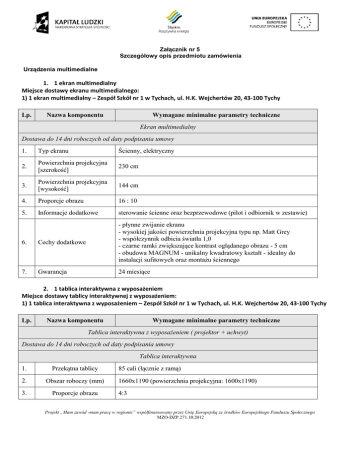 Załącznik nr 5 Szczegółowy opis przedmiotu zamówienia Urządzenia multimedialne 1. 1 ekran multimedialny Miejsce dostawy ekranu multimedialnego: 1) 1 ekran multimedialny – Zespół Szkół nr 1 w Tychach, ul. H.K. Wejchertów 20, 43-100 Tychy Lp. Nazwa komponentu Wymagane minimalne parametry techniczne Ekran multimedialny Dostawa do 14 dni roboczych od daty podpisania umowy 1. Typ ekranu Ścienny, elektryczny 2. Powierzchnia projekcyjna [szerokość] 230 cm 3. Powierzchnia projekcyjna [wysokość] 144 cm 4. Proporcje obrazu 16 : 10 5. Informacje dodatkowe sterowanie ścienne oraz bezprzewodowe (pilot i odbiornik w zestawie) 6. Cechy dodatkowe - płynne zwijanie ekranu - wysokiej jakości powierzchnia projekcyjna typu np. Matt Grey - współczynnik odbicia światła 1,0 - czarne ramki zwiększające kontrast oglądanego obrazu - 5 cm - obudowa MAGNUM - unikalny kwadratowy kształt - idealny do instalacji sufitowych oraz montażu ściennego 7. Gwarancja 24 miesiące 2. 1 tablica interaktywna z wyposażeniem Miejsce dostawy tablicy interaktywnej z wyposażeniem: 1) 1 tablica interaktywna z wyposażeniem – Zespół Szkół nr 1 w Tychach, ul. H.K. Wejchertów 20, 43-100 Tychy Lp. Nazwa komponentu Wymagane minimalne parametry techniczne Tablica interaktywna z wyposażeniem ( projektor + uchwyt) Dostawa do 14 dni roboczych od daty podpisania umowy Tablica interaktywna 1. Przekątna tablicy 2. Obszar roboczy (mm) 3. Proporcje obrazu 85 cali (łącznie z ramą) 1660x1190 (powierzchnia projekcyjna: 1600x1190) 4:3 Projekt „Mam zawód -mam pracę w regionie” współfinansowany przez Unię Europejską ze środków Europejskiego Funduszu Społecznego MZO-DZP.271.10.2012 4. Technologia 5. Zgodność z systemami operacyjnymi 6. Podłączenie do komputera / zasilanie 7. Rozdzielczość 8. Dokładność 9. Prędkość odczytu współrzędnych 10. Powierzchnia tablicy 11. Wymiary tablicy (mm) 12. Waga tablicy (kg) 16,5 13. Waga łącznie z opakowaniem (kg) 28,5 14. Akcesoria standardowe 15. Gwarancja elektromagnetyczna pasywna Windows 2000/XP/32 bits Vista/7, Linux, MacOS port USB 8192x8192 (+/-) 0,05mm 260 współrzędnych na sekundę bardzo wytrzymała powierzchnia PVC 1750x1280x55 2 pisaki elektroniczne, kabel USB, uchwyt na pisaki, oprogramowanie, instrukcja obsługi w języku po 24 miesiące Projektor krótkoogniskowy 16. Technologia DLP 17. Rozdzielczość podstawowa XGA 1024x768 18. Rozdzielczość maksymalna Do UXGA 1600x1200 19. Jasność Min. 2500 lum. 20. Kontrast 3000:1 21. Ilość kolorów 1,07 mld kolorów 22. Korekta trapezu 40 stopni 23. Obsługa 3D Tak 24. Gniazdo HDMI tak 25. Żywotność lampy Do 5000 h 26. Format obrazu 4:3 (16:9 do wyboru) 27. Lampa 210 W 28. Głośnik 10W x 1 Projekt „Mam zawód -mam pracę w regionie” współfinansowany przez Unię Europejską ze środków Europejskiego Funduszu Społecznego MZO-DZP.271.10.2012 PC: Analog RGB: D-sub 15 pin x 2 USB connector: - Type A x1 (USB reader) - Type mini B x1 (USB display) 29. A/V: HDMI v 1.3 x1 S-Video: Mini Din 4 pin x 1 Composite Video: RCA x 1 Component Video: D-sub 15 pin x 1 (shared with analog RGB) Microphone: Stereo Mini Jack x1 Audio L/R : RCA x 2 Stereo Mini Jack x 1 Źródła wejściowe 30. Źródła wyjściowe PC: Monitor Out: D-sub 15 pin x 1 Audio: Wyjście Audio: Stereo Mini Jack x 1 31. Akcesoria standardowe (wysyłane wraz z projektorem) Instrukcja Szybkiego Uruchomienia Instrukcja obsługi na płycie CD Pilot/baterie Kabel VGA Kabel zasilający 32. Gwarancja Min. 24 miesięcy na projektor / 12 miesiecy na lampę (max. 2000h) Uchwyt sufitowy do projektora 33. Maksymalne obciążenie Maks. 11,5 kg 34. Regulowana odległość projektora od sufitu 42 - 65 cm 35. Możliwość pochylenia projektora +/- 15 stopni 3. 2 tablice interaktywne z wyposażeniem Miejsce dostawy tablic interaktywnych z wyposażeniem: 1) 2 tablice interaktywne z wyposażeniem – Zespół Szkół nr 4 w Tychach, al. Bielska 100, 43-100 Tychy Lp. Nazwa komponentu Wymagane minimalne parametry techniczne Tablica interaktywna z wyposażeniem ( projektor + uchwyt) Dostawa do 14 dni roboczych od daty podpisania umowy Tablica interaktywna 1. Przekątna tablicy przekątna wymiaru interaktywnego nie mniej niż 77 cali 192,5 cm Projekt „Mam zawód -mam pracę w regionie” współfinansowany przez Unię Europejską ze środków Europejskiego Funduszu Społecznego MZO-DZP.271.10.2012 2. Obszar interaktywny 3. Format 4. rozdzielczość 5. częstotliwość odczytu 6. tempo śledzenia sygnału 7. wymagany system operacyjny 8. wyposażenie 9. certyfikaty produktu 10. oprogramowanie tablicy 155,8 x 114,8 cm 4:3 8192×8192, 600 dpi 480 punktów/s 8m/s Windows XP/2003/Vista/7 32 i 64 bit, Linux, Mac 10.X, 2 bezkolorowe pióra interaktywne, gąbka, wskaźnik o dł. 100 cm, 1 kabel USB 5m, 1 płyta instalacyjna CD (zawierająca sterowniki, bibliotekę załączników oraz oprogramowanie), CE, FCC, ROHS, certyfikaty producenta: ISO9001, ISO14001 polska wersja językowa, Możliwości oprogramowania: obsługa obrazu ruchem ręki (przesuwanie, obracanie, zmiana rozmiaru), obsługa klawiatury ekranowej, rysowanie i dodawanie adnotacji (narzędzia: pióro, gumka, linia, kształty, edytowalne wypełnienia, kątomierz, oznakowanie odległości, etc.), rozpoznawania kształtów ( automatyczna zamiana odręcznych rysunków w poprawne figury geometryczne, rozpoznawanie pisma odręcznego i przekształcanie w edytowalny tekst), manipulacja obiektami (zaznaczanie obiektów, kopiowanie, wycinanie, wklejanie, klonowanie, usuwanie, obracanie, powiększanie, pomniejszanie, przenoszenie w obrębie jednej albo wielu stron, grupowanie, przewracanie w pionie i poziomie, scalanie z tłem i zamrażanie), wprowadzanie tekstu ( pisanie, wymazywanie, wklejanie, przeciąganie, przybliżanie i podświetlanie tekstu), wykonywanie zrzutów ekranu, zapisywanie grafik, nagrywanie i odtwarzanie ekranu (zapis czynności wykonywanych na ekranie w postaci pliku AVI, który może 