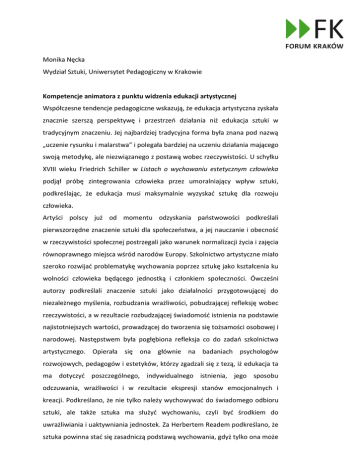 Monika Nęcka Wydział Sztuki, Uniwersytet Pedagogiczny w Krakowie Kompetencje animatora z punktu widzenia edukacji artystycznej Współczesne tendencje pedagogiczne wskazują, że edukacja artystyczna zyskała znacznie szerszą perspektywę i przestrzeń działania niż edukacja sztuki w tradycyjnym znaczeniu. Jej najbardziej tradycyjna forma była znana pod nazwą „uczenie rysunku i malarstwa” i polegała bardziej na uczeniu działania mającego swoją metodykę, ale niezwiązanego z postawą wobec rzeczywistości. U schyłku XVIII wieku Friedrich Schiller w Listach o wychowaniu estetycznym człowieka podjął próbę zintegrowania człowieka przez umoralniający wpływ sztuki, podkreślając, że edukacja musi maksymalnie wyzyskać sztukę dla rozwoju człowieka. Artyści polscy już od momentu odzyskania państwowości podkreślali pierwszorzędne znaczenie sztuki dla społeczeństwa, a jej nauczanie i obecność w rzeczywistości społecznej postrzegali jako warunek normalizacji życia i zajęcia równoprawnego miejsca wśród narodów Europy. Szkolnictwo artystyczne miało szeroko rozwijać problematykę wychowania poprzez sztukę jako kształcenia ku wolności człowieka będącego jednostką i członkiem społeczności. Ówcześni autorzy podkreślali znaczenie sztuki jako działalności przygotowującej do niezależnego myślenia, rozbudzania wrażliwości, pobudzającej refleksję wobec rzeczywistości, a w rezultacie rozbudzającej świadomość istnienia na podstawie najistotniejszych wartości, prowadzącej do tworzenia się tożsamości osobowej i narodowej. Następstwem była pogłębiona refleksja co do zadań szkolnictwa artystycznego. Opierała się ona głównie na badaniach psychologów rozwojowych, pedagogów i estetyków, którzy zgadzali się z tezą, iż edukacja ta ma dotyczyć poszczególnego, indywidualnego istnienia, jego sposobu odczuwania, wrażliwości i w rezultacie ekspresji stanów emocjonalnych i kreacji. Podkreślano, że nie tylko należy wychowywać do świadomego odbioru sztuki, ale także sztuka ma służyć wychowaniu, czyli być środkiem do uwrażliwiania i uaktywniania jednostek. Za Herbertem Readem podkreślano, że sztuka powinna stać się zasadniczą podstawą wychowania, gdyż tylko ona może sprawić, iż wyobrażenie i pojęcie, wrażenie i myśl wzajemnie sobie odpowiadają i łączą się w świadomości człowieka1. Według badacza wychowanie przez sztukę stanowi bardzo istotne wzbogacenie procesu wychowawczego o to, czego nie dostrzega tradycyjna pedagogika nastawiona na działania instrumentalne, pozbawione wyobraźni. Podkreślał rolę sztuki jako czynnika osobotwórczego. Wcześniej Stefan Szuman wskazał na podobieństwa, a wręcz analogie pomiędzy oddziaływaniem wychowawczym a wychowaniem przez sztukę. W wychowaniu estetycznym, określanym coraz częściej mianem „wychowanie przez sztukę”, można wyodrębnić dwie metody. Ze względu na cele i rodzaje działalności wychowawców i wychowanków Szuman określa te metody następująco: „pierwsza z nich polega na wychowywaniu i kształceniu odbiorców sztuki, którzy umieliby w sposób wnikliwy i pogłębiony percypować, rozumieć i przeżywać utwory wielkich artystów (architektów, rzeźbiarzy, malarzy, muzyków, powieściopisarzy, poetów itp.) i dzięki temu stali się zdolni odnosić się do sztuki z szacunkiem i miłością oraz z pragnieniem wnikliwego poznawania i przeżywania arcydzieł sztuki. Tą metodą wprowadzamy naszych wychowanków w świat kultury artystycznej i dajemy im możliwość korzystania z wartości i dóbr tej kultury. Druga z metod stosowanych w praktyce wychowania estetycznego jest całkiem inna. Polega ona na pobudzaniu, pielęgnowaniu i rozwijaniu twórczej aktywności wychowanków, bądź samorodnej i swobodnej, bądź też przez nas inicjowanej, kierowanej i rozwijanej”2. Podkreślił on jednak, że wychowanie przez sztukę nie ogranicza się do kształtowania upodobań estetycznych ani też do rozwijania wyobraźni i wyzwalania ekspresji twórczej – zakres tego wychowania jest znacznie szerszy, a strefa oddziaływań sztuki dotyczy całej osobowości jednostki, czyli „na wychowawczą funkcję sztuki składa się nie tylko estetyczna wartość dzieł sztuki i jej doznanie, lecz ponadto biorą w niej udział i inne, pozaestetyczne momenty ich treści, te mianowicie, które wywierają 1 H. Read, Wychowanie przez sztukę, Wrocław–Warszawa–Kraków–Gdańsk: Zakład Narodowy Imienia Ossolińskich Wydawnictwo Polskiej Akademii Nauk, 1976. 2 S. Szuman, O sztuce i wychowaniu estetycznym, Warszawa: Państwowe Zakłady Wydawnictw Szkolnych, 1969. 2 wpływ na kształtowanie społecznych, moralnych i światopoglądowych przekonań u odbiorców tych dzieł”3. Szuman we wszelkich oddziaływaniach w zakresie wychowania estetycznego wyodrębnia: udostępnianie i uprzystępnianie sztuki prowadzące do jej upowszechniania. Udostępnianie, czyli bezpośrednie obcowanie z dziełami sztuki, jest koniecznym warunkiem ich poznawania, doznawania i przeżywania. Uprzystępnianie polega na udzielaniu jeszcze niedoświadczonym odbiorcom pomocy w odkrywaniu, poznawaniu i odczuwaniu estetycznych cech i wartości utworów artystycznych, a funkcję pośrednika między dziełem sztuki a wychowankiem pełni wychowawca estetyczny. Upowszechnianie sztuki, jej szeroki i wnikliwy odbiór przez społeczeństwo decydują w rezultacie o kulturze danego społeczeństwa. Termin „sztuka” w nawiązaniu do „kultury” można być analizowany również na podstawie koncepcji pedagogicznych Bogdana Suchodolskiego, który postulował: „uspołecznienie kultury” (1937) i „wychowanie dla przyszłości” (1947–1968). Zdaniem Suchodolskiego w każdym procesie wychowania biorą udział trzej partnerzy: wychowawca, wychowanek oraz społeczno-kulturowy świat obiektywny, w którym obaj żyją i działają, wyznaczający im obu określone zadania i dokonując