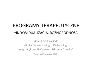 PROGRAMY TERAPEUTYCZNE -INDYWIDUALIZACJA, RÓŻNORODNOŚĆ Alicja Szewczyk Klinika Endokrynologii i Diabetologii Instytut „Pomnik-Centrum Zdrowia Dziecka” Warszawa 20 września 2014r . Edukacja jako ludzka rozmowa o życiu? Co to oznacza dla nas PIELĘGNIAREK? Potrzeby Problemy Radości, marzenia i nadzieja gdzie życie jest kontynuacją procesu edukacji Programy edukacyjne dla pacjentów z cukrzycą realizowane przez zespoły terapeutyczne to: podstawowy element postępowania terapeutycznego Sukces terapii zależy od: 1.Właściwego przygotowania Pacjenta do leczenia 2.Poznania motywacji chorego i jego opiekunów 3.Sesji edukacyjnych rozłożonych w czasie (istnieje wtedy realna możliwość przyswojenia wiedzy) Utworzenie Zespołu ds. Nauczania Cukrzycy Europejskiego Towarzystwa Badań nad Cukrzycą w 1979 roku miało na celu: 1. Rozwój różnych metod szkolenia chorych i dokonanie krytycznej analizy poszczególnych elementów tych metod 2. Rozpowszechnianie w krajach europejskich wśród lekarzy, pielęgniarek i dietetyków programów szkolenia dla chorych na cukrzycę Warszawa, dnia18 kwietnia 2012 r. OGŁOSZENIE Na podstawie art. 48 ust. 4 i ust. 5 ustawy z dnia 27 sierpnia 2004 r. o świadczeniach opieki zdrowotnej finansowanych ze środków publicznych (Dz. U. z 2008 r. Nr 164, poz. 1027, z późn. zm.), Minister Zdrowia ogłasza konkurs ofert na wybór realizatorów programu zdrowotnego pn.: „Narodowy Program Profilaktyki i Edukacji Diabetologicznej” na rok 2012. Cele i podstawowe elementy programu 1.Zwiększenie świadomości i wiedzy na temat cukrzycy wśród społeczeństwa, zmniejszenie występowania czynników ryzyka (zapobieganie występowania cukrzycy typu 2) 2.Stworzenie skutecznych strategii zapobiegania powikłaniom związanym z leczeniem cukrzycy oraz poprawa jakości życia osób chorych na cukrzycę Program składał się z następujących elementów: • działań o charakterze profilaktycznoinformacyjnym • działań polegających na szkoleniu z zakresu edukacji diabetologicznej dla pielęgniarek i położnych przygotowujących się do pracy na stanowisku edukatora ds. diabetologii • działań polegających na edukacji chorych na cukrzycę, ich rodzin oraz wybranych grup zawodowych Programy certyfikowane i opłacane przez państwo w Wielkiej Brytanii 1.DAFNE - Dose Adjustment for Normal Eating – Dostosowywanie Dawki dla Prawidłowego Odżywiania • DAFNE to sposób zarządzania cukrzycą typu 1 2. DESMOND - Diabetes Education and Self Management for Ongoing and Newly Diagnosed • Edukacja Cukrzycy i Samozarządzanie dla Istniejącej i Nowo zdiagnozowanej „Program edukacji pacjenta powinien być tworzony przy udziale chorego i jego lekarza oraz pozostawać w ścisłym związku i koordynacji z zalecanym sposobem leczenia cukrzycy. Pacjent jest aktywnym członkiem zespołu terapeutycznego” Rozdział 8 , A 13 „Zaleca się wprowadzenie nowych programów edukacyjnych o udokumentowanej skuteczności, potwierdzonej wynikami badań” Rozdział 8 , A 15 Propozycja PFED Diabetologiczna Porada Edukacyjna - odrębnie kontraktowane świadczenie w specjalistycznej (ambulatoryjnej i szpitalnej) opiece diabetologicznej u dzieci, młodzieży i dorosłych
