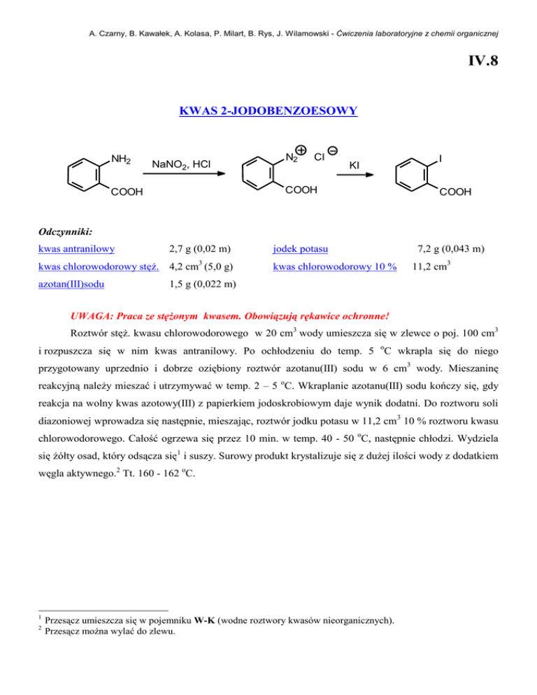 A. Czarny, B. Kawałek, A. Kolasa, P. Milart, B. Rys, J. Wilamowski - Ćwiczenia laboratoryjne z chemii organicznej IV.8 KWAS 2-JODOBENZOESOWY NH2 NaNO2, HCl N2 Cl KI COOH COOH I COOH Odczynniki: kwas antranilowy 2,7 g (0,02 m) kwas chlorowodorowy stęż. 4,2 cm3 (5,0 g) azotan(III)sodu jodek potasu kwas chlorowodorowy 10 % 7,2 g (0,043 m) 11,2 cm3 1,5 g (0,022 m) UWAGA: Praca ze stężonym kwasem. Obowiązują rękawice ochronne! Roztwór stęż. kwasu chlorowodorowego w 20 cm3 wody umieszcza się w zlewce o poj. 100 cm3 i rozpuszcza się w nim kwas antranilowy. Po ochłodzeniu do temp. 5 oC wkrapla się do niego przygotowany uprzednio i dobrze oziębiony roztwór azotanu(III) sodu w 6 cm3 wody. Mieszaninę reakcyjną należy mieszać i utrzymywać w temp. 2 – 5 oC. Wkraplanie azotanu(III) sodu kończy się, gdy reakcja na wolny kwas azotowy(III) z papierkiem jodoskrobiowym daje wynik dodatni. Do roztworu soli diazoniowej wprowadza się następnie, mieszając, roztwór jodku potasu w 11,2 cm3 10 % roztworu kwasu chlorowodorowego. Całość ogrzewa się przez 10 min. w temp. 40 - 50 oC, następnie chłodzi. Wydziela się żółty osad, który odsącza się1 i suszy. Surowy produkt krystalizuje się z dużej ilości wody z dodatkiem węgla aktywnego.2 Tt. 160 - 162 oC. 1 2 Przesącz umieszcza się w pojemniku W-K (wodne roztwory kwasów nieorganicznych). Przesącz można wylać do zlewu.