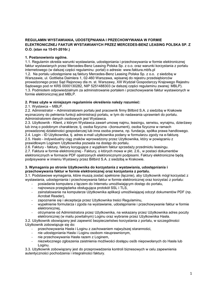 REGULAMIN WYSTAWIANIA, UDOSTĘPNIANIA I PRZECHOWYWANIA W FORMIE ELEKTRONICZNEJ FAKTUR WYSTAWIANYCH PRZEZ MERCEDES-BENZ LEASING POLSKA SP. Z O.O. (stan na 15-01-2016r.) 1. Postanowienia ogólne. 1.1. Regulamin określa warunki wystawiania, udostępniania i przechowywania w formie elektronicznej faktur wystawianych przez Mercedes-Benz Leasing Polska Sp. z o.o. oraz warunki korzystania z portalu internetowego (w dalszej części regulaminu: portal) o adresie: www.faktura.mbfs.pl 1.2. Na portalu udostępniane są faktury Mercedes-Benz Leasing Polska Sp. z o.o. z siedzibą w Warszawie, ul. Gottlieba Daimlera 1, 02-460 Warszawa, wpisanej do rejestru przedsiębiorców prowadzonego przez Sąd Rejonowy dla m. st. Warszawy, XIII Wydział Gospodarczy Krajowego Rejestru Sądowego pod nr KRS 0000130282, NIP 5251488303 (w dalszej części regulaminu zwanej: MBLP). 1.3. Podmiotem odpowiedzialnym za administrowanie portalem i przechowywanie faktur wystawionych w formie elektronicznej jest MBLP. 2. Przez użyte w niniejszym regulaminie określenia należy rozumieć: 2.1. Wystawca – MBLP. 2.2. Administrator – Administratorem portalu jest pracownik firmy Billbird S.A. z siedzibą w Krakowie wyznaczony do pełnienia funkcji administracji portalu, w tym do nadawania uprawnień do portalu. Administratorem danych osobowych jest Wystawca. 2.3. Użytkownik - Klient, z którym Wystawca zawarł umowę najmu, leasingu, serwisu, wynajmu, dzierżawy lub inną o podobnym charakterze, tj. osoba fizyczna –(konsument), osoba fizyczna w ramach prowadzonej działalności gospodarczej lub inna osoba prawna, np. fundacja, spółka prawa handlowego. 2.4. Login - ID Użytkownika, tj. adres e-mail użytkownika podany w formularzu zgody na e-fakturę. 2.5. Hasło - indywidualny ciąg znaków wprowadzony przez Użytkownika, który w powiązaniu z prawidłowym Loginem Użytkownika pozwala na dostęp do portalu. 2.6. Faktury - faktury, faktury korygujące z wyjątkiem faktur sprzedaży przedmiotu leasingu. 2.7. Faktura w formie elektronicznej - Faktury, o których mowa w pkt. 2.6., w postaci dokumentów elektronicznych w formacie PDF opatrzonych elektronicznymi podpisami. Faktury elektroniczne będą podpisywane w imieniu Wystawcy przez Billbird S.A. z siedzibą w Krakowie. 3. Wymagania po stronie Użytkownika do korzystania z wystawiania, udostępniania i przechowywania faktur w formie elektronicznej oraz korzystania z portalu. 3.1. Podstawowe wymagania, które muszą zostać spełnione (łącznie), aby Użytkownik mógł korzystać z wystawiania, udostępniania i przechowywania faktur w formie elektronicznej oraz korzystać z portalu: posiadanie komputera z łączem do Internetu umożliwiającym dostęp do portalu, najnowsza przeglądarka obsługująca protokół SSL i TLS, zainstalowanie na komputerze Użytkownika aplikacji umożliwiającej odczyt dokumentów PDF (np. Acrobat Reader), zapoznanie się i akceptacja przez Użytkownika treści Regulaminu, wypełnienie formularza i zgoda na wystawianie, udostępnianie i przechowywanie faktur w formie elektronicznej, otrzymanie od Administratora przez Użytkownika, na wskazany przez Użytkownika adres poczty elektronicznej (w mailu powitalnym) Loginu oraz wybranie przez Użytkownika Hasła. 3.2. Użytkownik obowiązany jest zapewnić bezpieczeństwo korzystania z portalu, w szczególności Użytkownik zobowiązuje się do: przechowywania Hasła i Loginu z zachowaniem najwyższej staranności, nie udostępniania Hasła i Loginu osobom nieuprawnionym, nie przechowywania Hasła razem z Loginem, niezwłocznego zgłoszenia zaistnienia możliwości dostępu osób niepowołanych do Hasła lub Loginu. 3.3. Użytkownik zobowiązany jest do przeprowadzenia kontroli biznesowych w celu zapewnienia autentyczności pochodzenia i integralności faktury. 1 4. Wyrażenie lub cofnięcie zgody na wystawianie, udostępnianie i przechowywanie faktur w formie elektronicznej 4.1 Wyrażenie zgody na wystawianie udostępnianie i przechowywanie faktur w formie elektronicznej może nastąpić poprzez: - wypełnienie formularza dostępnego na stronie www.faktura.mbfs.pl - przesłanie wypełnionego formularza na adres Mercedes-Benz Leasing Polska Sp. z o.o., ul. Gottlieba Daimlera 1, 02-460 Warszawa, - zaznaczenie odpowiedniej opcji podczas zawierania umowy leasingu, serwisu, najmu lub innej o podobnym charakterze. Po wyrażeniu zgody przez Użytkownika poprzez podpisanie formularza, Wystawca uzyskuje prawo do wystawiania, udostępniania i przechowywania faktur w formie elektronicznej, ale rozpoczęcie wykonywania powyższego rozpoczyna się nie później niż po 30 (trzydziestu) dniach licząc od dnia, w którym Wystawca otrzymał powiadomienie o wyrażeniu zgody lub aktywacji umowy i po przeprowadzeniu jej weryfikacji. 4.2. Użytkownik może cofnąć zgodę na udostępnianie i przechowywanie faktur w formie elektronicznej poprzez wydrukowanie, wypełnienie i podpisanie formularza „Oświadczenie o cofnięciu zgody na wystawianie, udostępnianie i przechowywanie faktur w formie elektronicznej”, który stanowi załącznik nr 1 do niniejszego Regulaminu oraz przesłanie formularza na adres Mercedes-Benz Leasing Polska Sp. z o.o. ul. Gottlieba Daimlera 1, 02-460 Warszawa, 4.3. Po cofnięciu przez Użytkownika zgody na wystawianie, udostępnianie i przechowywanie faktur w formie elektronicznej Użytkownik nadal posiada dostęp do wcześniej wystawionych faktur w formie elektronicznej przez okres 6 lat licząc od momentu, w którym zostały wystawione faktury w formie elektronicznej. 5. Dystrybucja faktur w formie elektronicznej na portalu. 5.1. Faktury w formie elektronicznej są udostępniane na portalu. 5.2. Użytkownik ma dostęp do wszystkich dokumentów. 5.3. Użytkownik po umieszczeniu faktury w formie elektronicznej na portalu otrzymuje na wskazany przez Użytkownika adres e-mail notyfikację o nowym dokumencie umieszczonym na portalu. 5.4. Za moment otrzymania przez Użytkownika eFaktury uznaje się