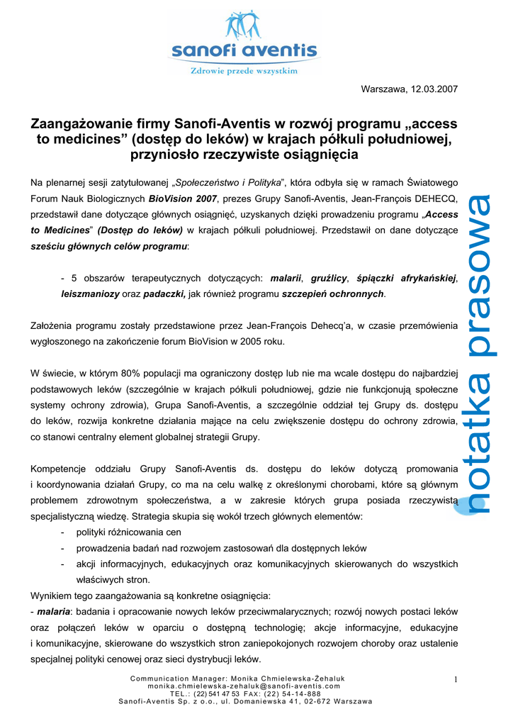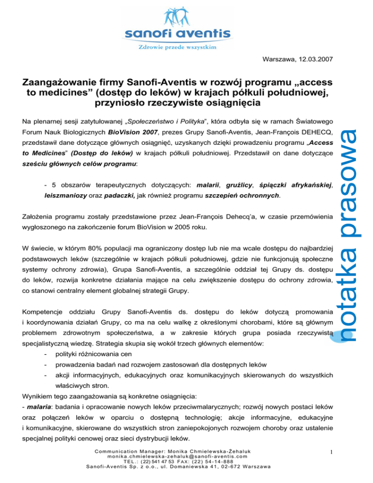 Warszawa, 12.03.2007 Zaangażowanie firmy Sanofi-Aventis w rozwój programu „access to medicines” (dostęp do leków) w krajach półkuli południowej, przyniosło rzeczywiste osiągnięcia Na plenarnej sesji zatytułowanej „Społeczeństwo i Polityka”, która odbyła się w ramach Światowego Forum Nauk Biologicznych BioVision 2007, prezes Grupy Sanofi-Aventis, Jean-François DEHECQ, przedstawił dane dotyczące głównych osiągnięć, uzyskanych dzięki prowadzeniu programu „Access to Medicines” (Dostęp do leków) w krajach półkuli południowej. Przedstawił on dane dotyczące sześciu głównych celów programu: - 5 obszarów terapeutycznych dotyczących: malarii, gruźlicy, śpiączki afrykańskiej, leiszmaniozy oraz padaczki, jak również programu szczepień ochronnych. Założenia programu zostały przedstawione przez Jean-François Dehecq’a, w czasie przemówienia wygłoszonego na zakończenie forum BioVision w 2005 roku. W świecie, w którym 80% populacji ma ograniczony dostęp lub nie ma wcale dostępu do najbardziej podstawowych leków (szczególnie w krajach półkuli południowej, gdzie nie funkcjonują społeczne systemy ochrony zdrowia), Grupa Sanofi-Aventis, a szczególnie oddział tej Grupy ds. dostępu do leków, rozwija konkretne działania mające na celu zwiększenie dostępu do ochrony zdrowia, co stanowi centralny element globalnej strategii Grupy. Kompetencje oddziału Grupy Sanofi-Aventis ds. dostępu do leków dotyczą promowania i koordynowania działań Grupy, co ma na celu walkę z określonymi chorobami, które są głównym problemem zdrowotnym społeczeństwa, a w zakresie których grupa posiada rzeczywistą specjalistyczną wiedzę. Strategia skupia się wokół trzech głównych elementów: - polityki różnicowania cen - prowadzenia badań nad rozwojem zastosowań dla dostępnych leków - akcji informacyjnych, edukacyjnych oraz komunikacyjnych skierowanych do wszystkich właściwych stron. Wynikiem tego zaangażowania są konkretne osiągnięcia: - malaria: badania i opracowanie nowych leków przeciwmalarycznych; rozwój nowych postaci leków oraz połączeń leków w oparciu o dostępną technologię; akcje informacyjne, edukacyjne i komunikacyjne, skierowane do wszystkich stron zaniepokojonych rozwojem choroby oraz ustalenie specjalnej polityki cenowej oraz sieci dystrybucji leków. Communication Manager: Monika Chmielewska-Żehaluk [email protected] T E L . : ( 22) 541 47 53 F A X : ( 2 2 ) 5 4 - 1 4 - 8 8 8 Sanofi-Aventis Sp. z o.o., ul. Domaniewska 41, 02-672 Warszawa 1 - gruźlica: rozwój nowych protokołów terapeutycznych oraz aktywny udział w programie TB Free w Republice Południowej Afryki, związanym z przegrupowaniem naszych możliwości ogólnoświatowej produkcji leków przeciwgruźliczych do tego kraju. - śpiączka afrykańska: odnowienie naszego partnerstwa ze Światową Organizacją Zdrowia, mającego na celu skoncentrowanie się na postawieniu właściwego rozpoznania oraz dostarczaniu leków. - leiszmanioza: udostępnienie leków z zastosowaniem zróżnicowanego systemu cen leków – „brak zysków – brak strat” – oraz centralizacja produkcji w Brazylii. - padaczka: rozpoczęcie w Mali programu szkoleniowego dla lekarzy rodzinnych/lekarzy pierwszego kontaktu w najbardziej odległych rolniczych zakątkach kraju, a następnie objęcie tym programem innych krajów. - szczepienia ochronne: dostarczenie szczepionek organizacjom międzynarodowym, w celu likwidacji choroby Heinego-Medina oraz uodpornieniu na żółtą gorączkę; kontynuacja programu badań nad gorączką denga; a także ustalenie polityki różnicowania cen leków w obrębie partnerstwa z Globalnym Sojuszem na rzecz Szczepionek i Szczepień (GAVI). „Te wszystkie inicjatywy zostały rozpoczęte dobrowolnie i są zgodne z historyczną spuścizną Grupy Sanofi-Aventis. Takie działanie jest naszym obowiązkiem jako dużej firmy na światowym rynku leków i szczepionek, a sprzyjają mu nasze umiejętności wprowadzania innowacji, konkurencyjne zakłady przemysłowe oraz gotowość do kontynuowanie produkcji większości z naszych długo obecnych na rynku, cechujących się wysoką jakością produktów” – powiedział Jean-François DEHECQ. „Również jako przedsiębiorstwo jesteśmy zobowiązani do wnoszenia naszego wkładu w rozwój ekonomiczny krajów półkuli południowej i robimy wszystko, co jest w naszej mocy, aby utrzymać pracę naszych zakładów w tych krajach. Obecnie przemysł farmaceutyczny walczy o swoją przyszłość, a jeśli nie sprosta wymaganiom, to nie wygra tej walki” – podsumował prezes. OPIS OSIĄGNIĘĆ A. Malaria Program Impact Malaria skupia się na czterech głównych obszarach: - Badaniach i opracowaniu nowych leków przeciwmalarycznych; - Rozwoju nowych postaci oraz połączeń leków już dostępnych; - Edukacji i szkoleniach pracowników ochrony zdrowia na wszystkich szczeblach; - Sieci dystrybucji i polityce cenowej, aby zapewnić łatwiejszy dostęp do leczenia. 1) Badania i opracowanie nowych leków przeciwmalarycznych Wiadomo, że pasożyt, który wywołuje malarię wykazuje dużą zdolność do rozwoju oporności w stosunku do wszystkich klasycznych leków stosowanych w leczeniu tej choroby. Jest to powodem Communication Manager: Monika Chmielewska-Żehaluk [email protected] T E L . : ( 22) 541 47 53 F A X : ( 2 2 ) 5 4 - 1 4 - 8 8 8 Sanofi-Aventis Sp. z o.o., ul. Domaniewska 41, 02-672 Warszawa 2 prowadzenia ciągłych badań nad rozwojem nowych leków – trwa wyścig z opornością. Celem tego programu badawczego zorganizowanego we współpracy z jednostkami uniwersyteckimi, a następnie prowadzonego w naszych własnych laboratoriach, jest pozostawanie na czele tego wyścigu. Działania te są w 100% finansowane przez Grupę. Przykładowo w 2003 roku rozpoczęliśmy program we współpracy z Uniwersytetem w Montpellier (Profesor H. Vial), mający na celu zbadanie właściwości grupy substancji